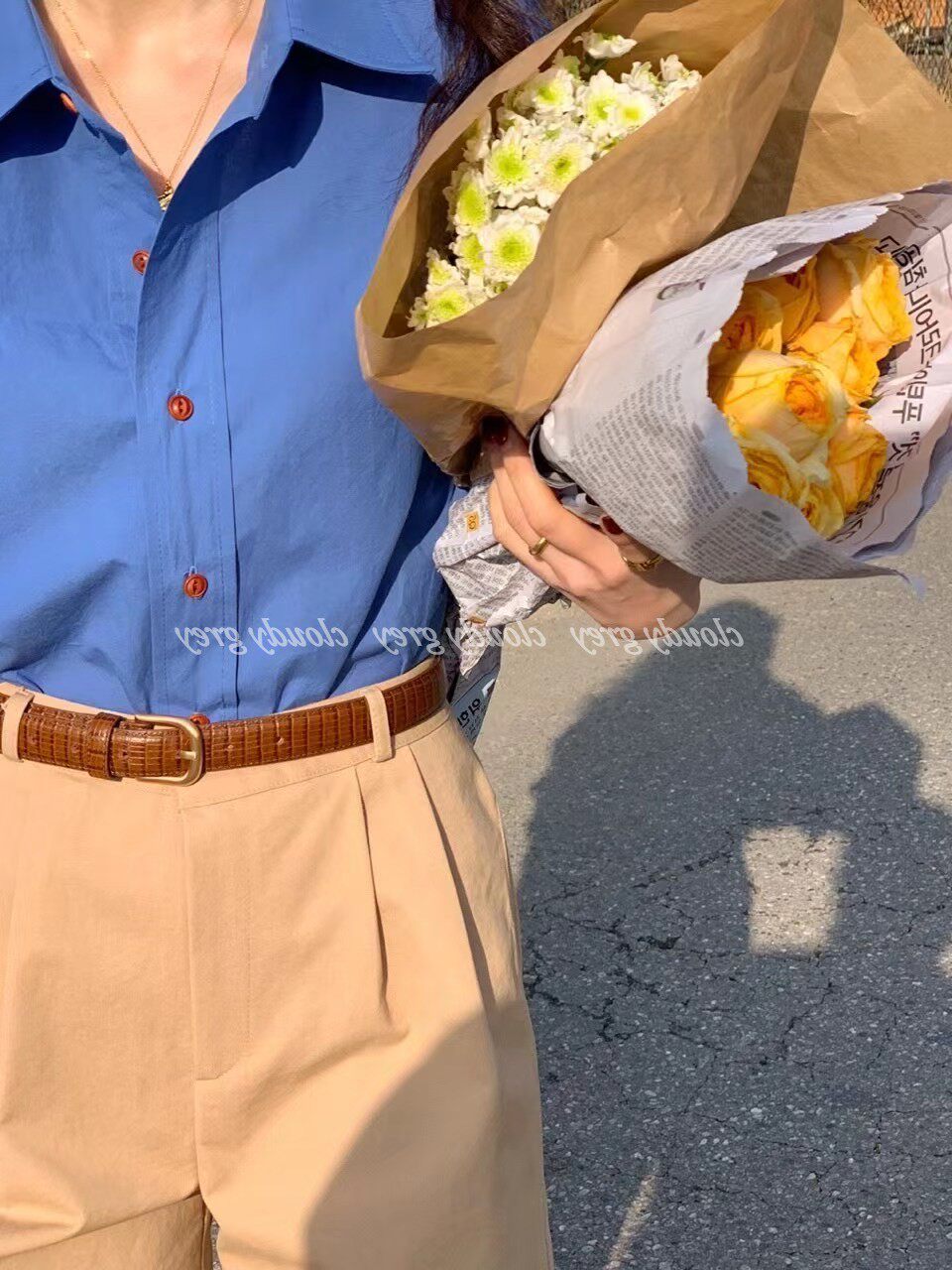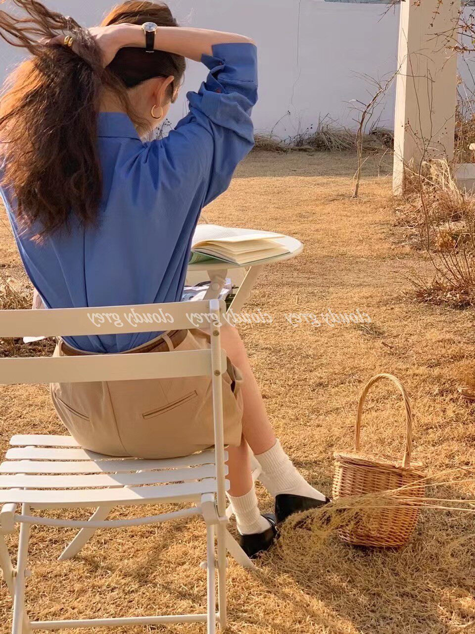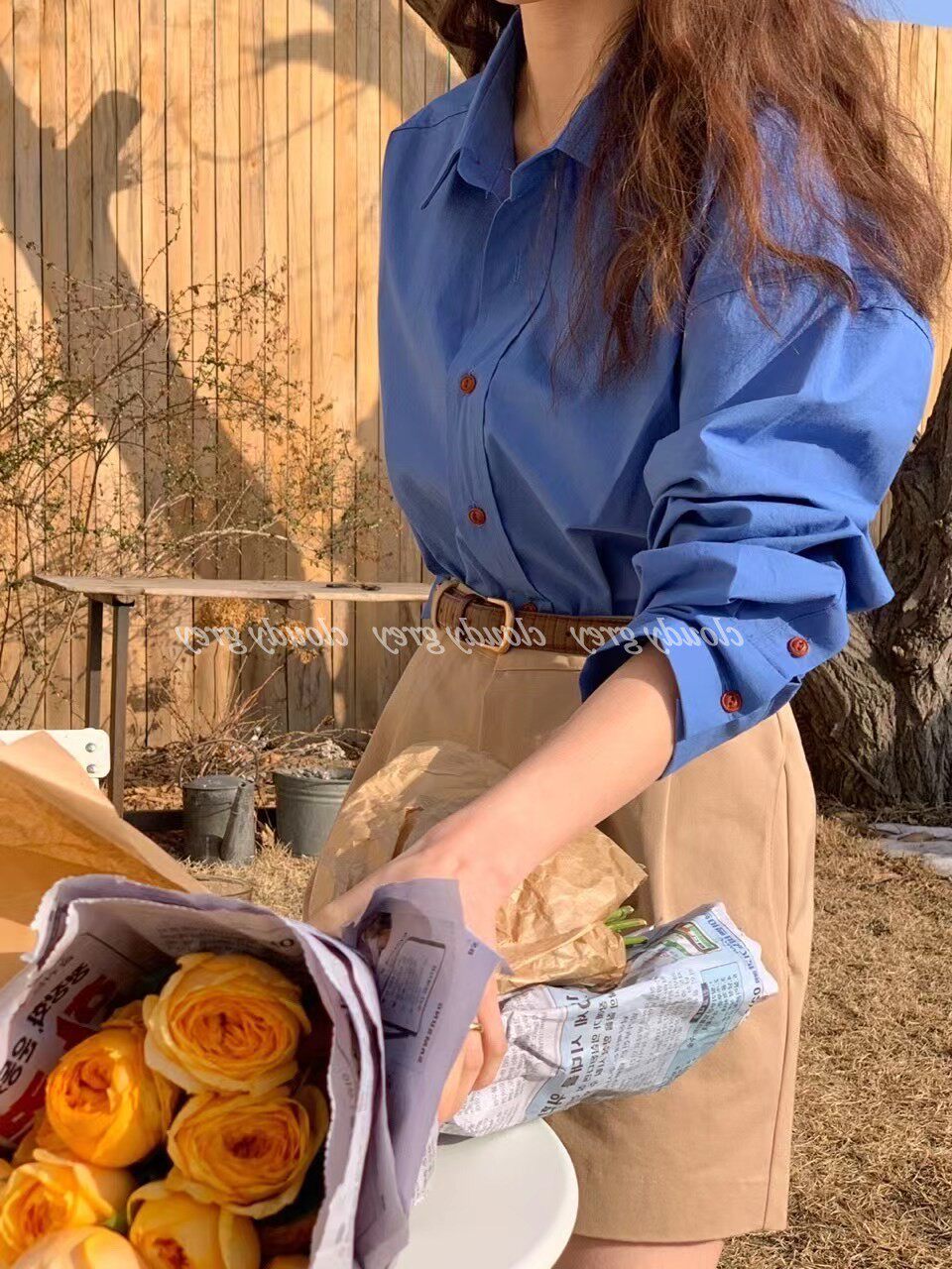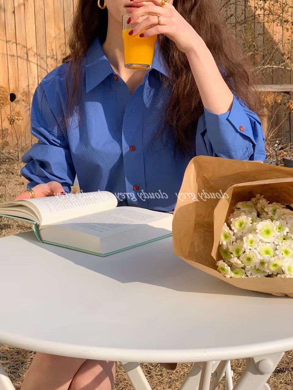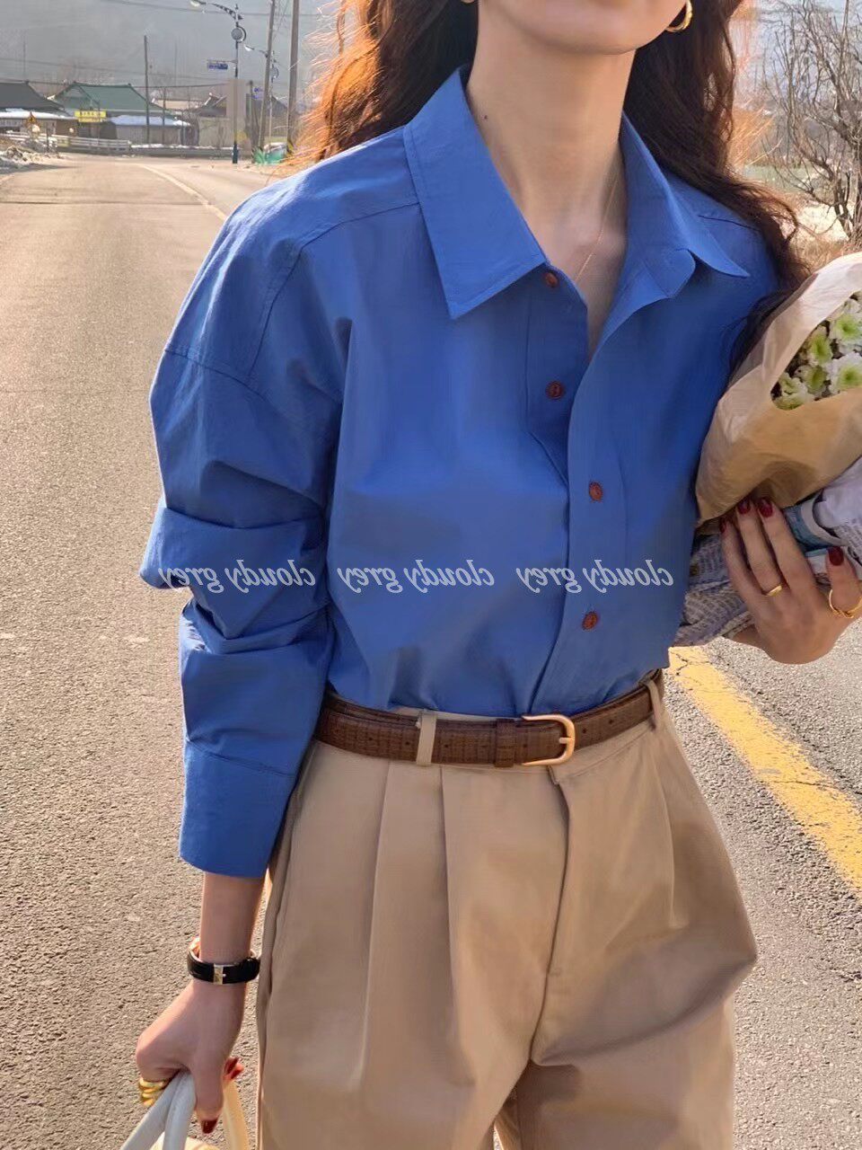 韓版高級感別致克萊因藍長袖襯衫女2023春秋新款純棉寬鬆襯衫上衣