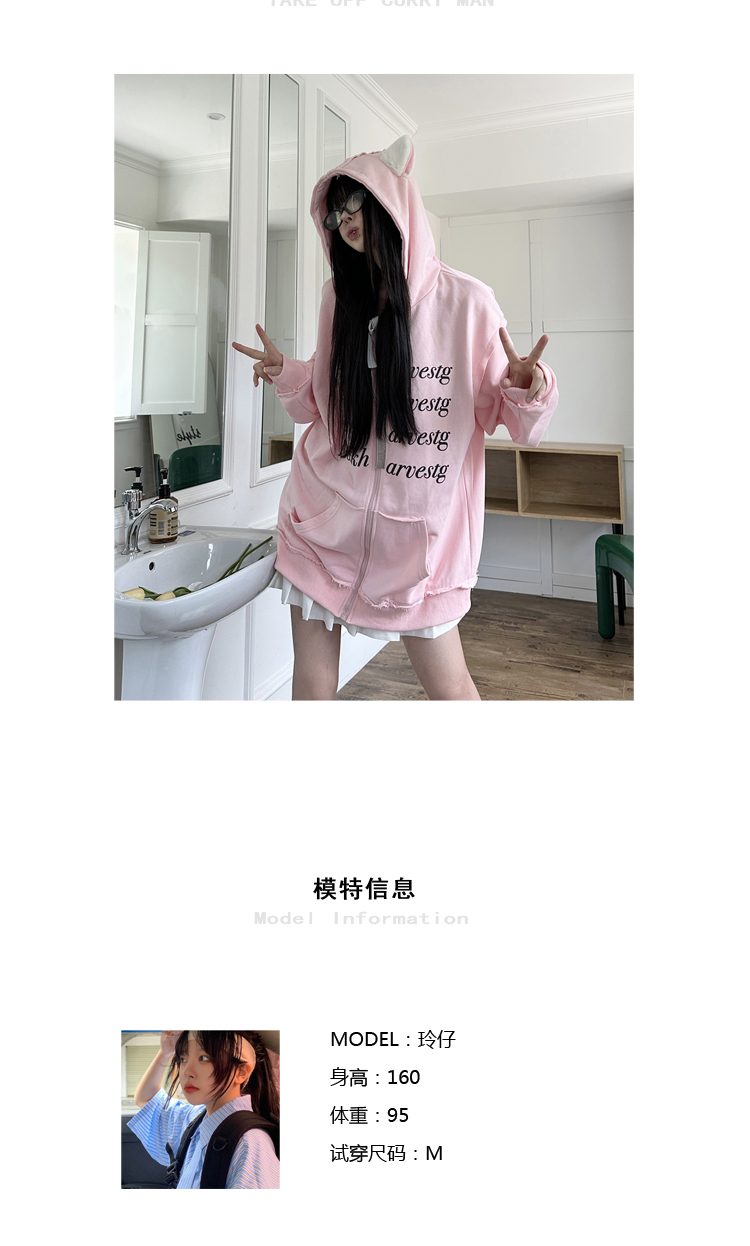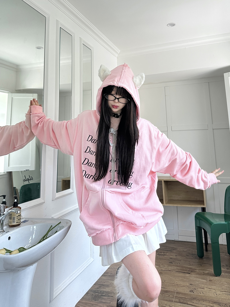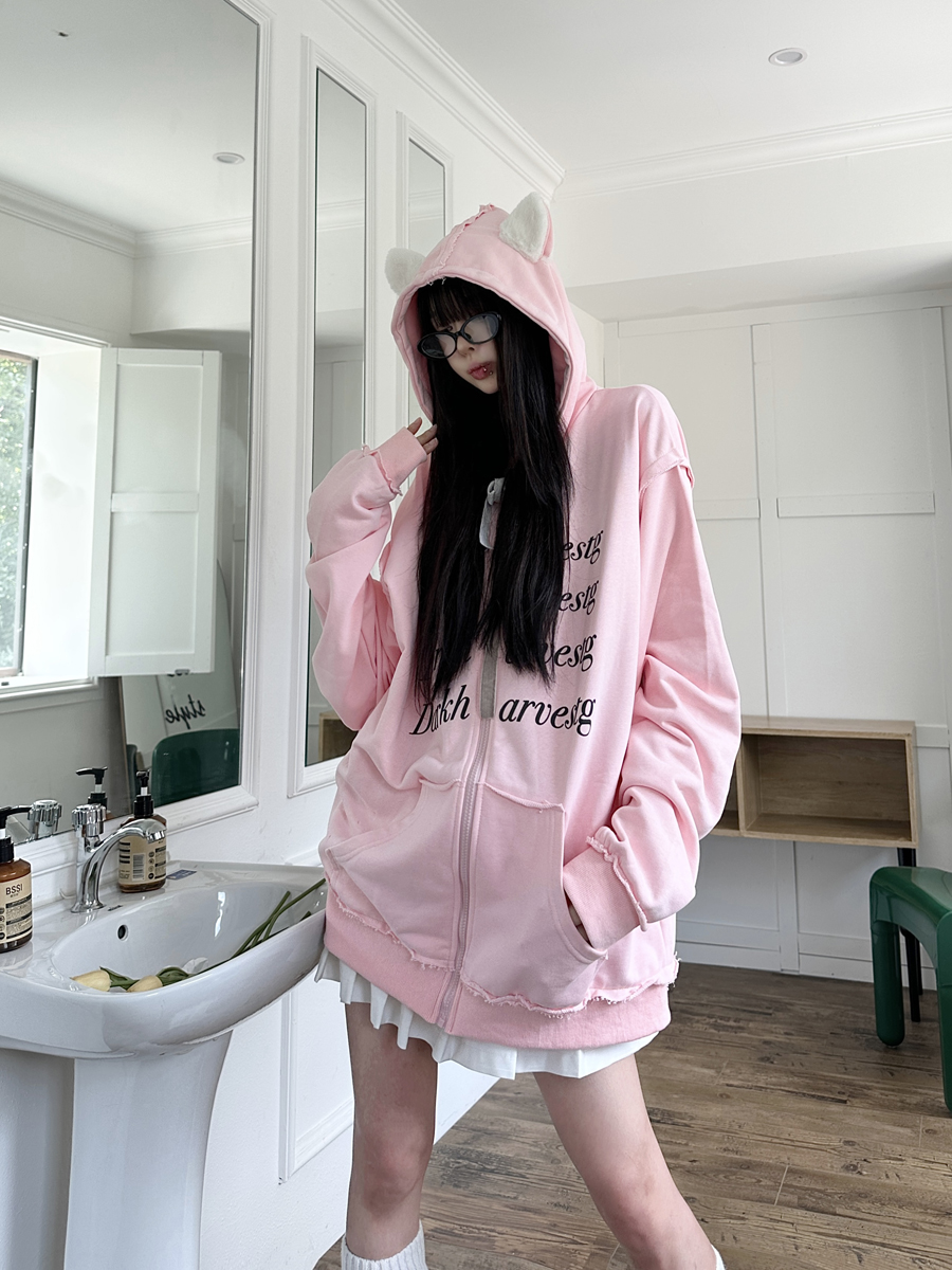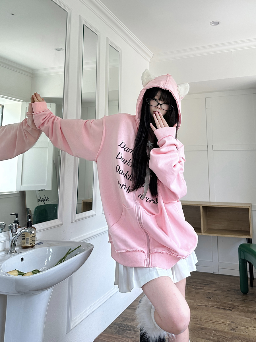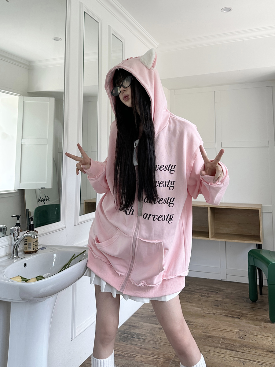 咖哩人秋新款貓耳連帽外套寬鬆男女長袖粉色印花字母寬鬆衛衣ins