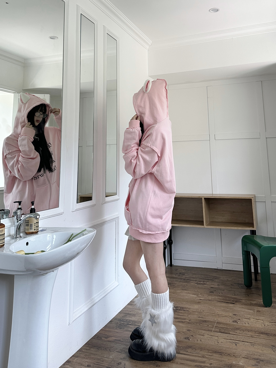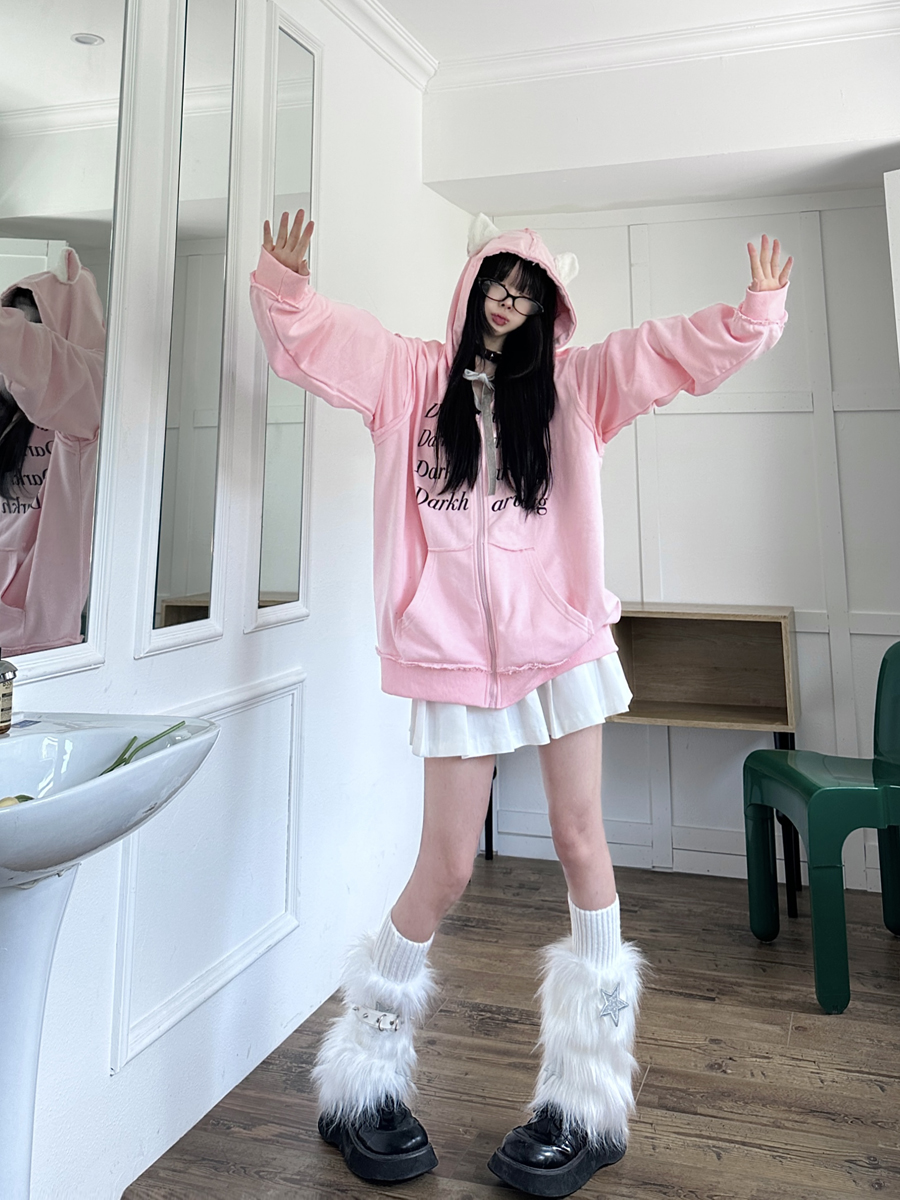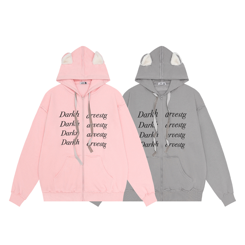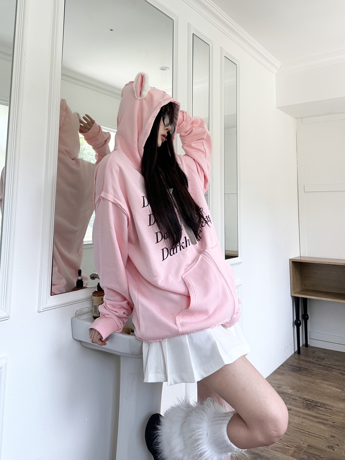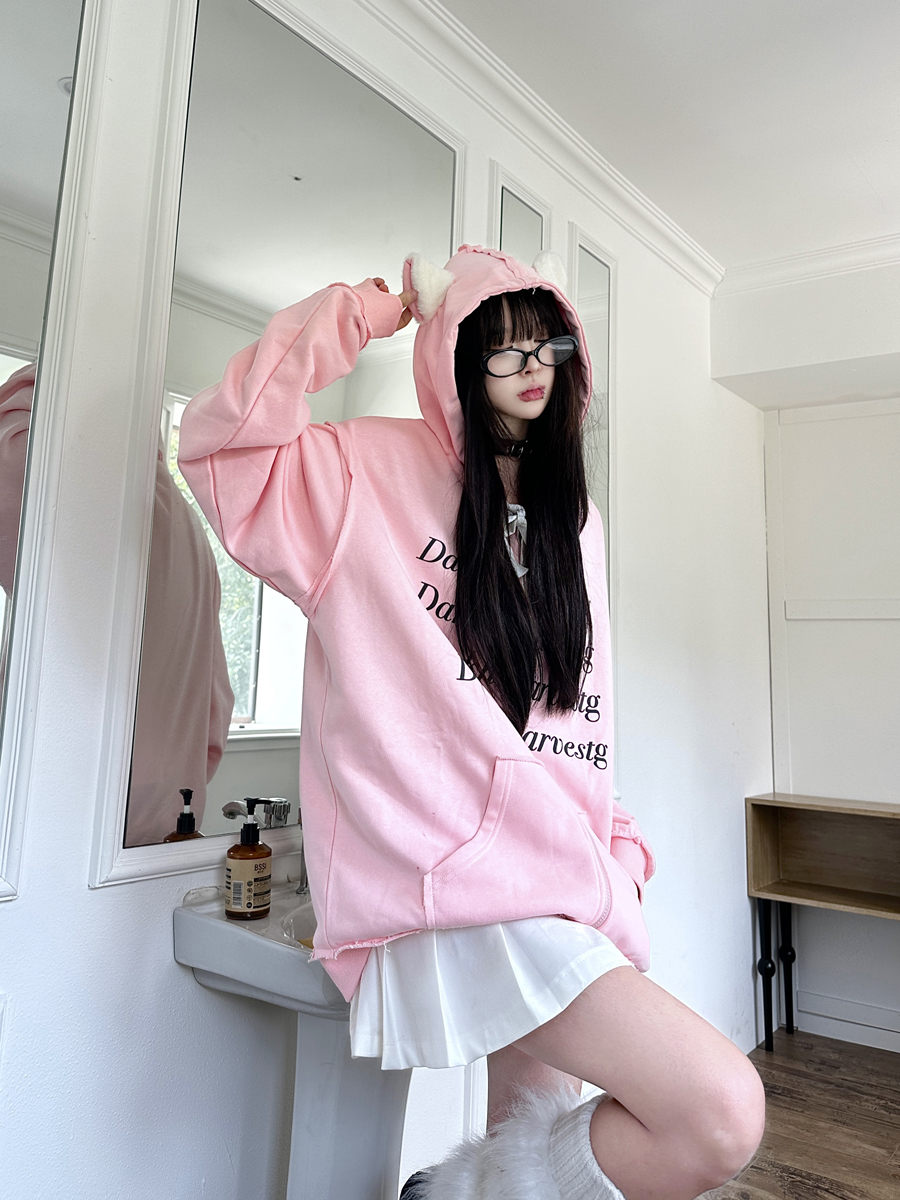 咖哩人秋新款貓耳連帽外套寬鬆男女長袖粉色印花字母寬鬆衛衣ins