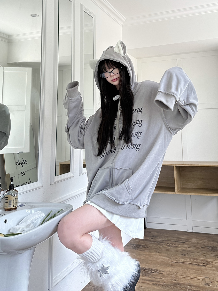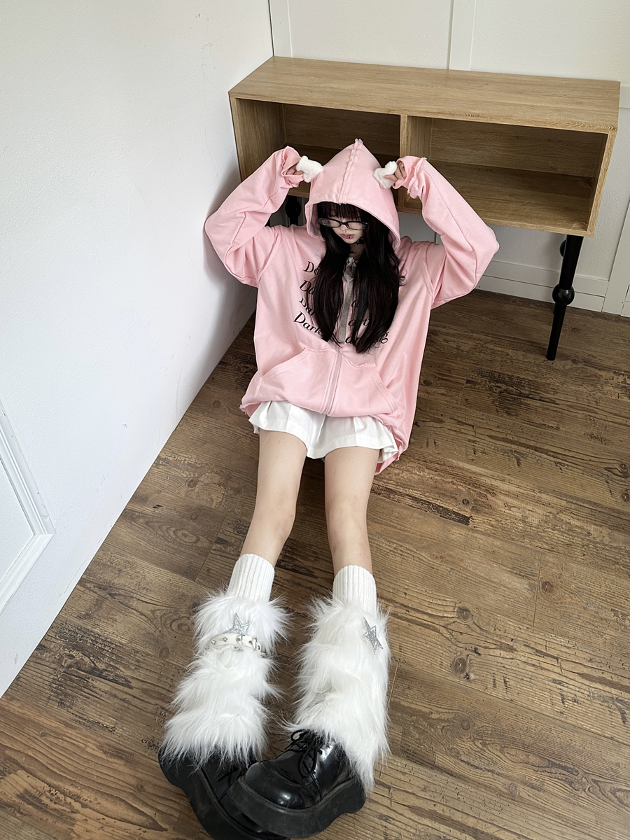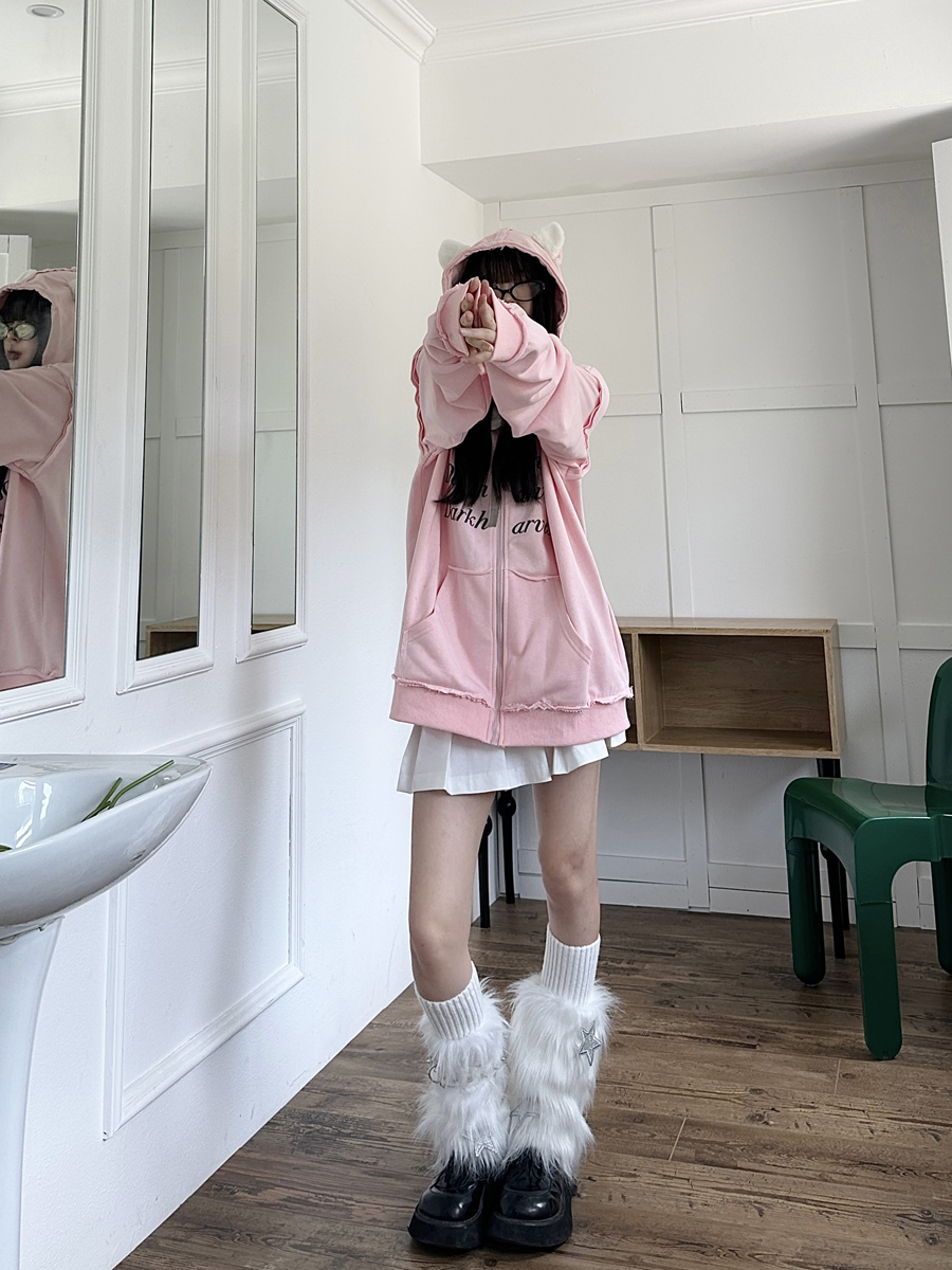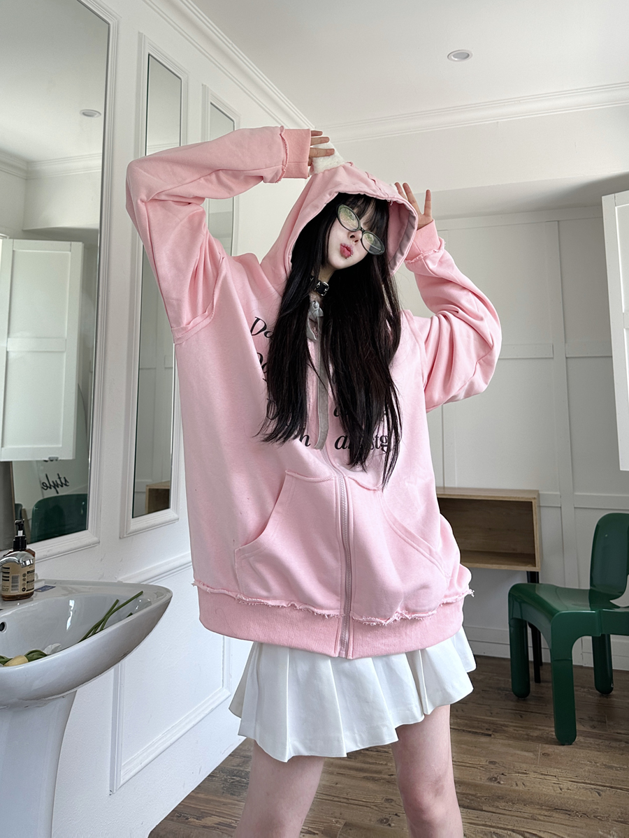 咖哩人秋新款貓耳連帽外套寬鬆男女長袖粉色印花字母寬鬆衛衣ins