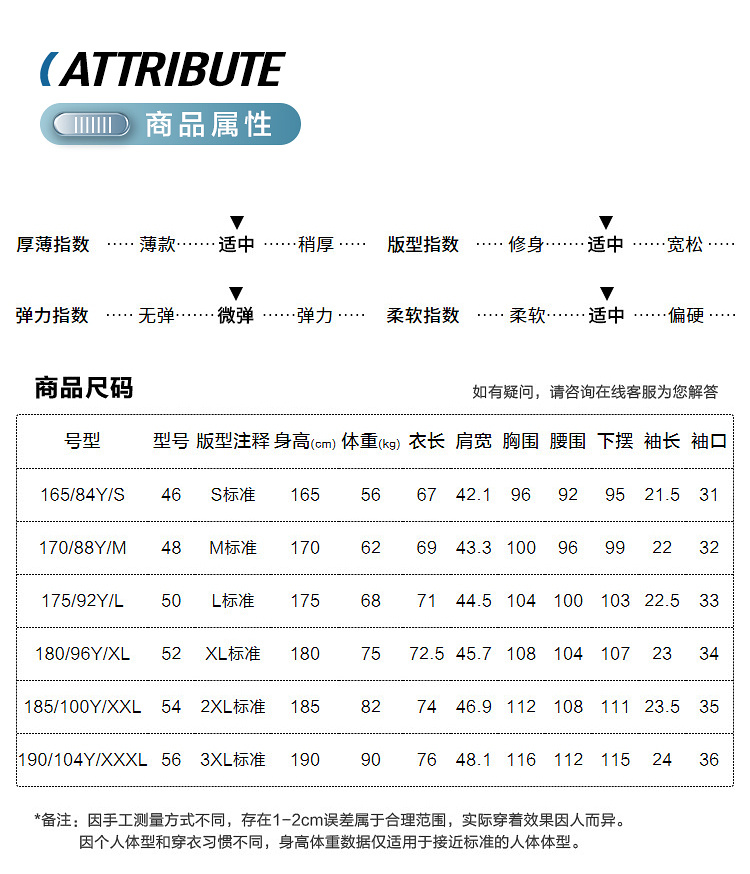 尺碼 165/84Y/S 170/88Y/M 175/92Y/L 180/96Y/XL 185/100Y/XXL 190/104Y/XXXL