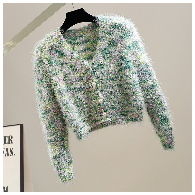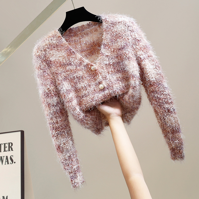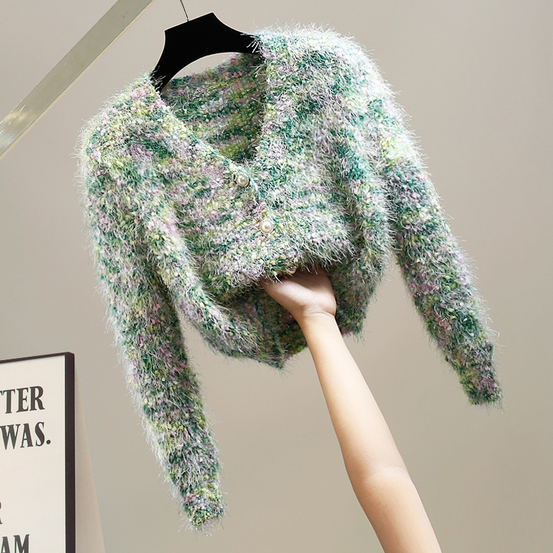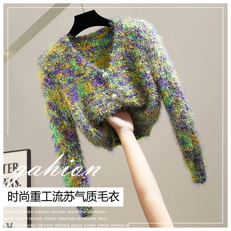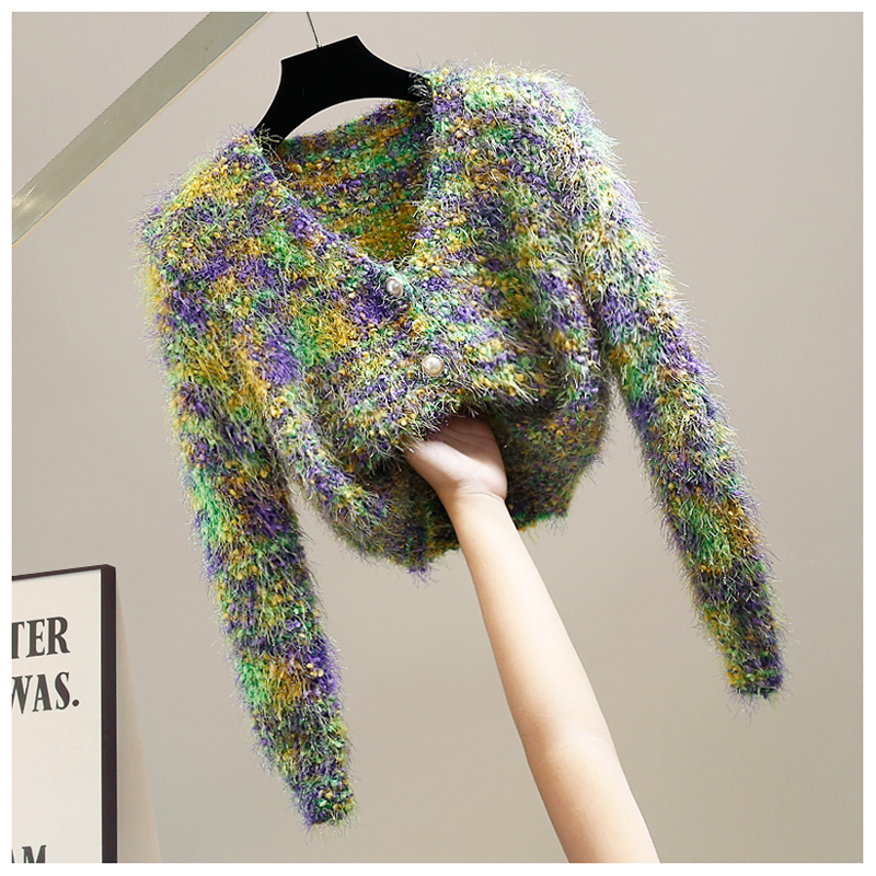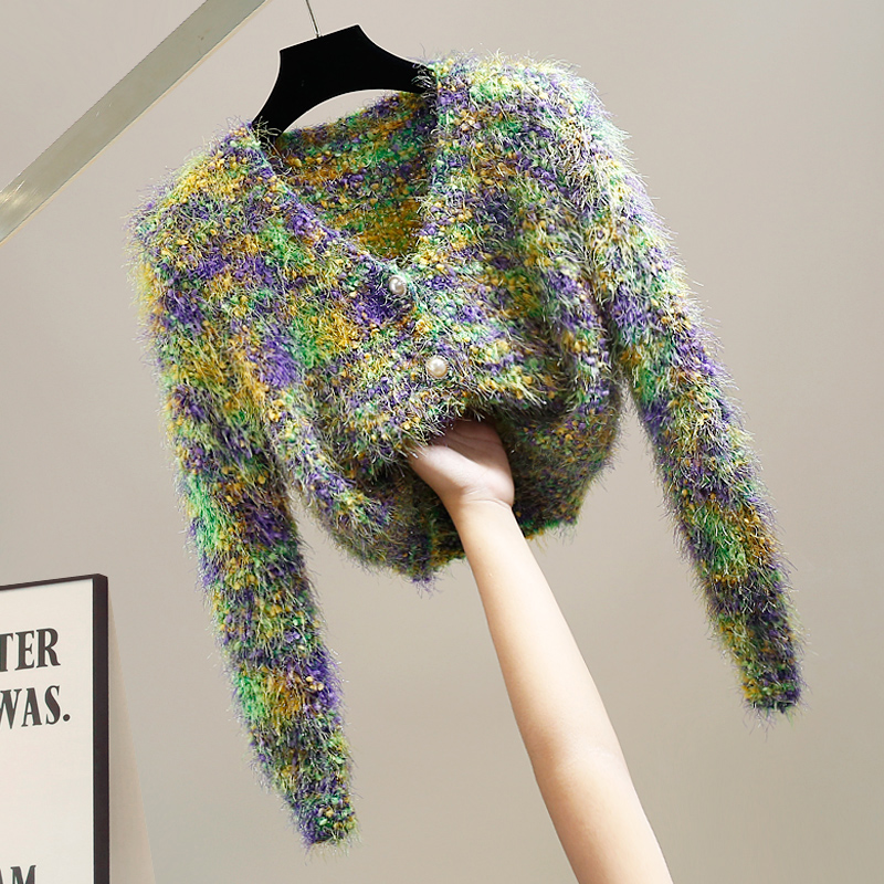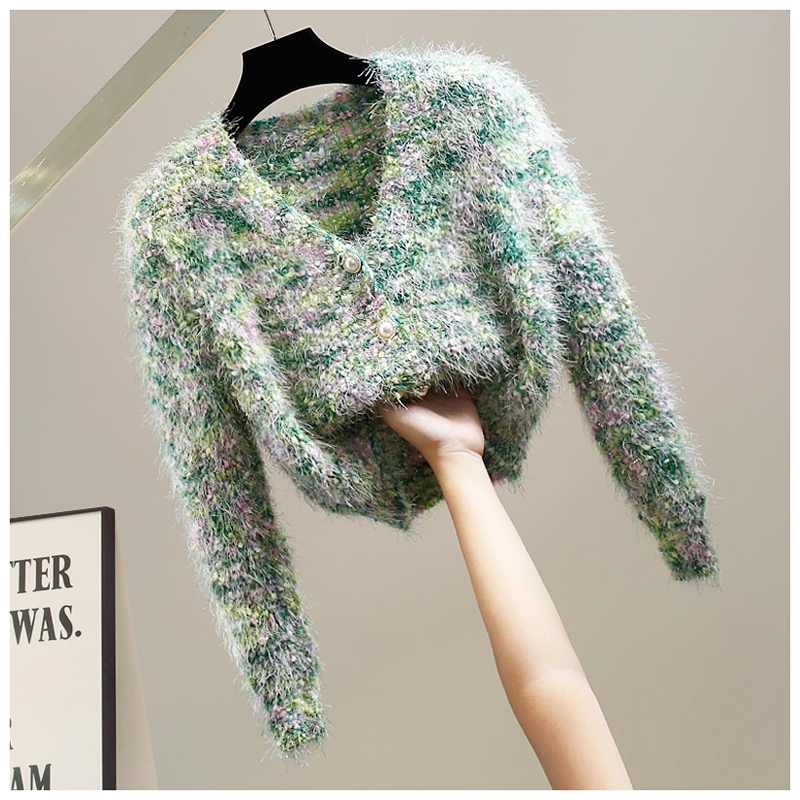 時尚彩色粗線毛絨絨鉤織V領長袖毛衣寬鬆顯瘦軟糯氣質短款毛衣潮