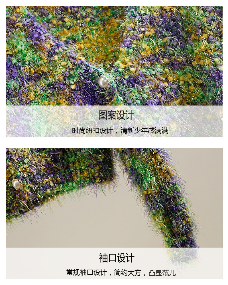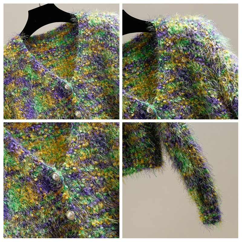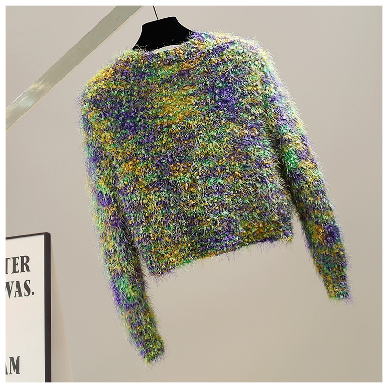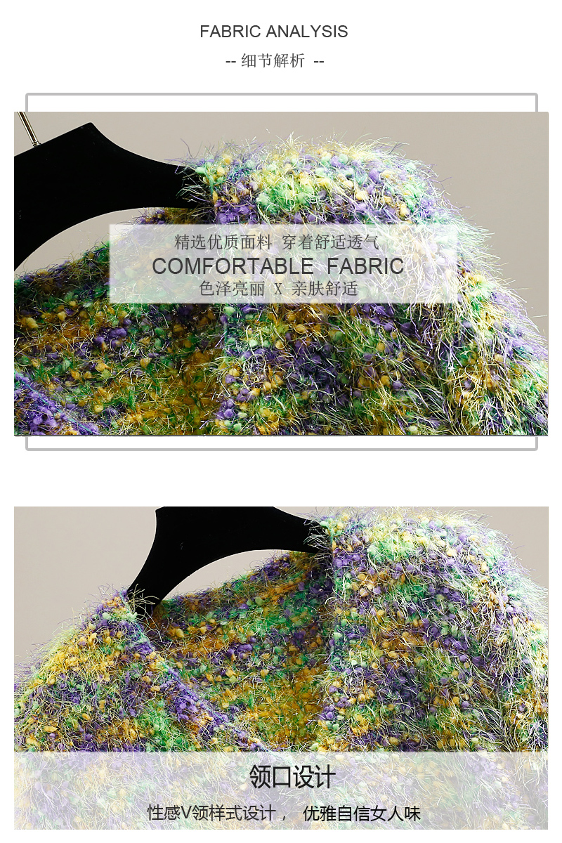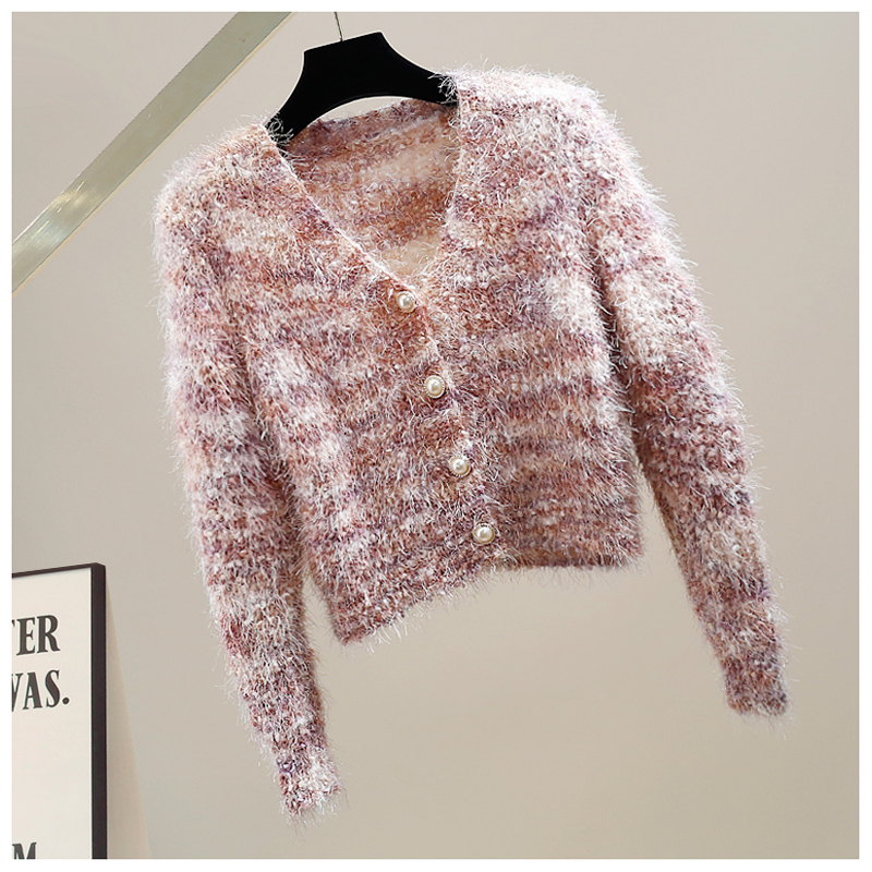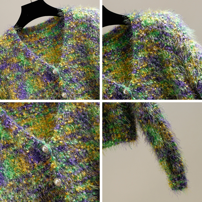 時尚彩色粗線毛絨絨鉤織V領長袖毛衣寬鬆顯瘦軟糯氣質短款毛衣潮