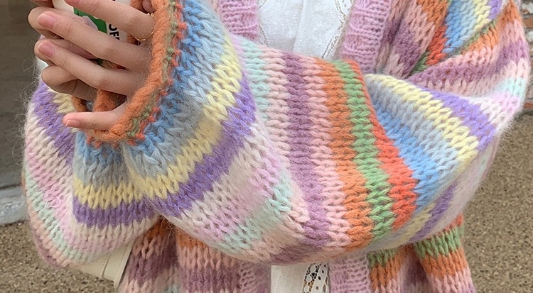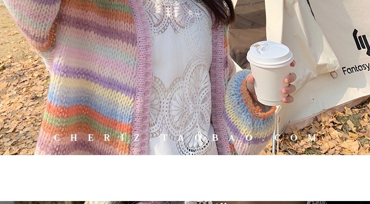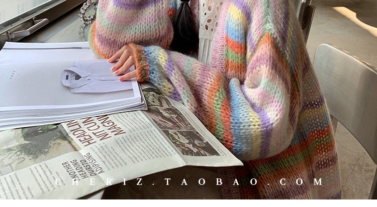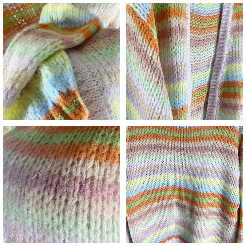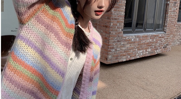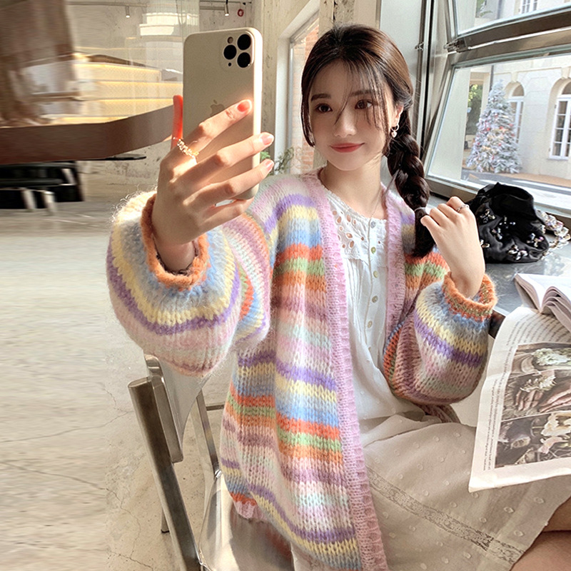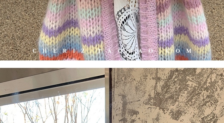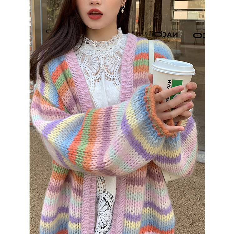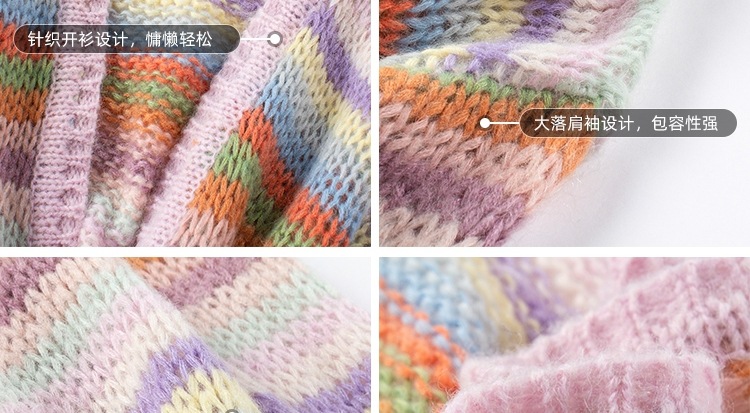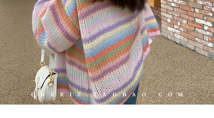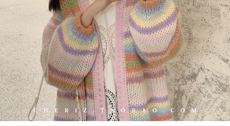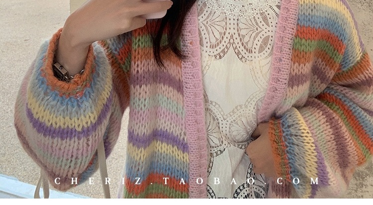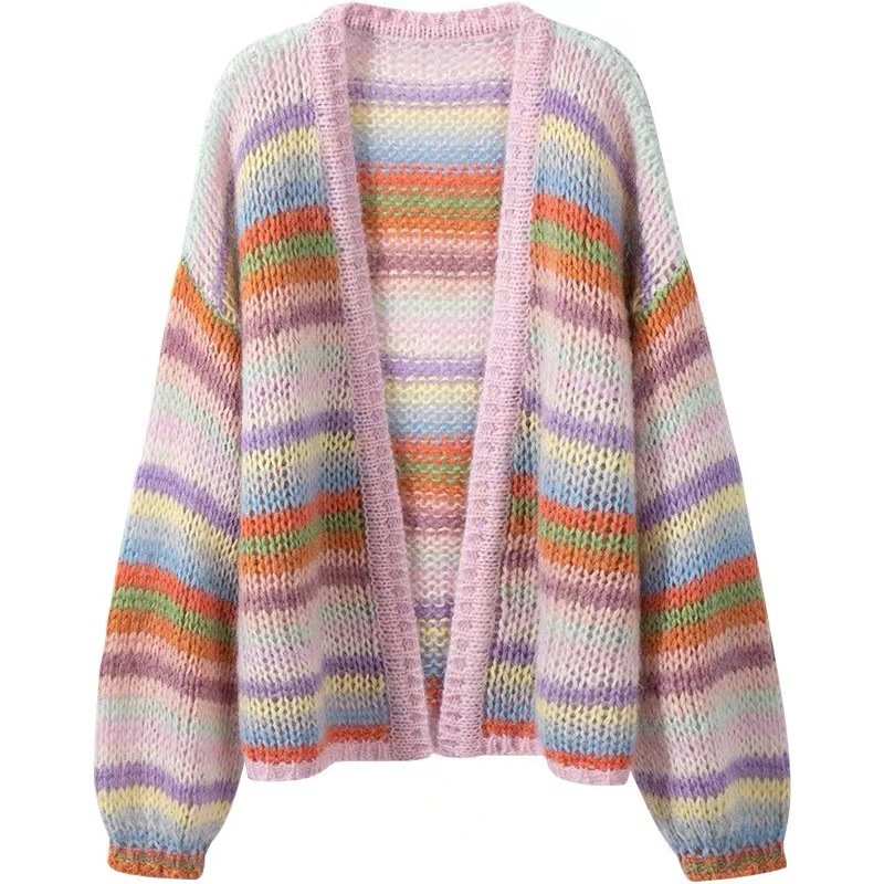 彩虹条纹马海毛针织开衫长款宽松慵懒风外搭早春毛衣外套女软糯风