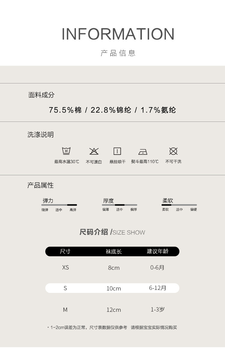 童袜尺码 XS 0-6个月,S 6-12个月,M 1-3岁