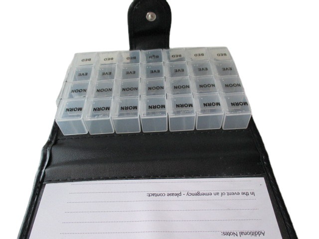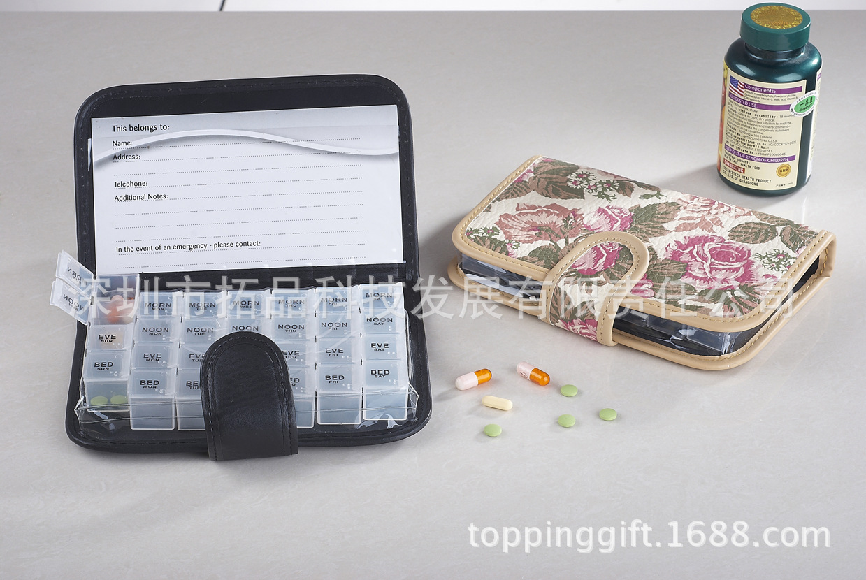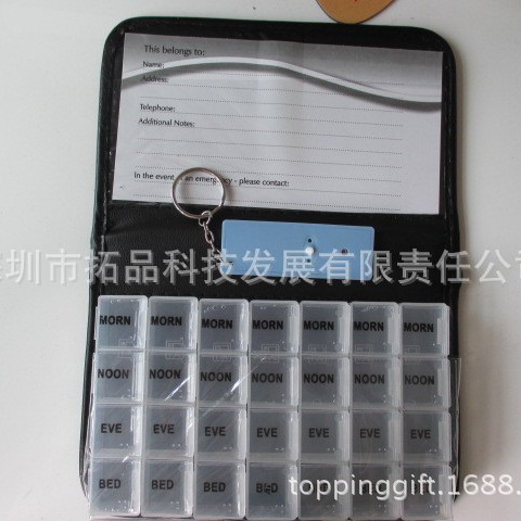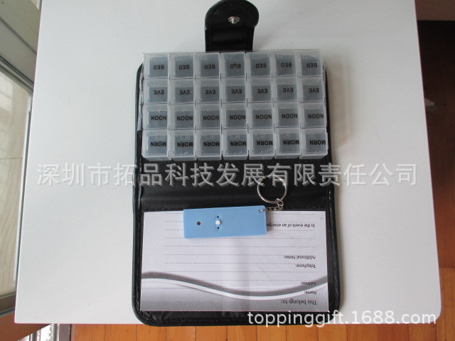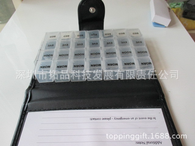 一星期药盒共有28个放药格,一共7排药格,每排4个放药格,药盒外有PU皮套包裹,每个放药格都可以独立打开,方便携带