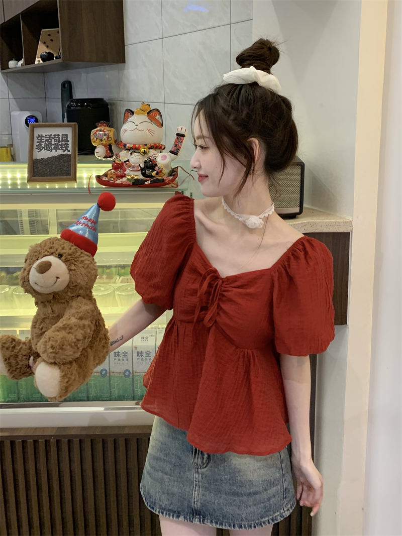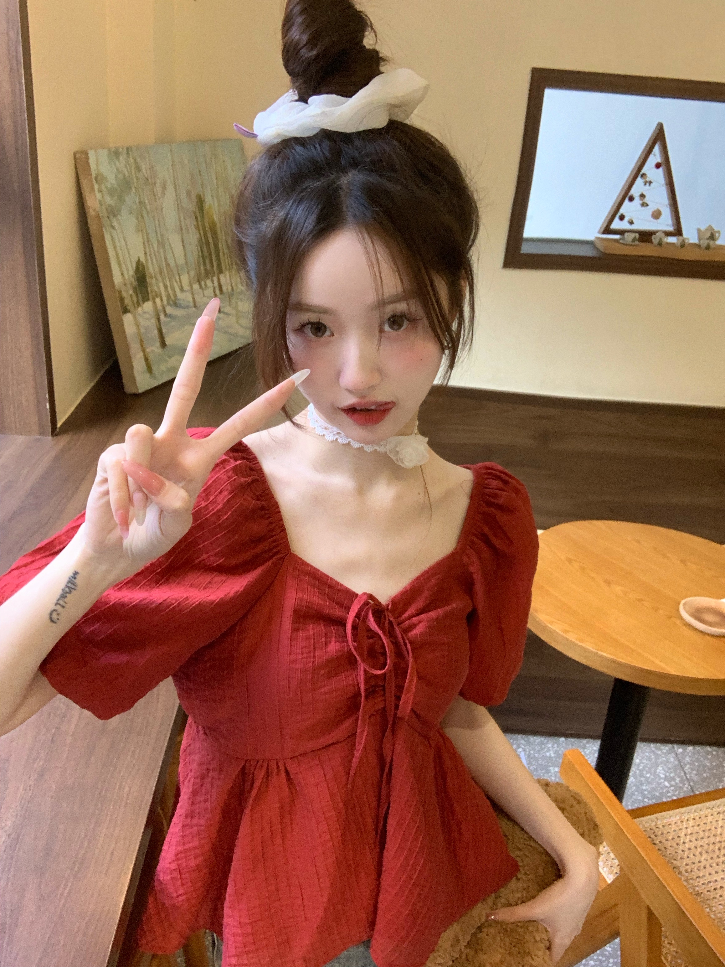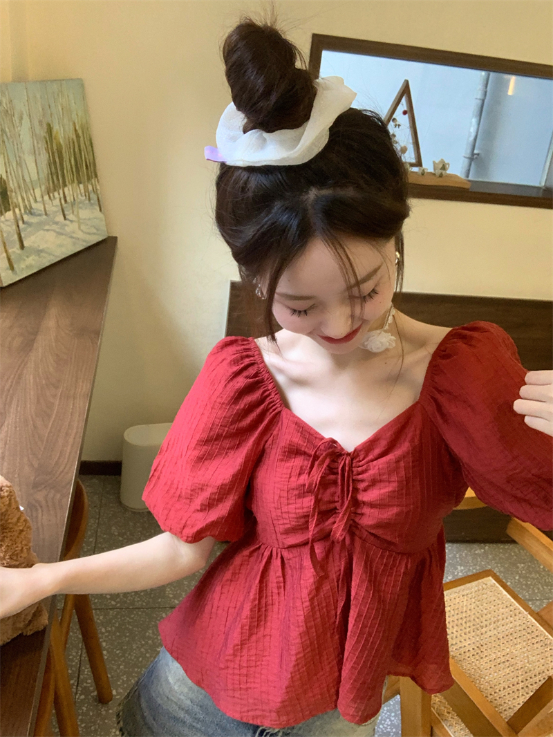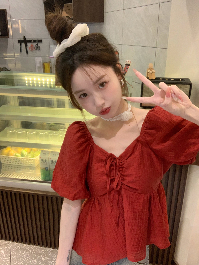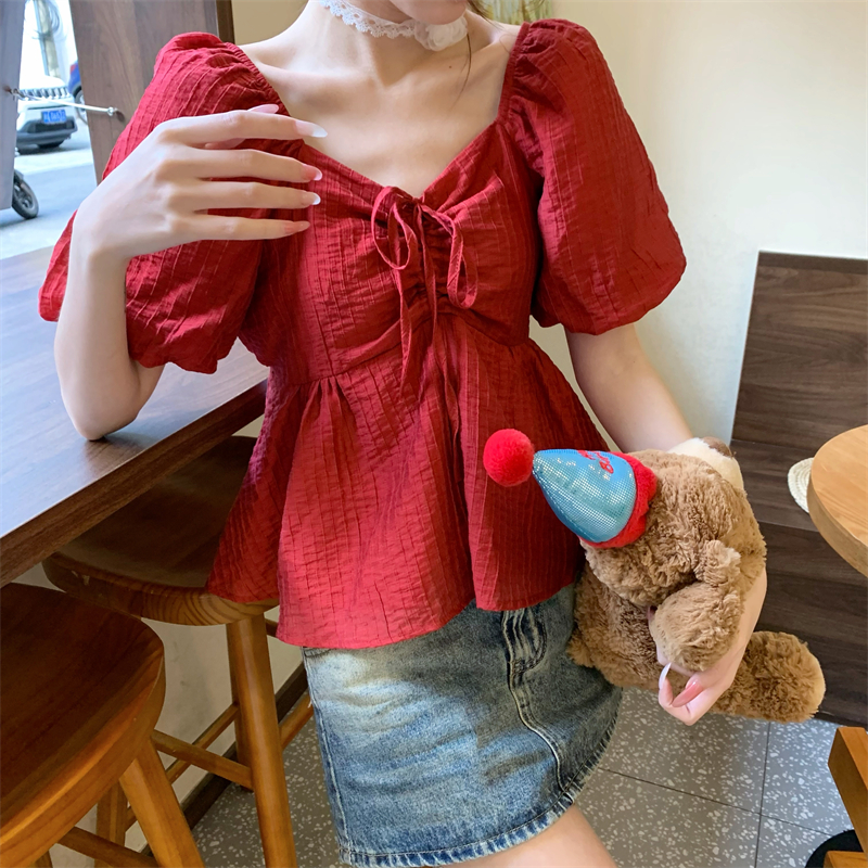 大尺碼一字肩繫帶短款上衣女秋胖mm寬鬆法式宮廷風褶皺泡泡短袖襯衫