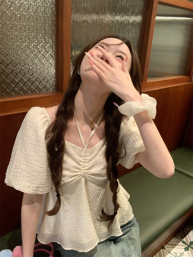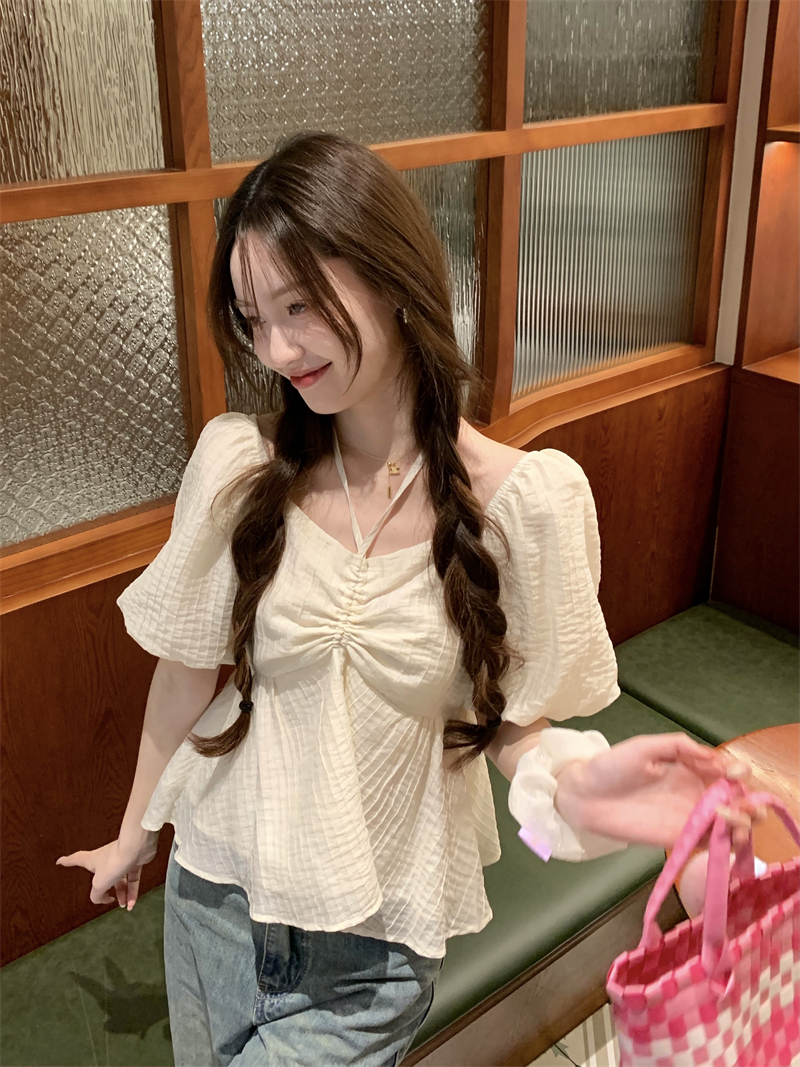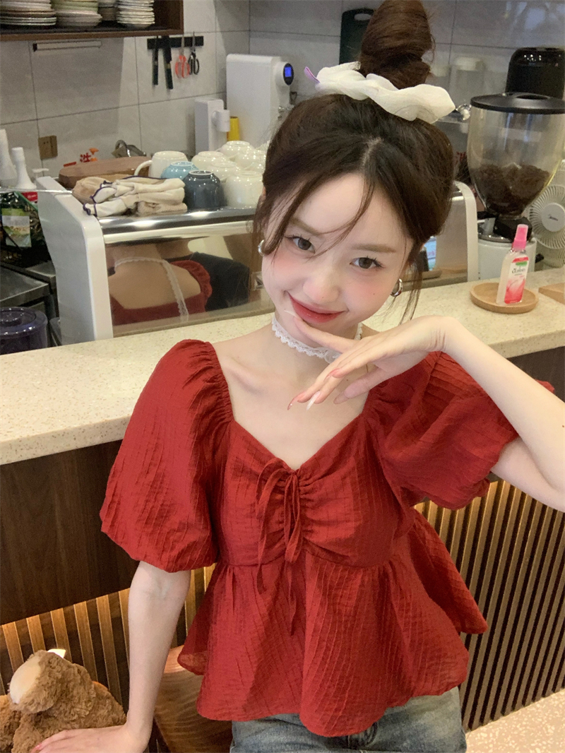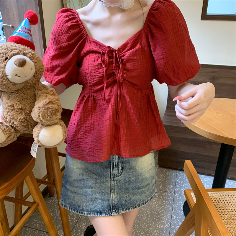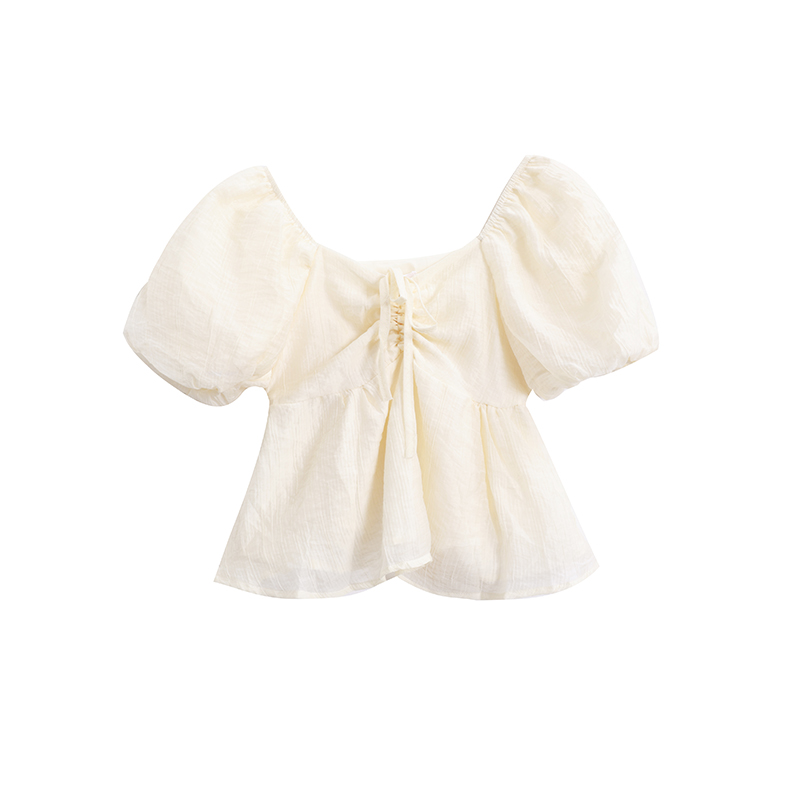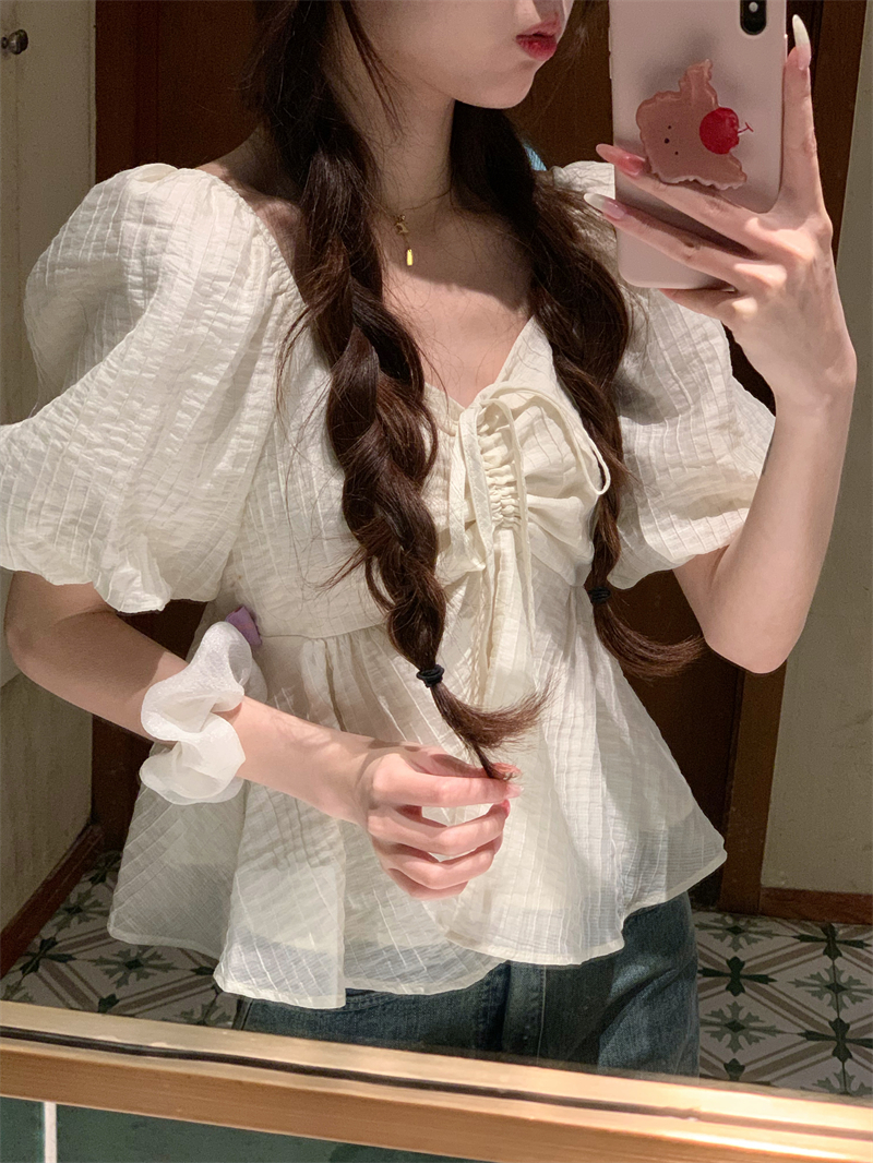 大尺碼一字肩繫帶短款上衣女秋胖mm寬鬆法式宮廷風褶皺泡泡短袖襯衫