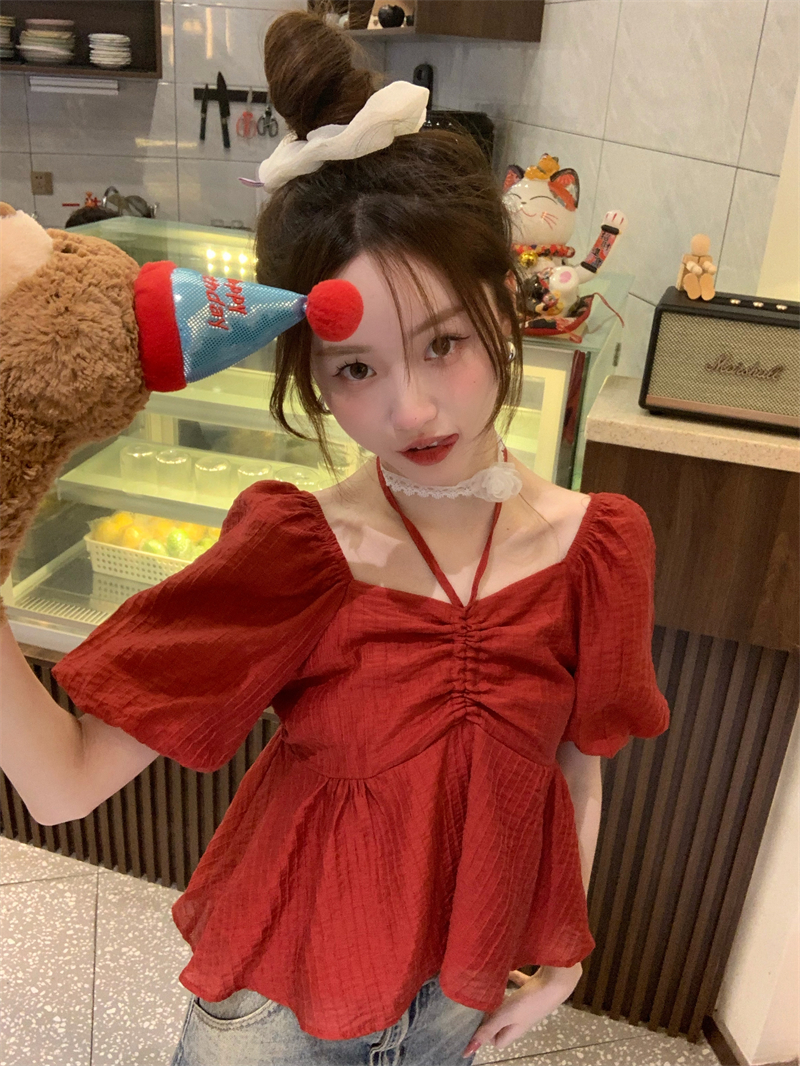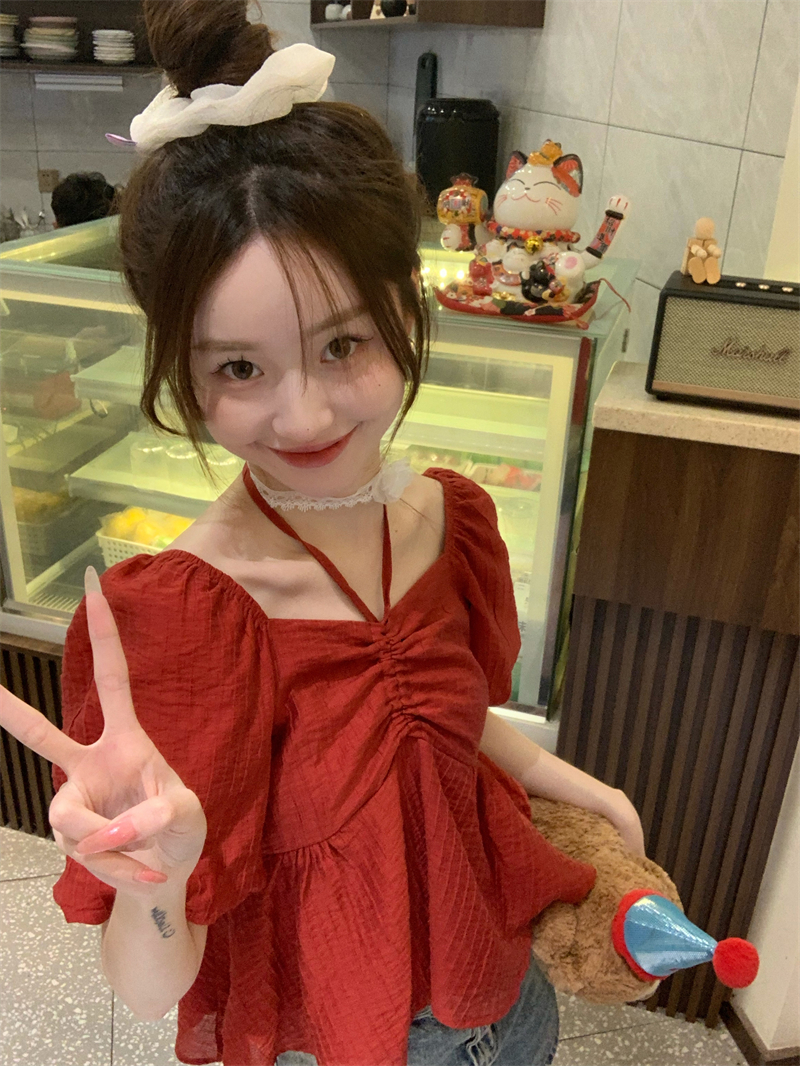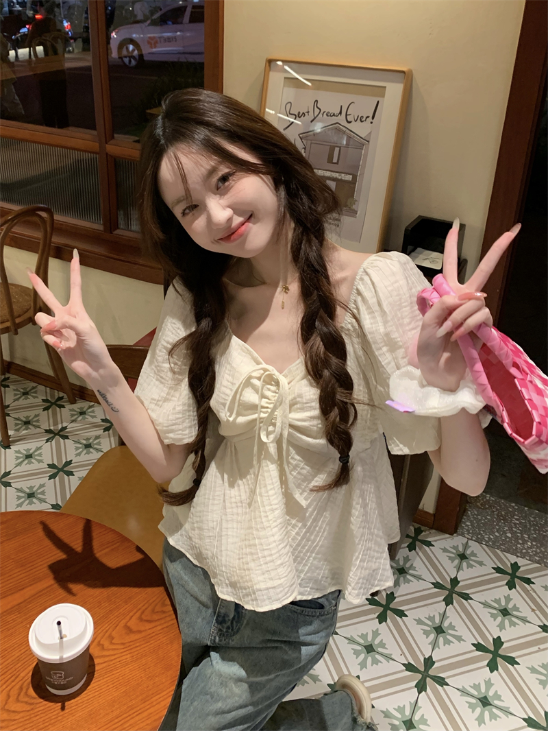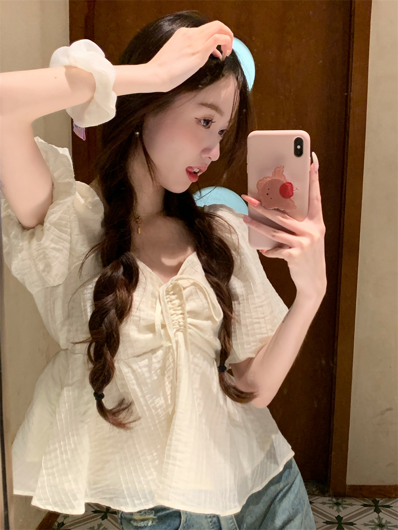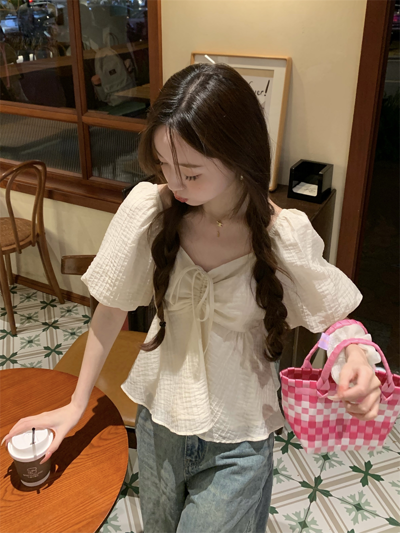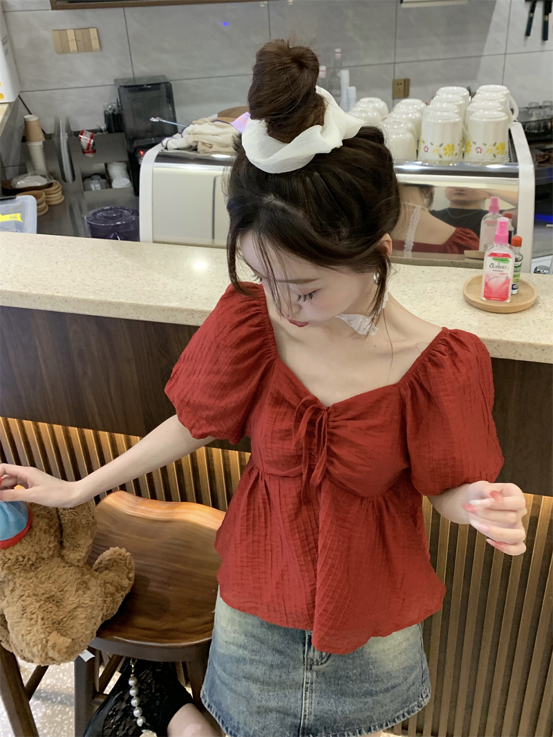 大尺碼一字肩繫帶短款上衣女秋胖mm寬鬆法式宮廷風褶皺泡泡短袖襯衫