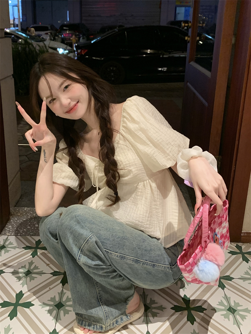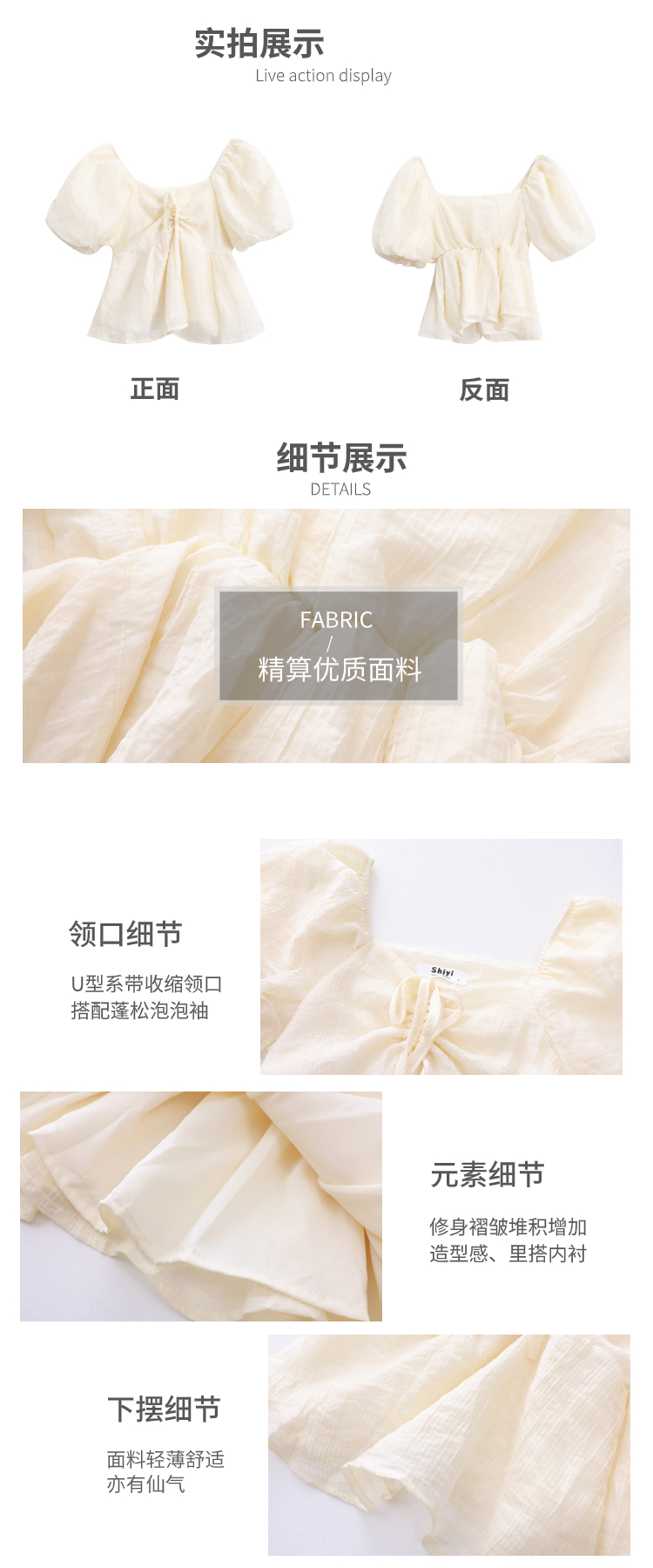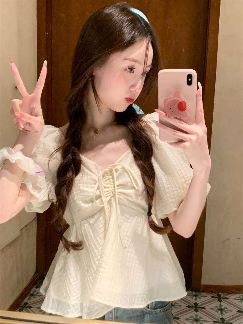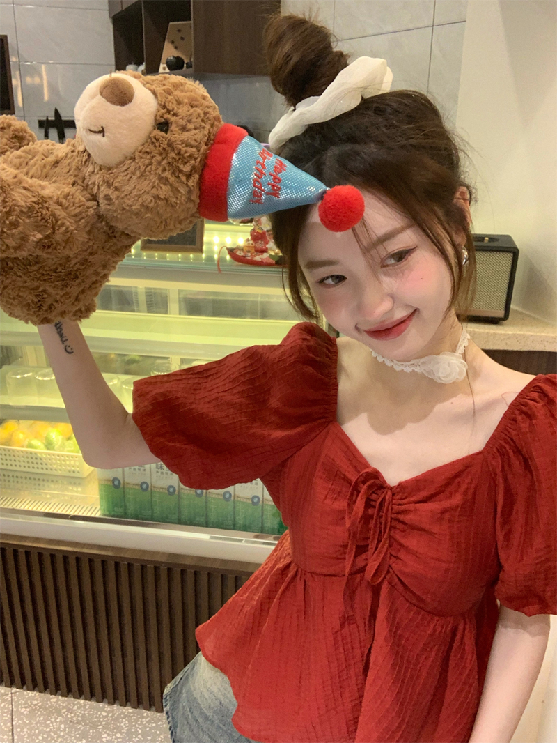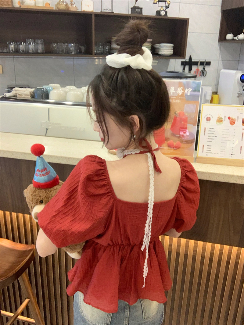 大尺碼一字肩繫帶短款上衣女秋胖mm寬鬆法式宮廷風褶皺泡泡短袖襯衫