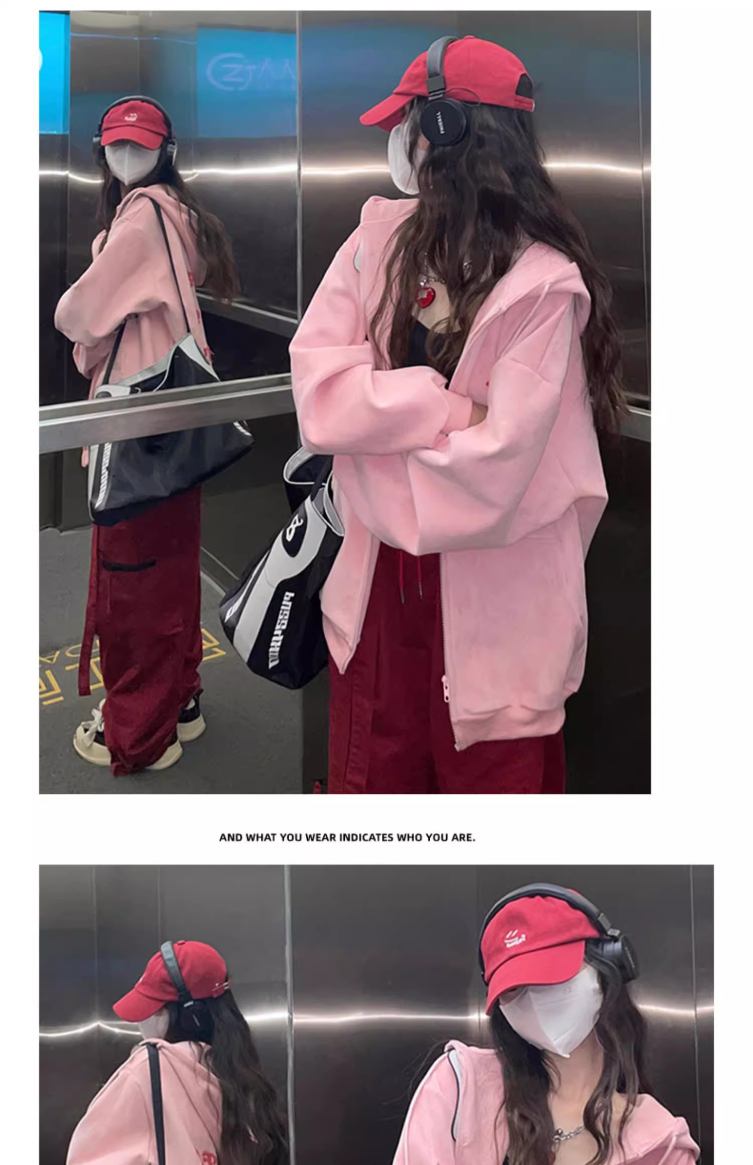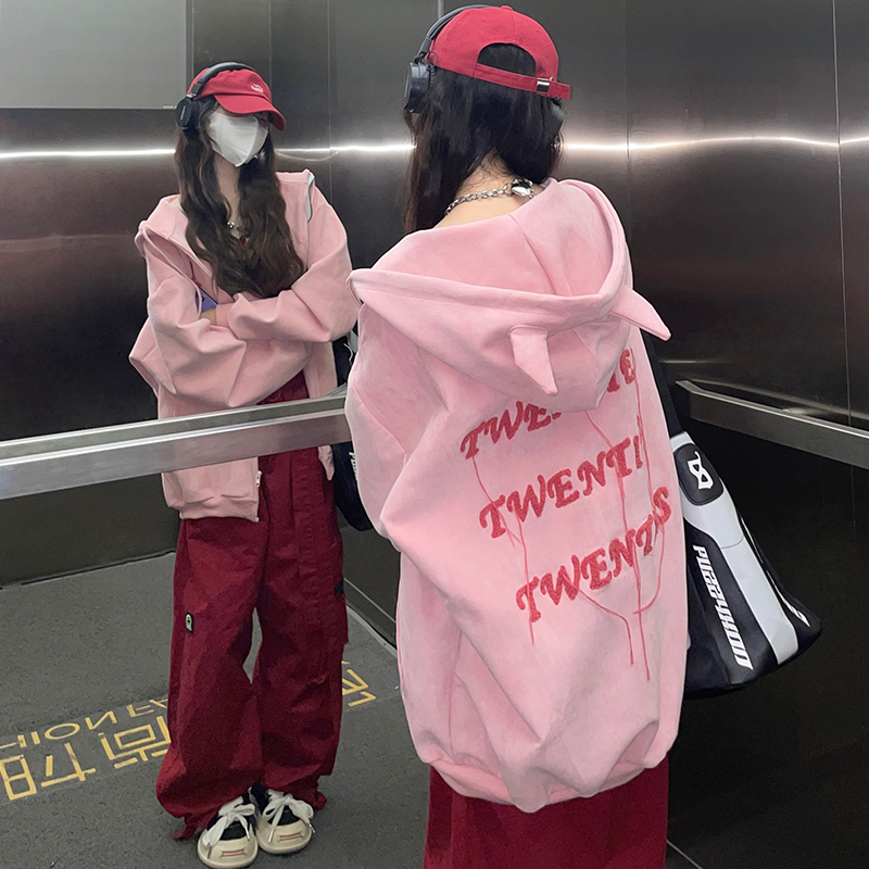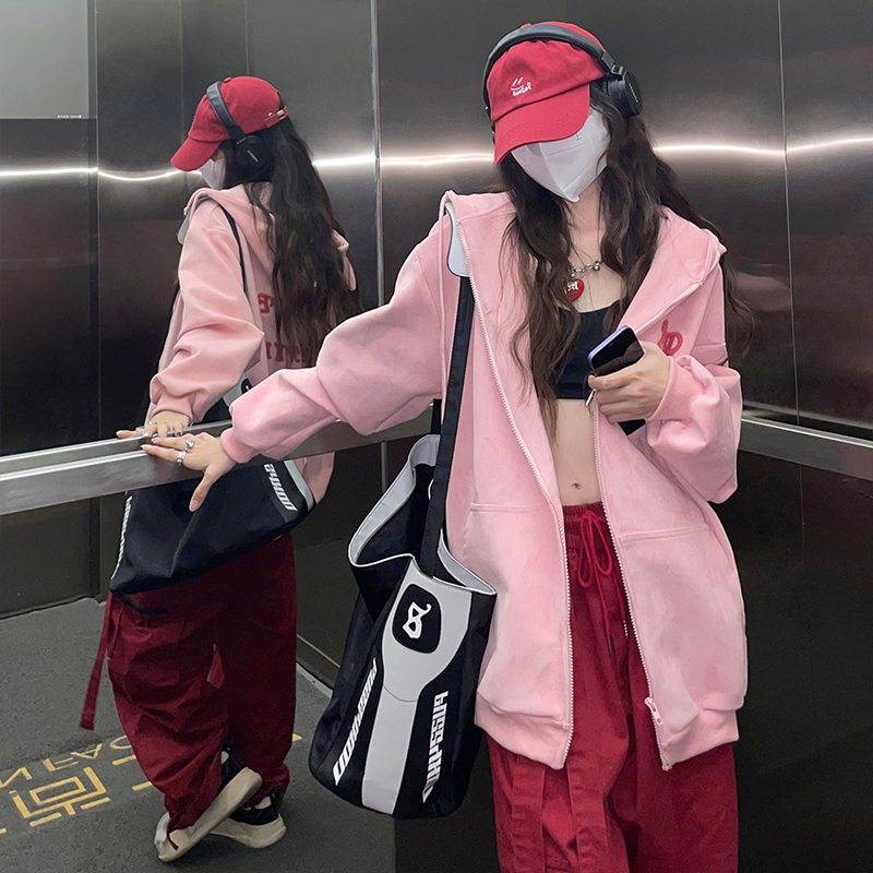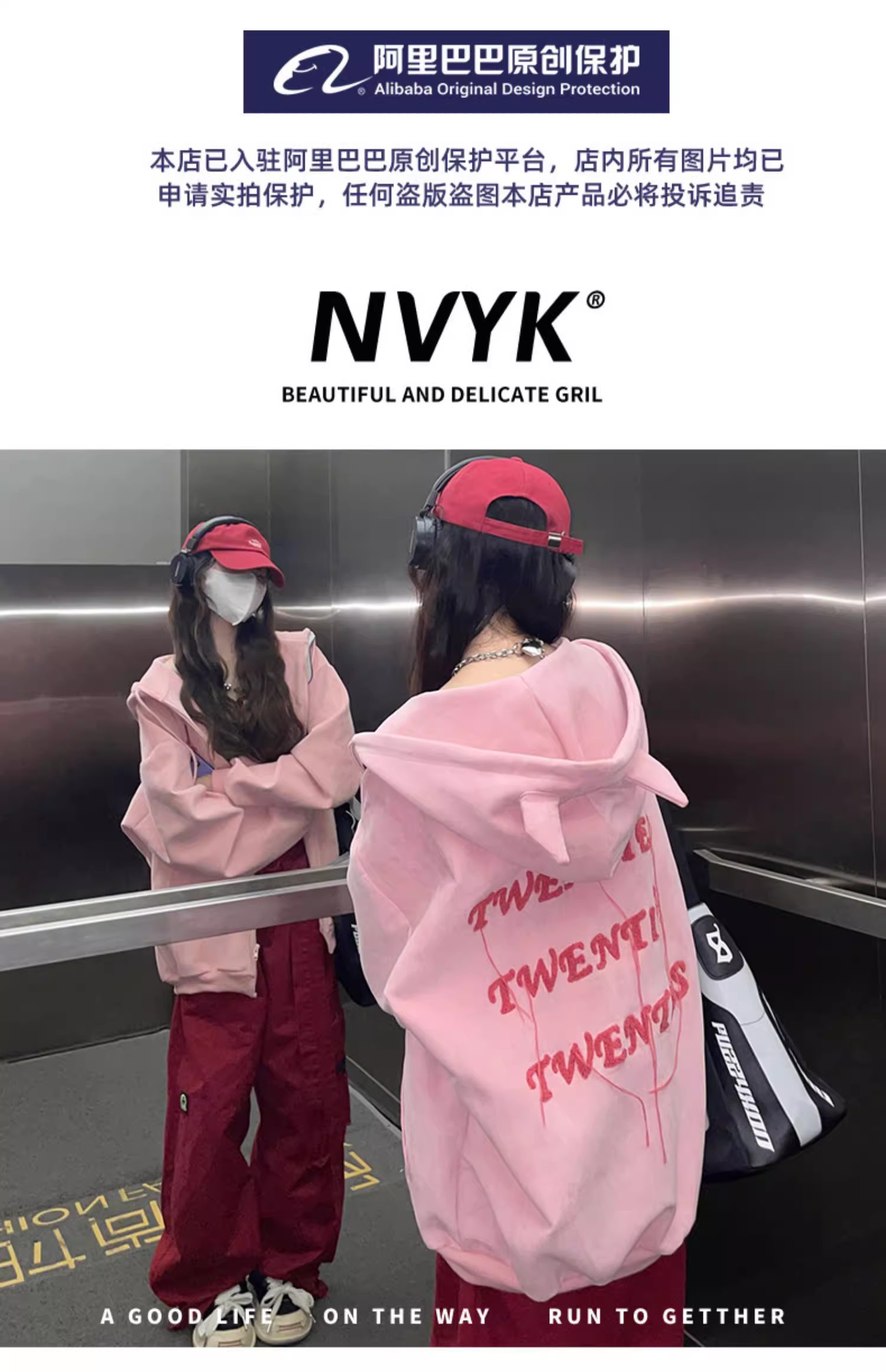 nVyK連帽運動衫女秋冬季美式復古寬鬆休閒麂皮絨牛角拉鍊外套ins潮