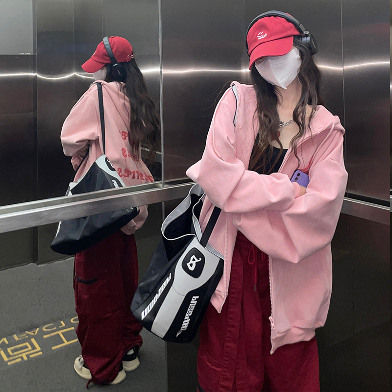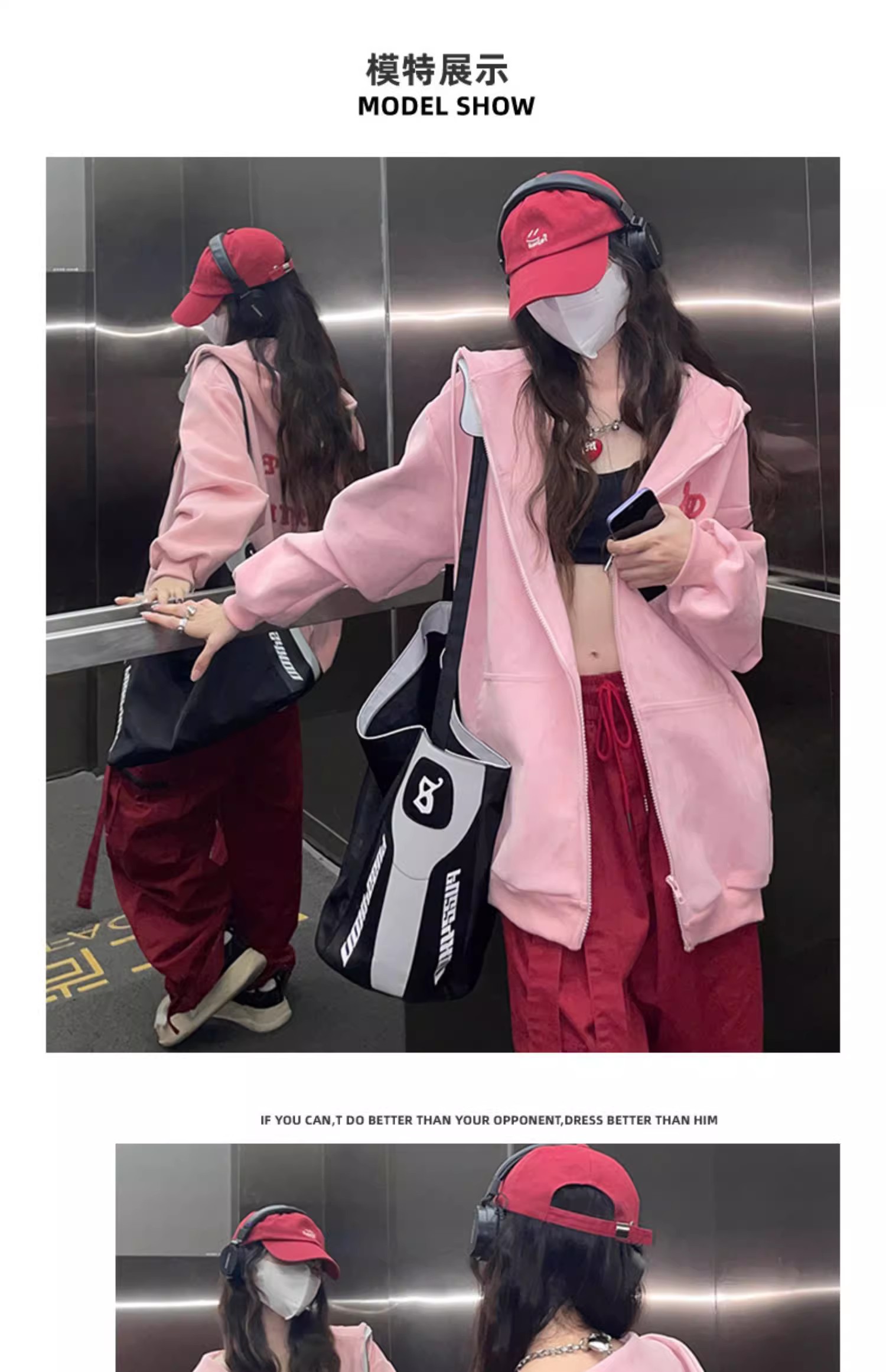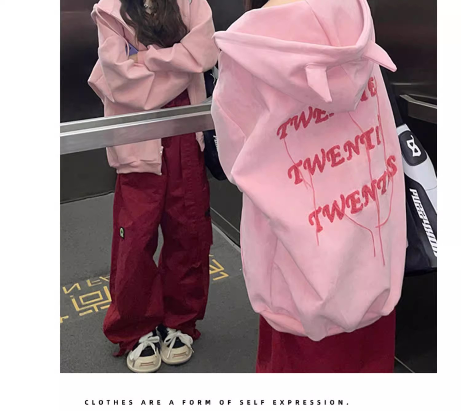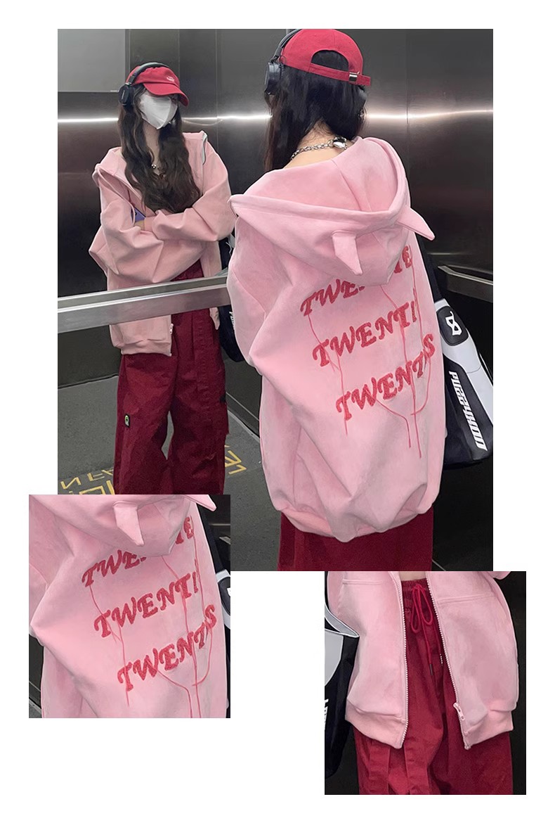 nVyK連帽運動衫女秋冬季美式復古寬鬆休閒麂皮絨牛角拉鍊外套ins潮