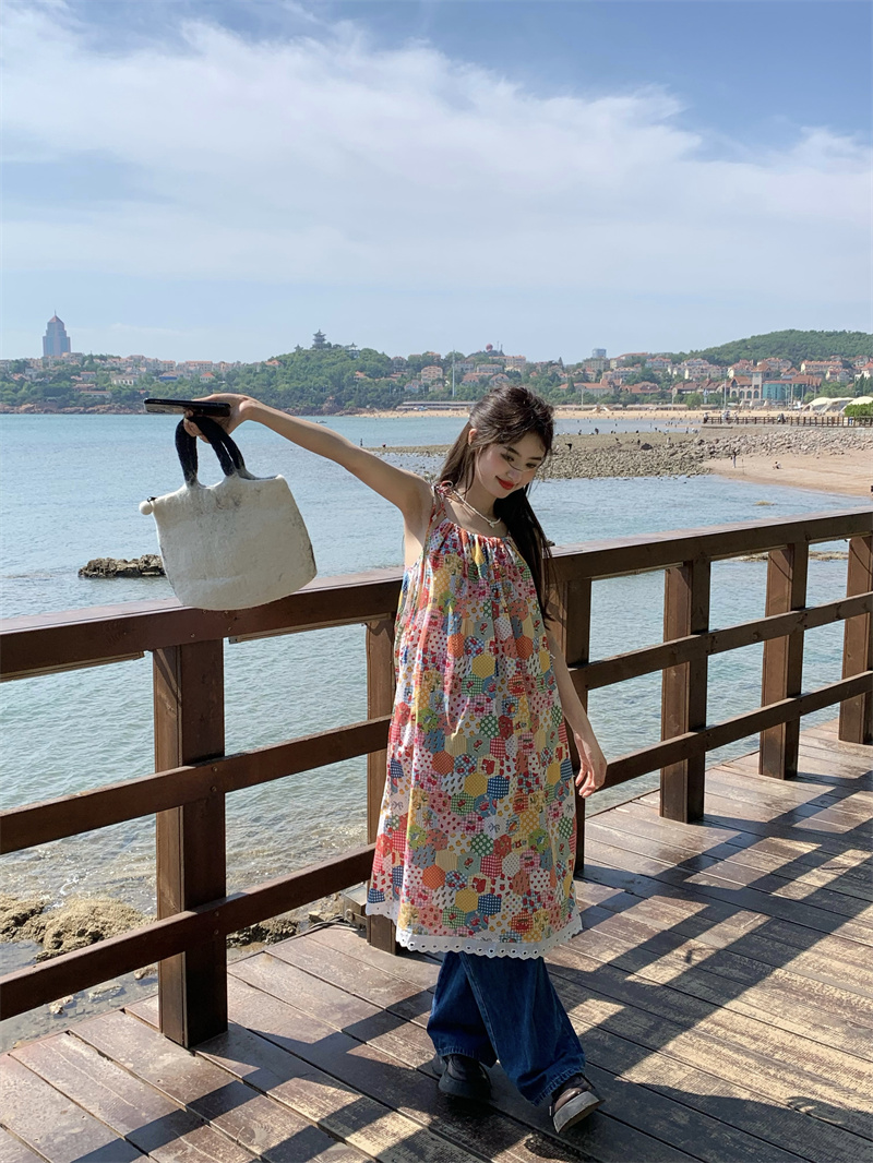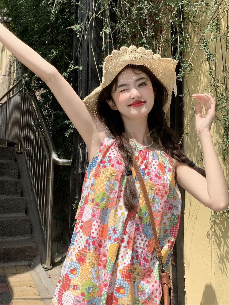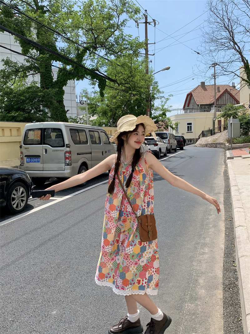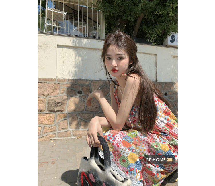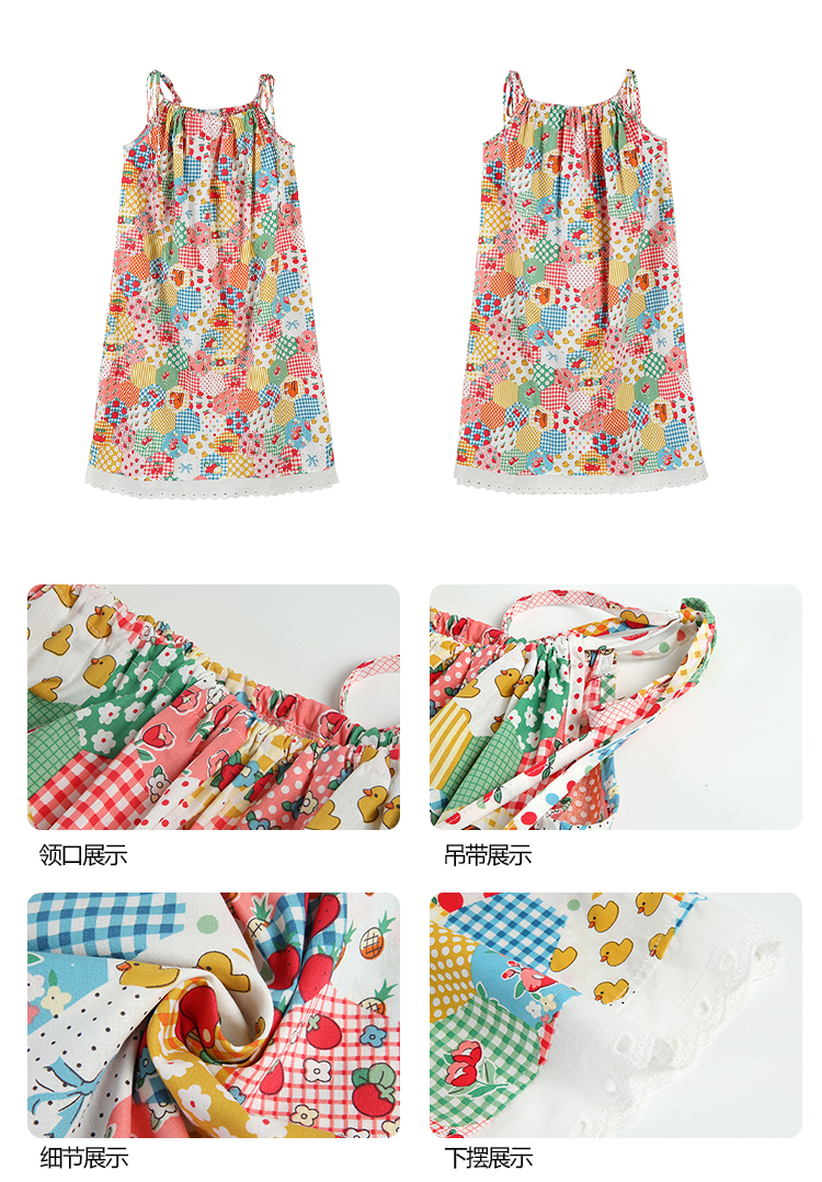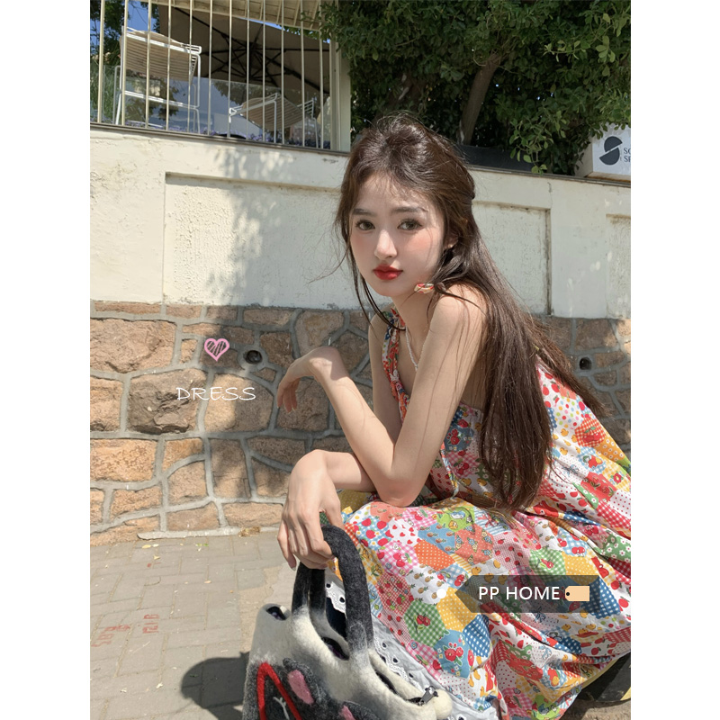 PPHOME嬌寵千金~清涼一甜美減齡可愛碎花拼接花邊寬鬆吊帶洋裝