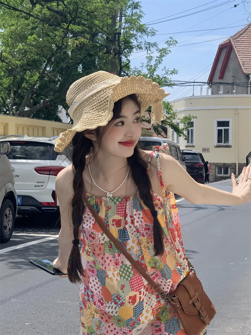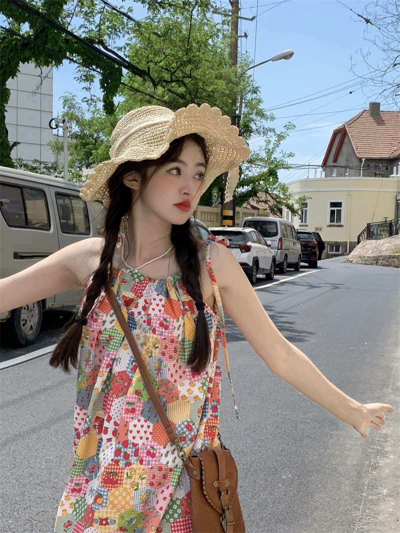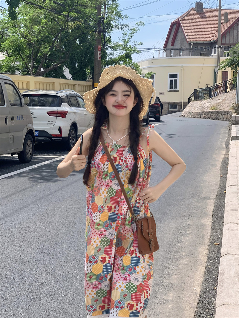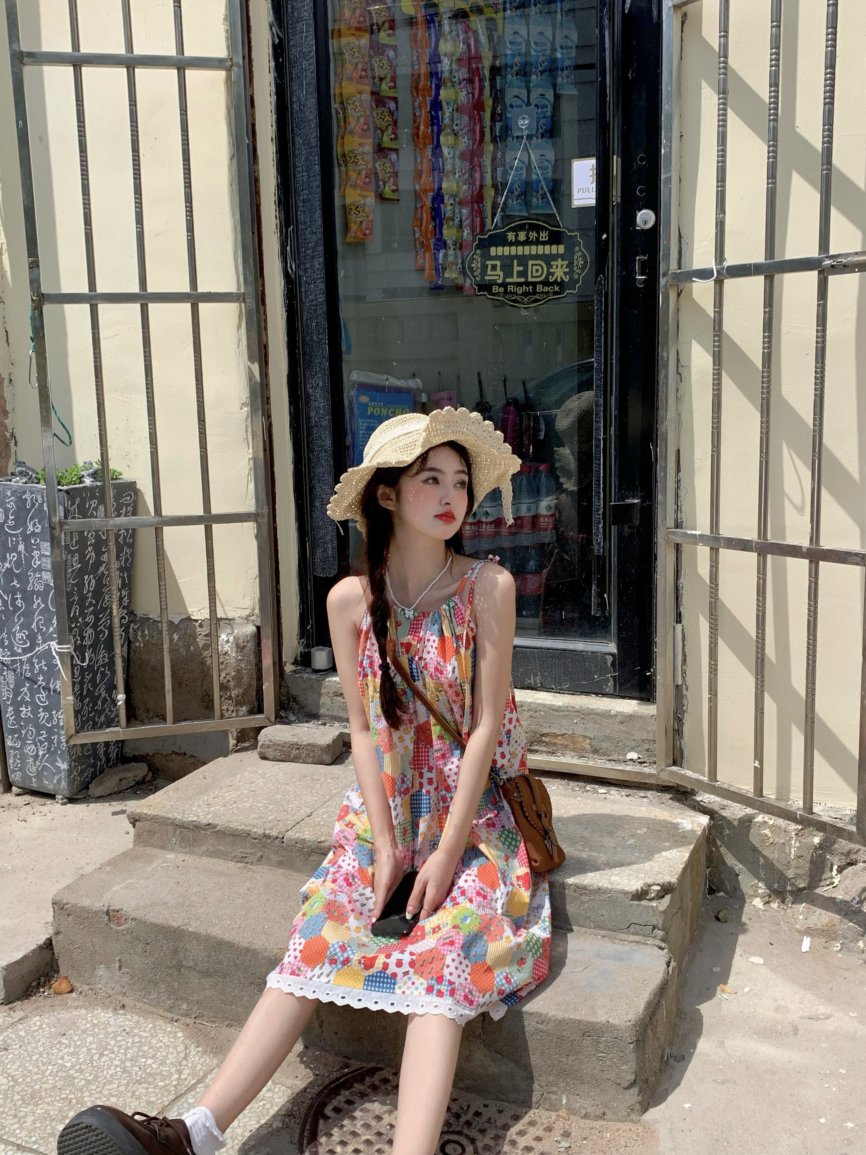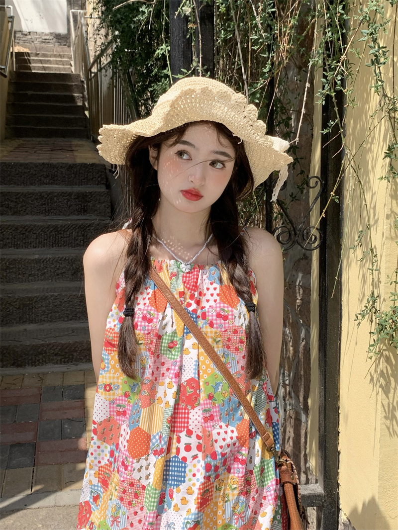 PPHOME嬌寵千金~清涼一甜美減齡可愛碎花拼接花邊寬鬆吊帶洋裝