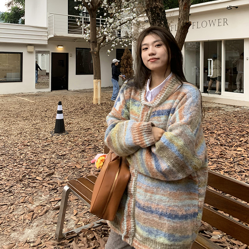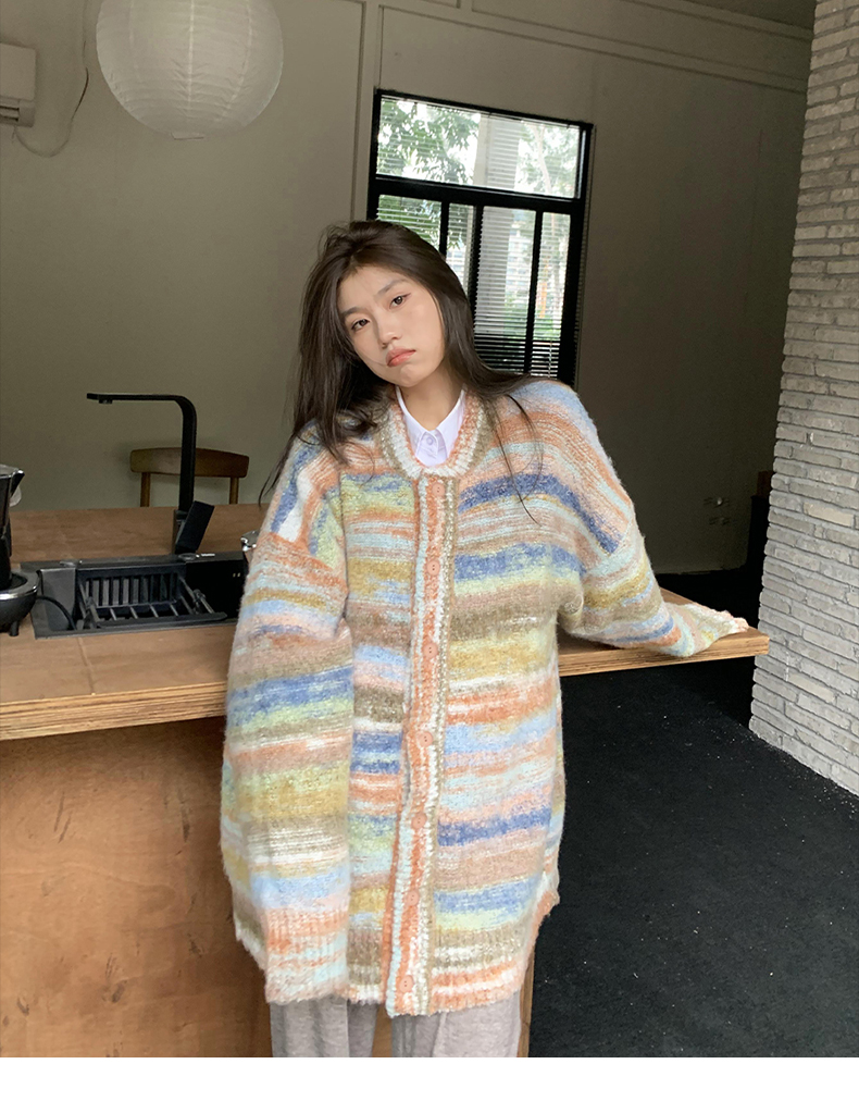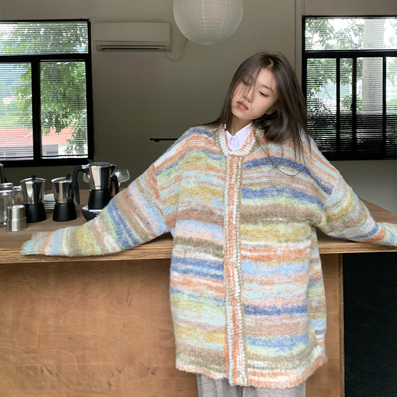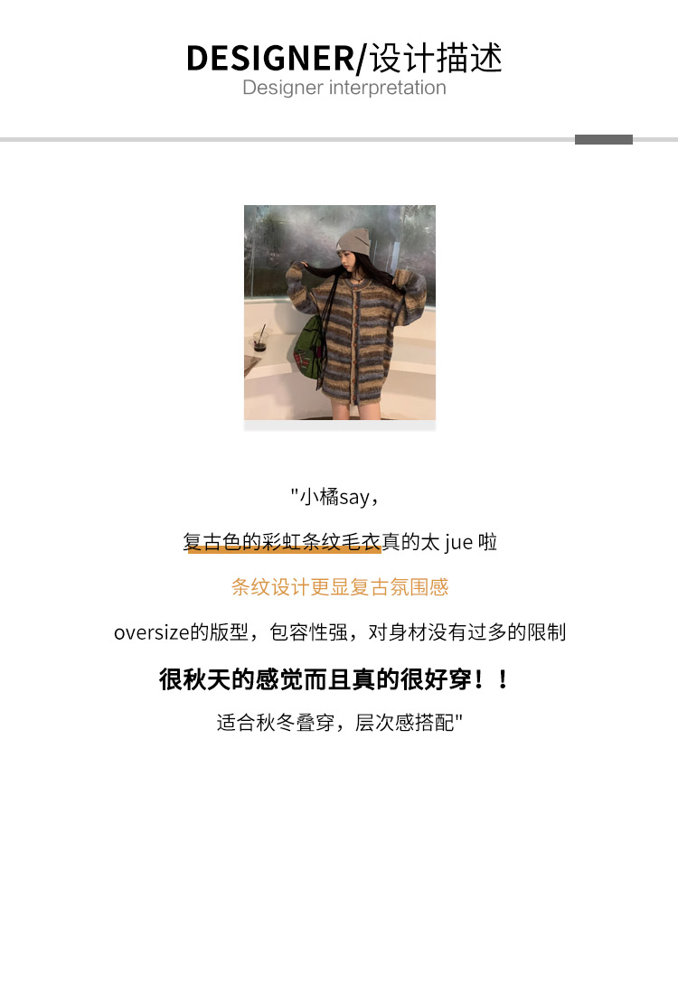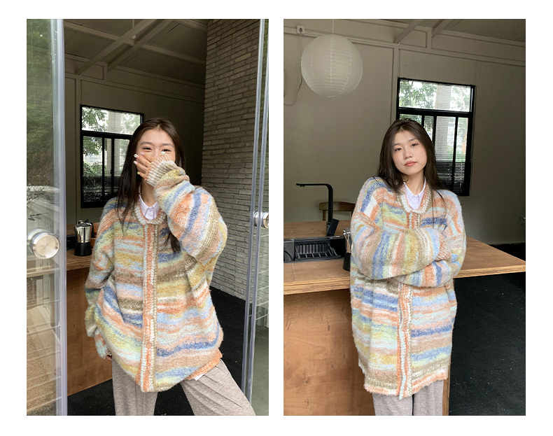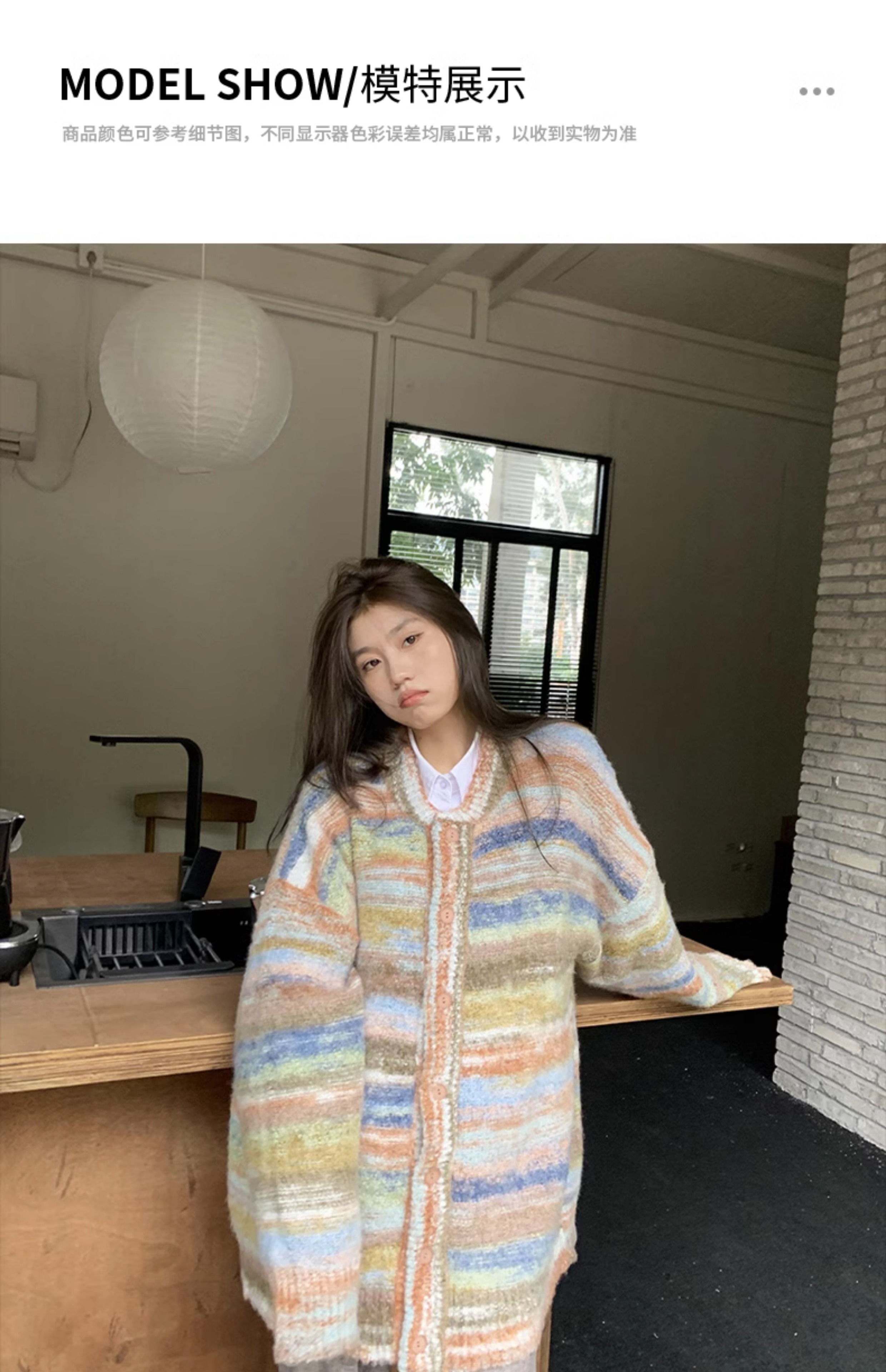 橘子樹在哪兒彩虹條紋撞色毛衣外套女秋冬氛圍感慵懶寬鬆針織開衫