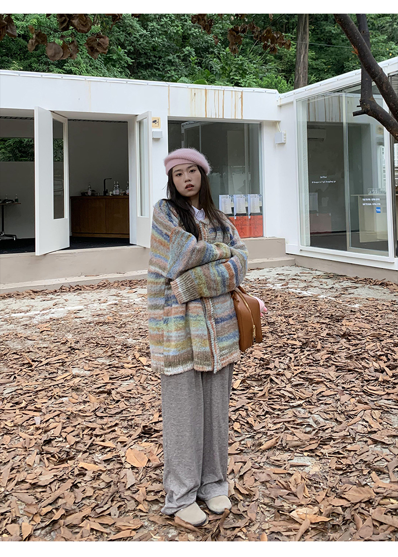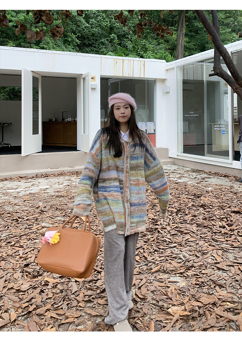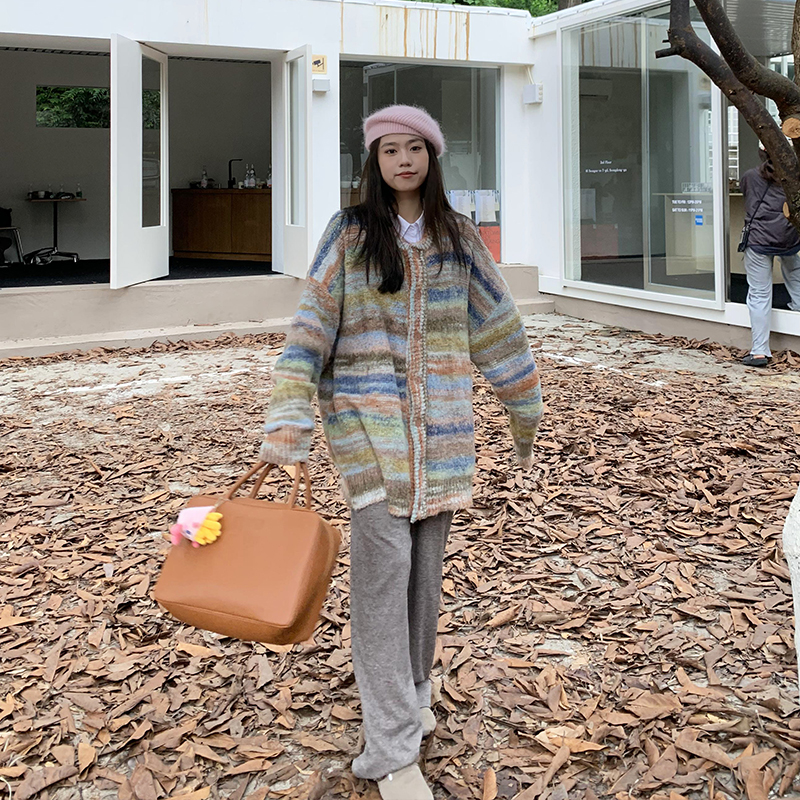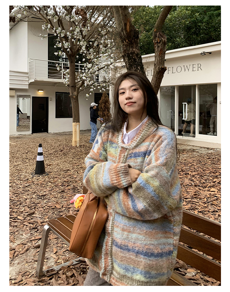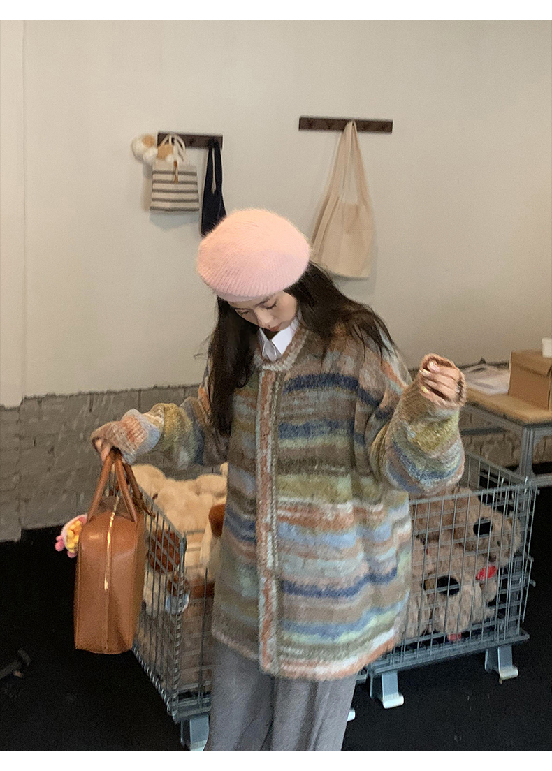 橘子樹在哪兒彩虹條紋撞色毛衣外套女秋冬氛圍感慵懶寬鬆針織開衫