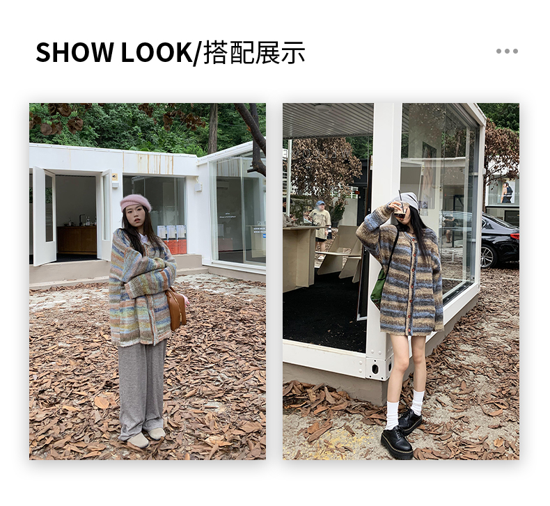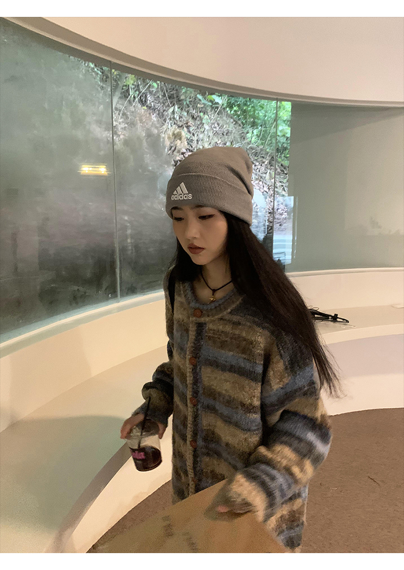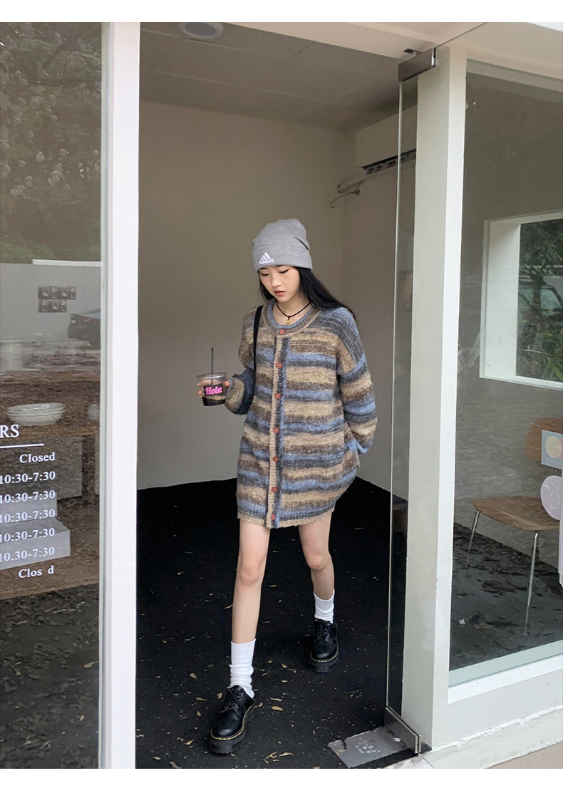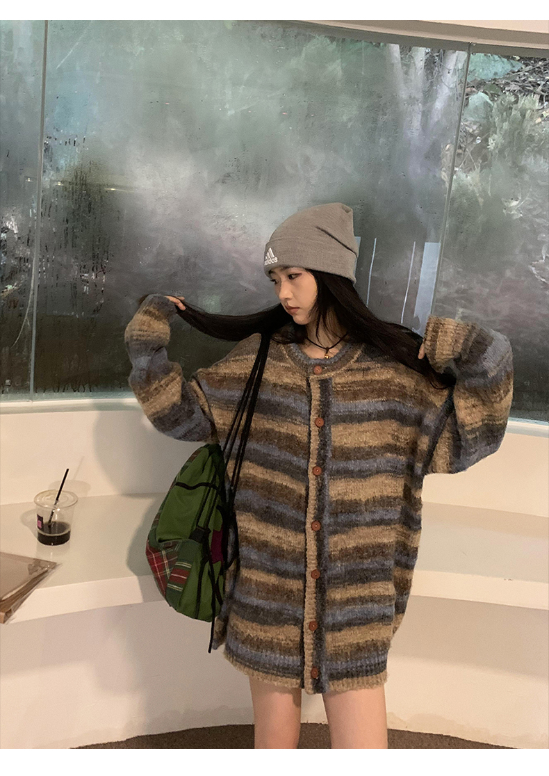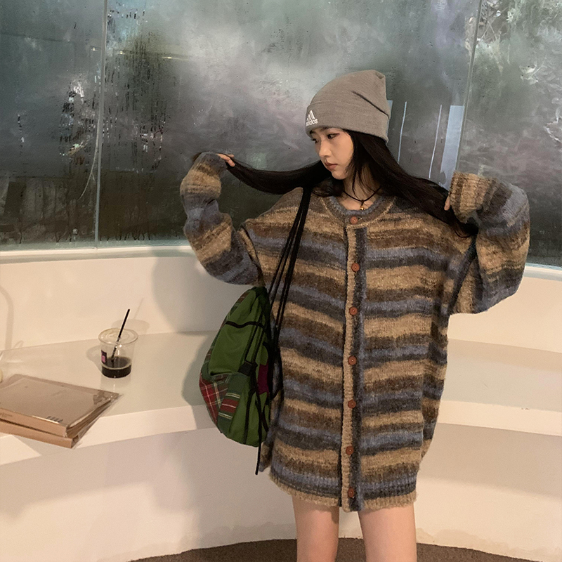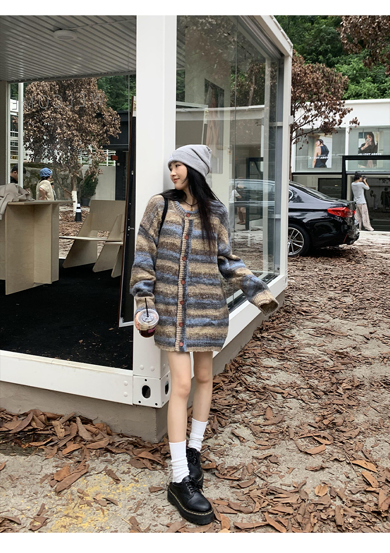 橘子樹在哪兒彩虹條紋撞色毛衣外套女秋冬氛圍感慵懶寬鬆針織開衫