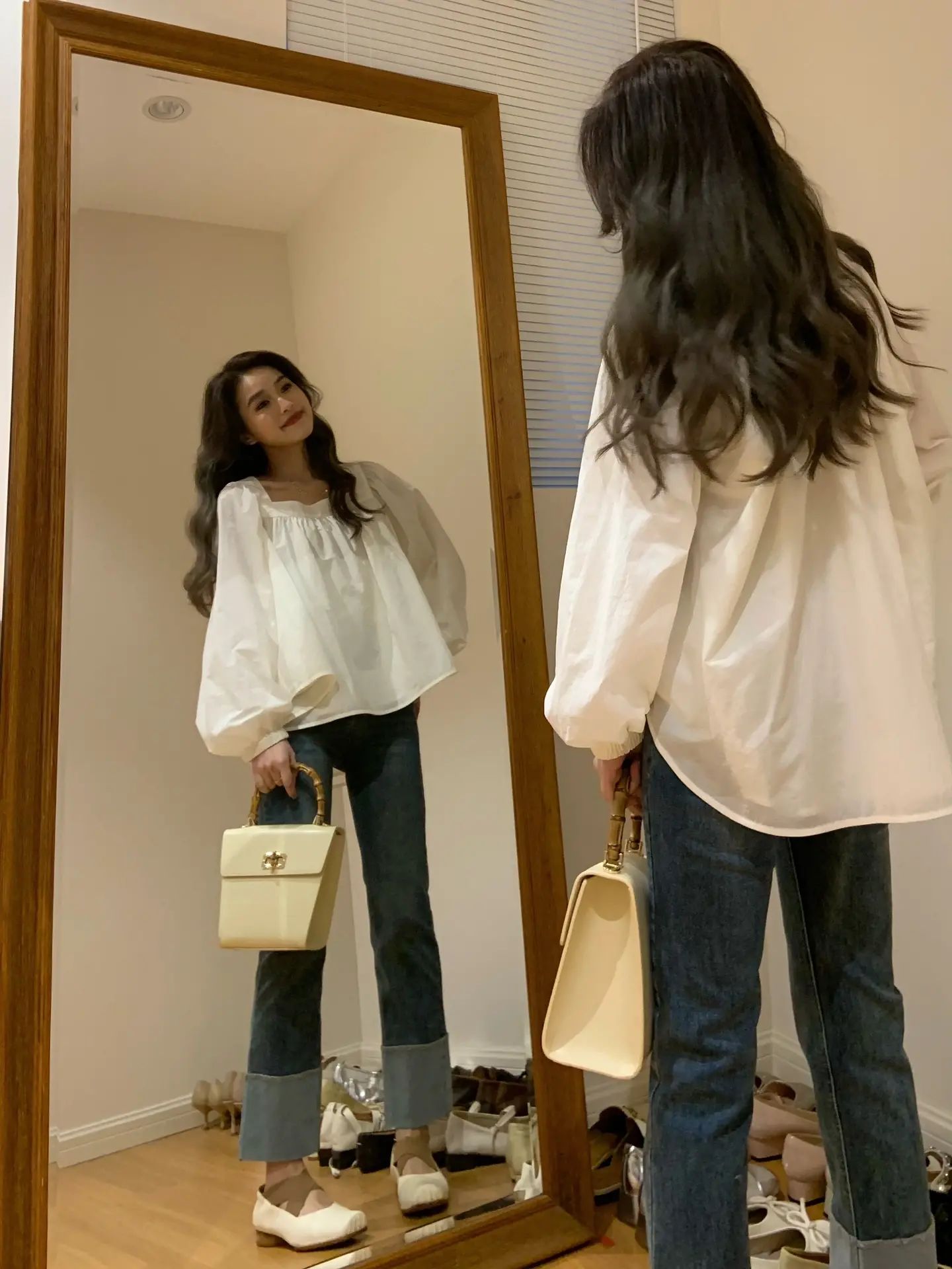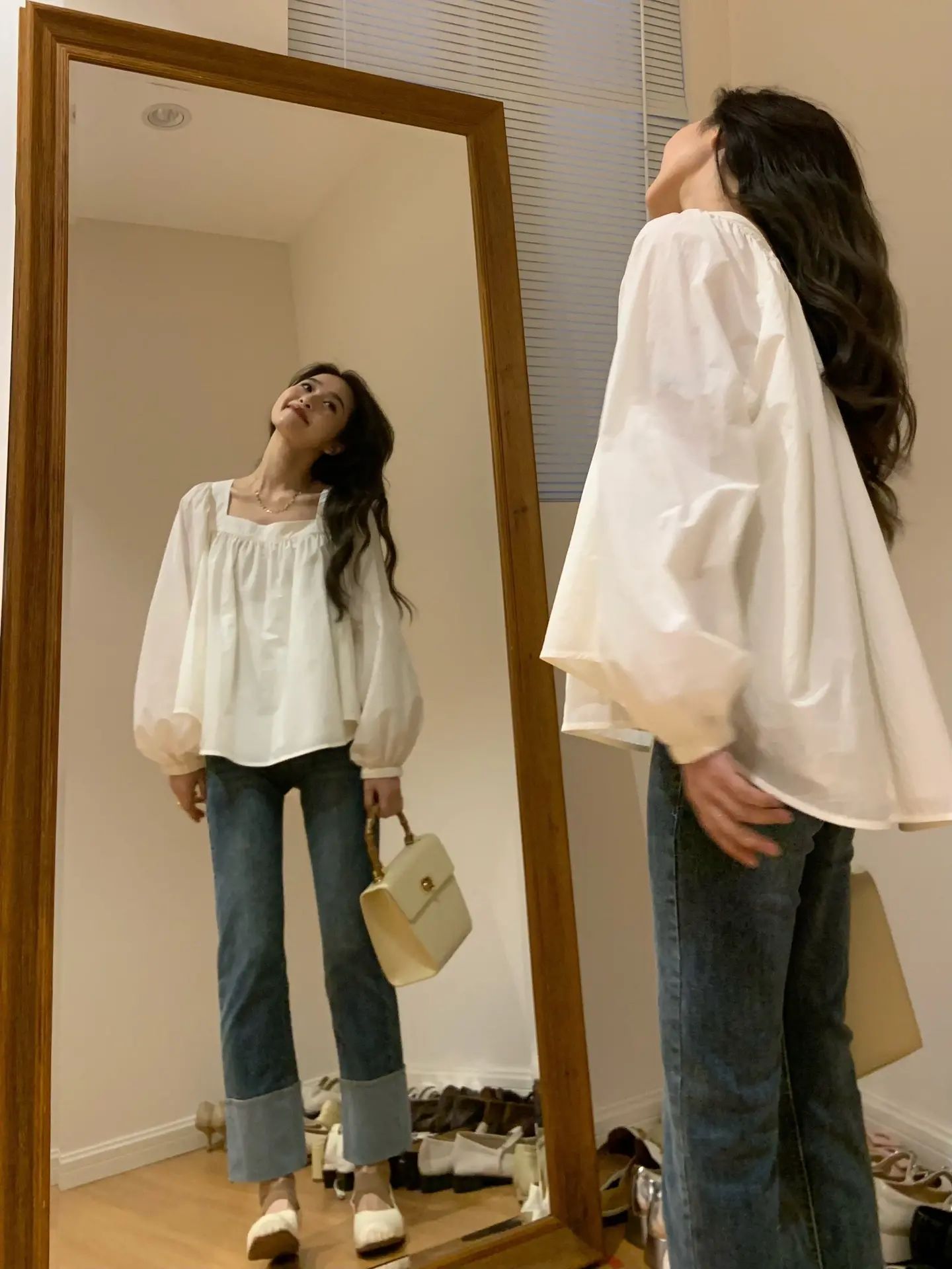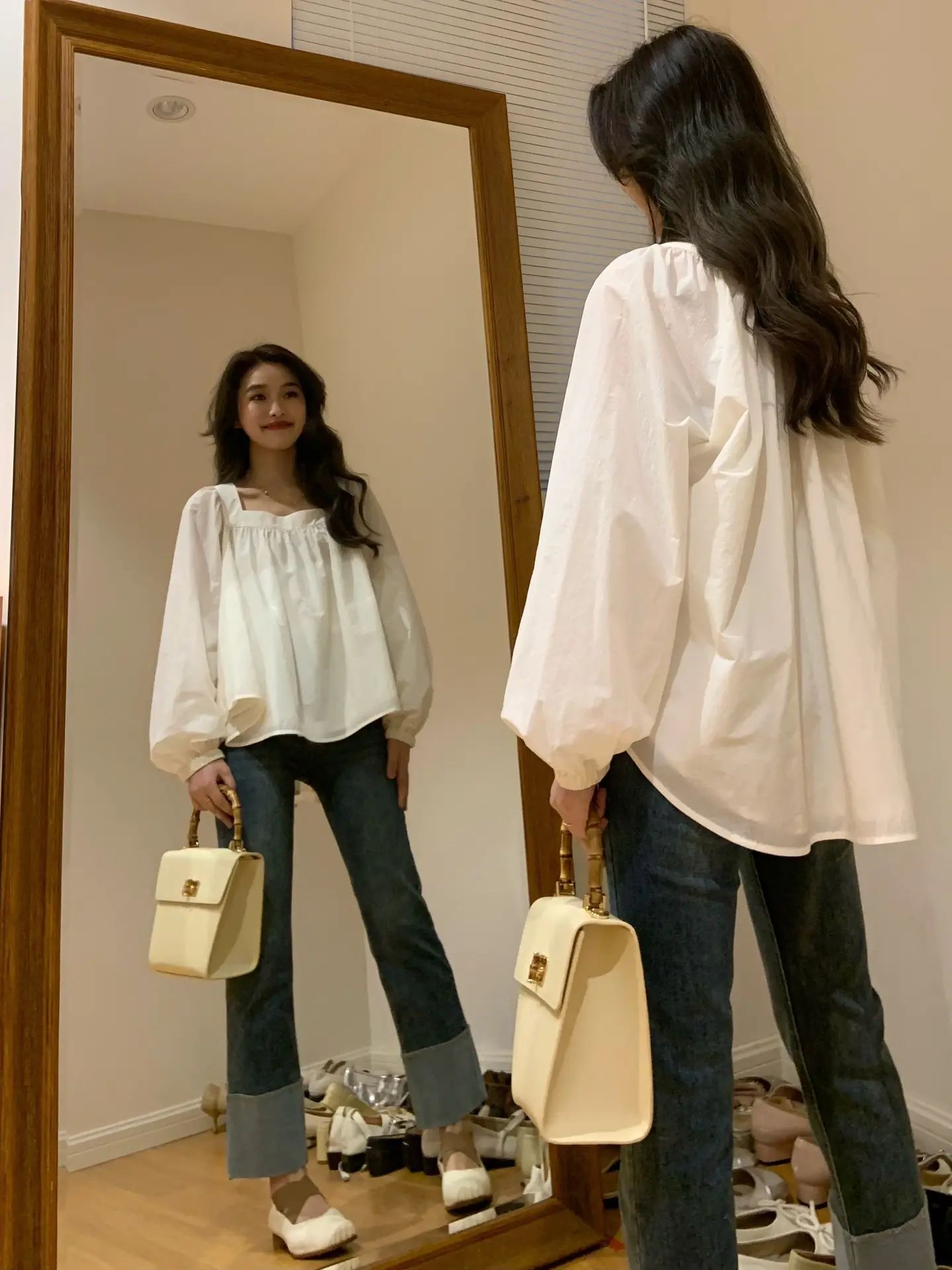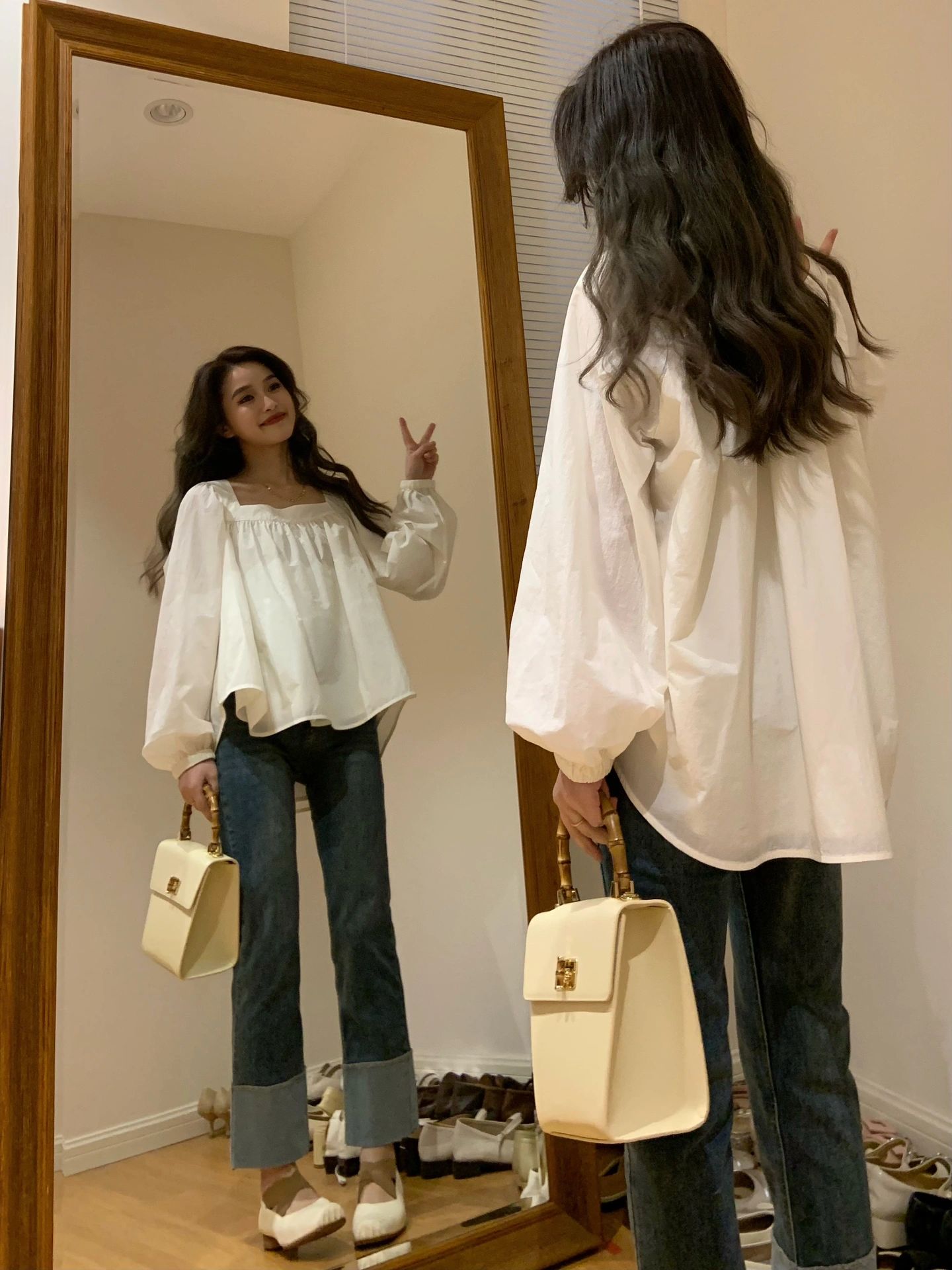 法式復古方領泡泡袖t襯衫女秋季白色襯衣防曬衫寬鬆高級感雪紡上衣