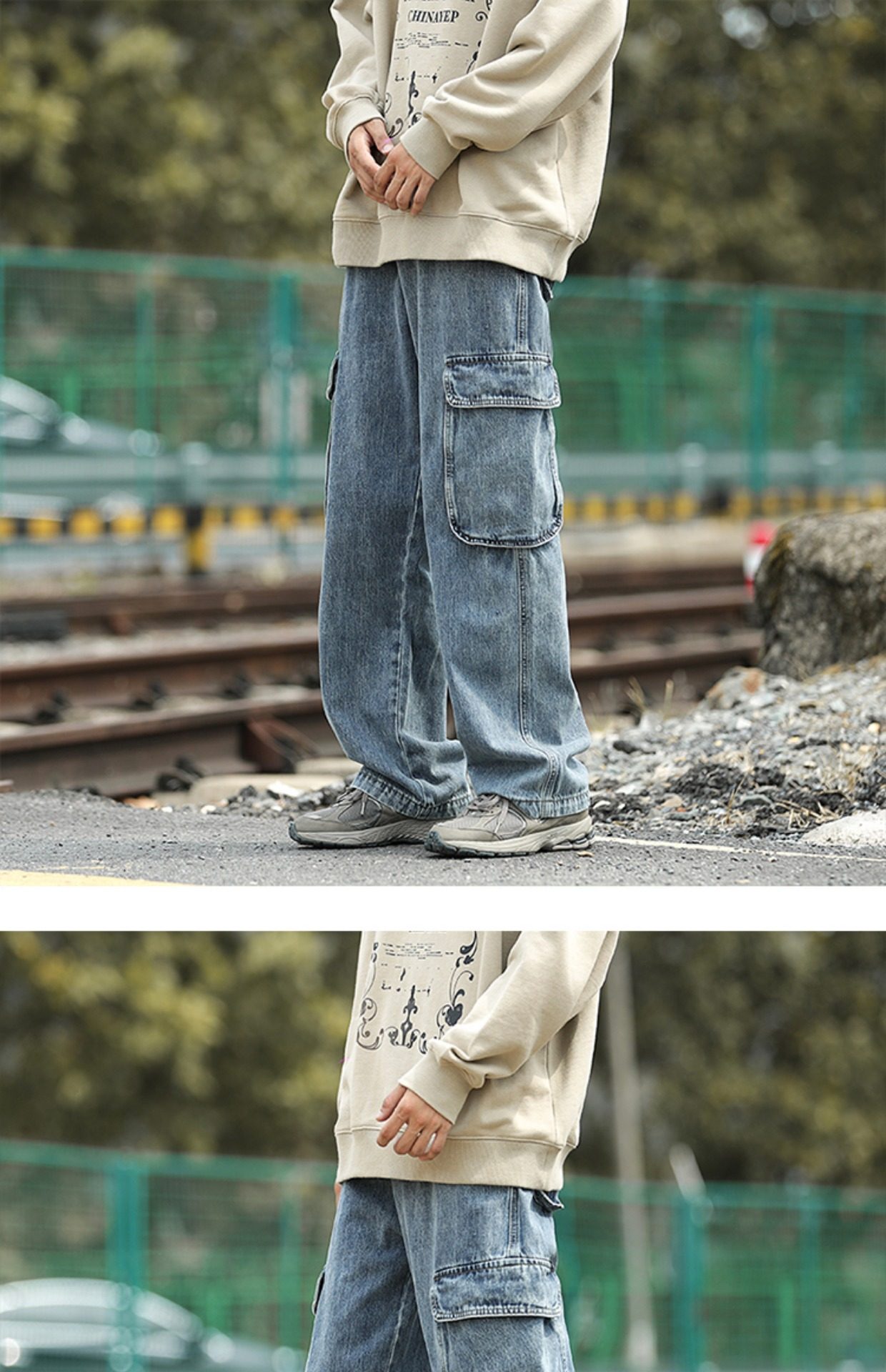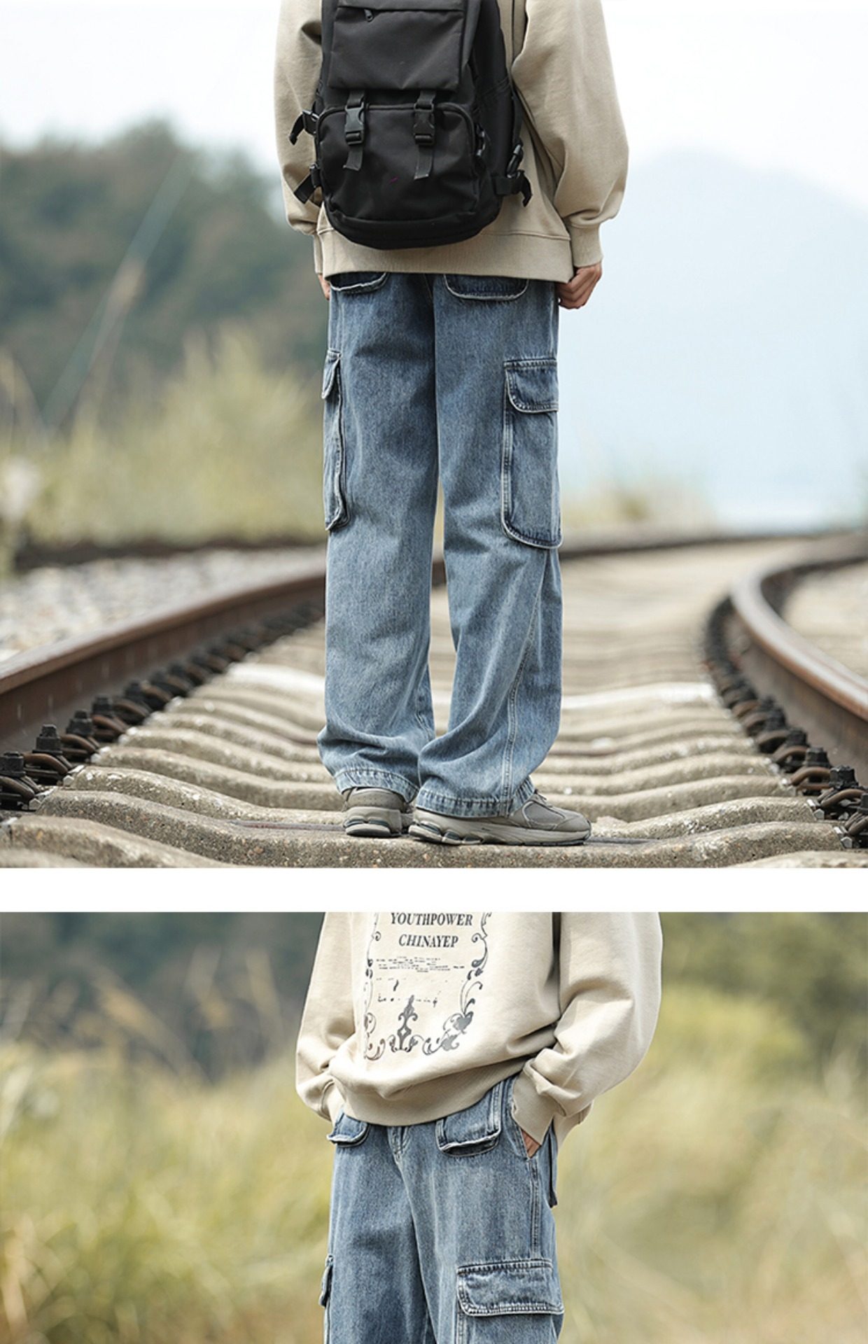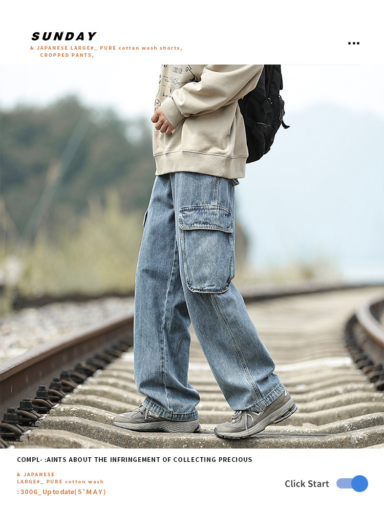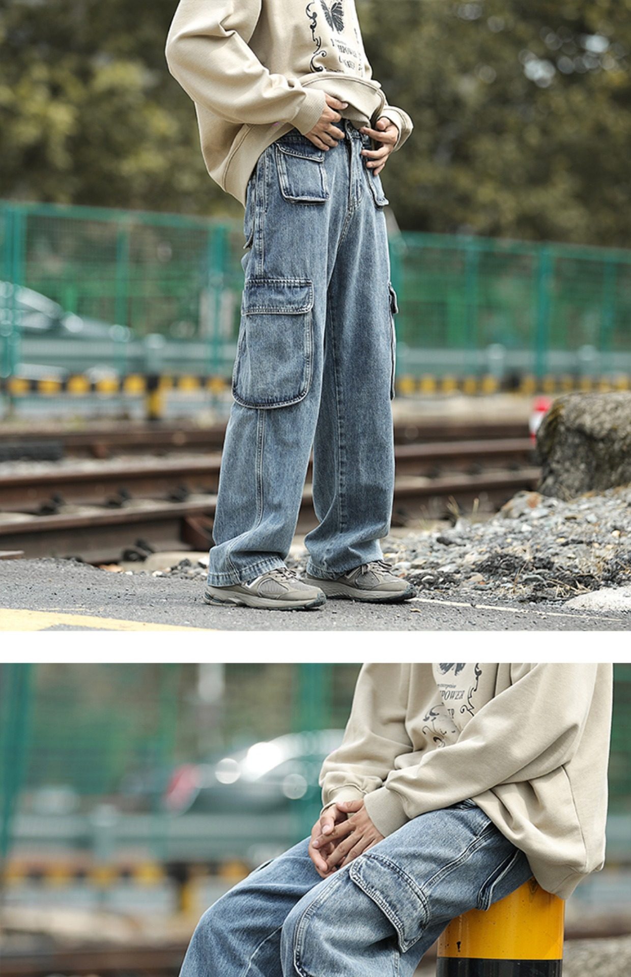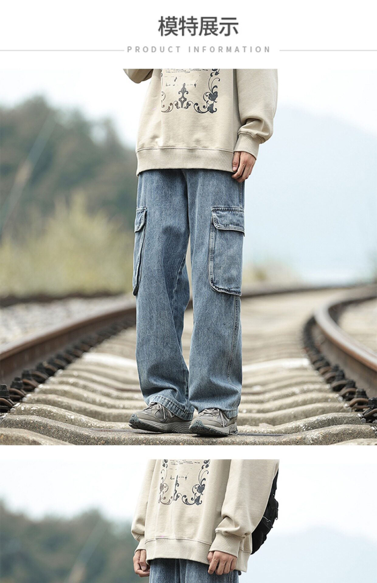 日系復古多口袋工裝牛仔褲男秋季高街ins潮牌復古寬鬆直筒寬褲