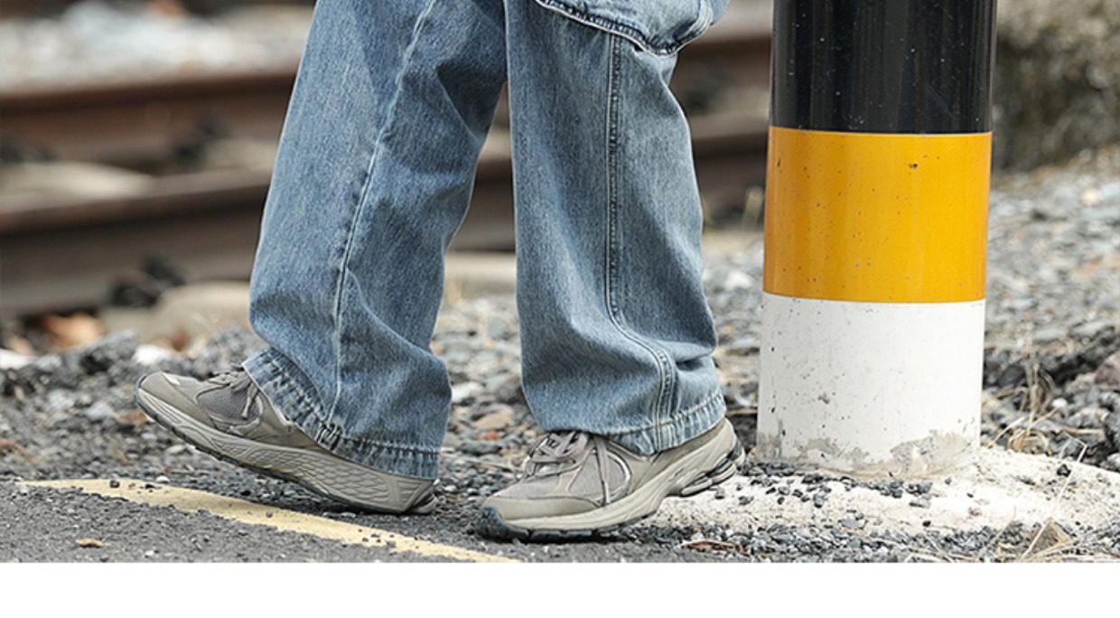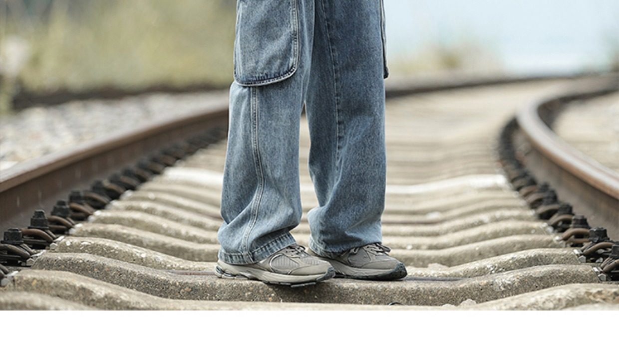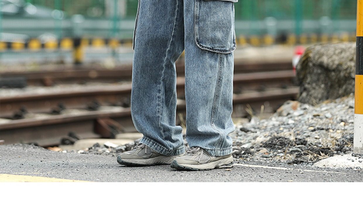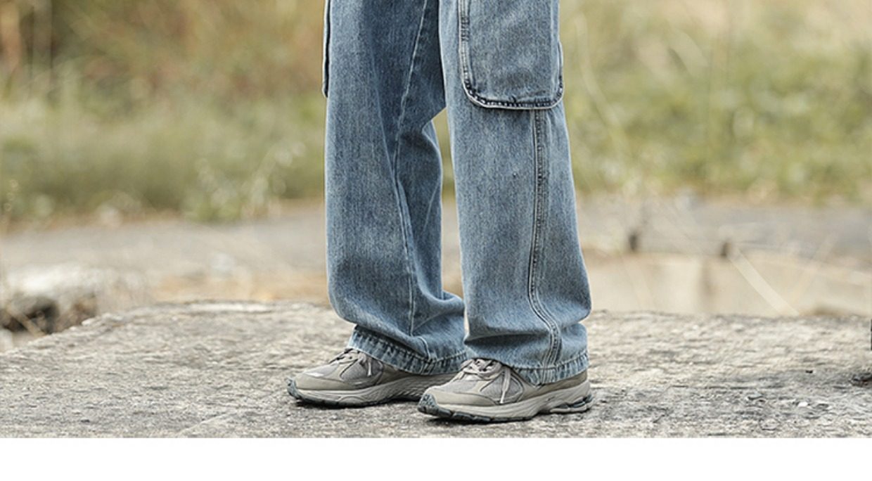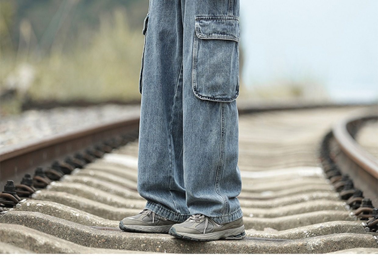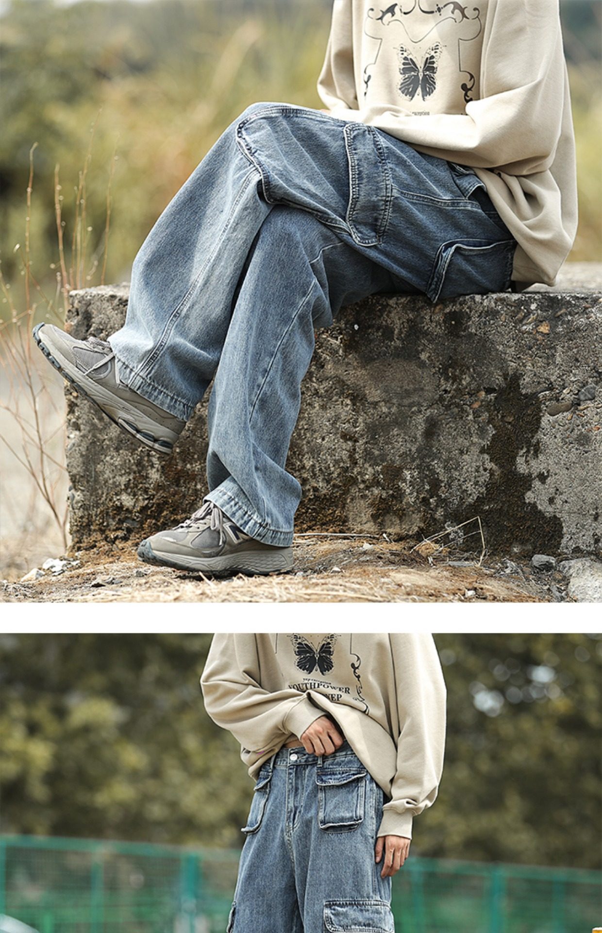 日系復古多口袋工裝牛仔褲男秋季高街ins潮牌復古寬鬆直筒寬褲