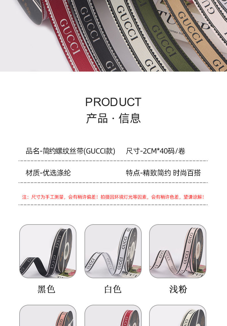 颜色 黑色【 GUCCI丝带】2CM*40码/卷,纯白【 GUCCI丝带】2CM*40码/卷,米白【 GUCCI丝带】2CM*40码/卷,卡其【 GUCCI丝带】2CM*40码/卷,韩粉【 GUCCI丝带】2CM*40码/卷,浅粉【 GUCCI丝带】2CM*40码/卷,军绿【 GUCCI丝带】2CM*40码/卷,酒红【 GUCCI丝带】2CM*40码/卷,黑色【小香风丝带】2CM*40码/卷,白色【小香风丝带】2CM*40码/卷,米白【小香风丝带】2CM*40码/卷,酒红【小香风丝带】2CM*40码/卷,浅粉【小香风丝带】2CM*40码/卷,抹茶【小香风丝带】2CM*40码/卷,浅咖【小香风丝带】2CM*40码/卷,玫瑰粉【小香风丝带】2CM*40码/卷