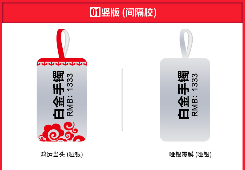 颜色 鸿运当头(铜版纸覆哑银膜、间隔胶)76*30*1000,雍容华贵(铜版纸覆亮白膜、间隔胶)76*25*1000,紫气东来(铜版纸覆亮白膜、穿孔)50*19*1000,空白(铜版纸覆哑银膜、间隔胶)76*30*1000,空白(铜版纸覆亮白膜、间隔胶)76*25*1000,空白(铜版纸覆亮白膜、穿孔)50*19*1000
