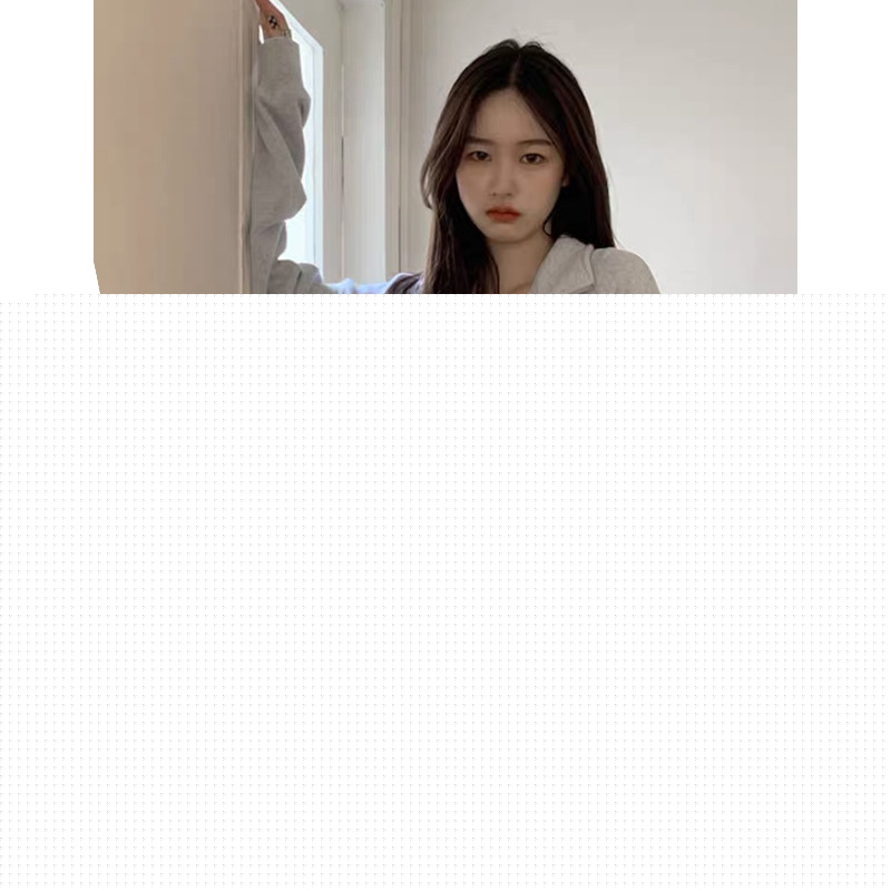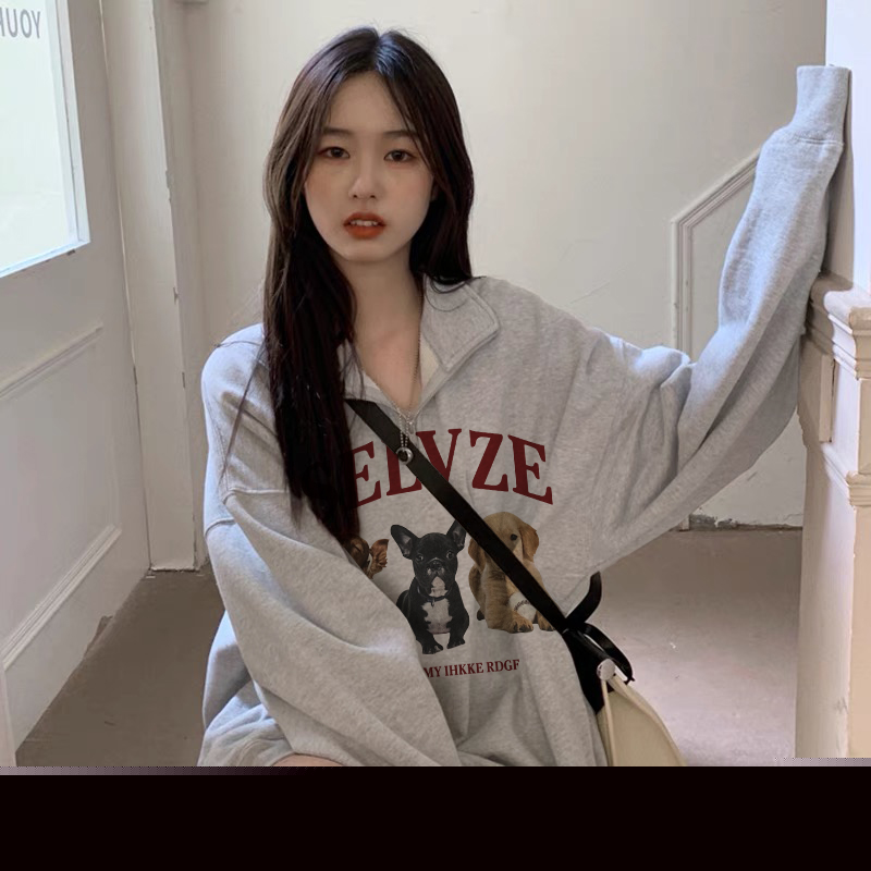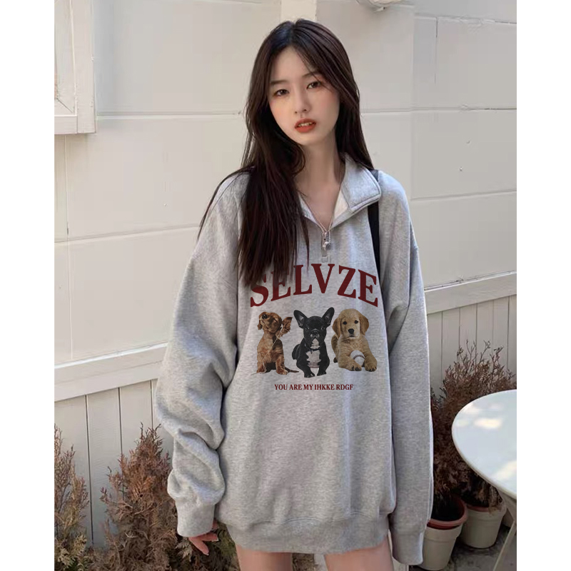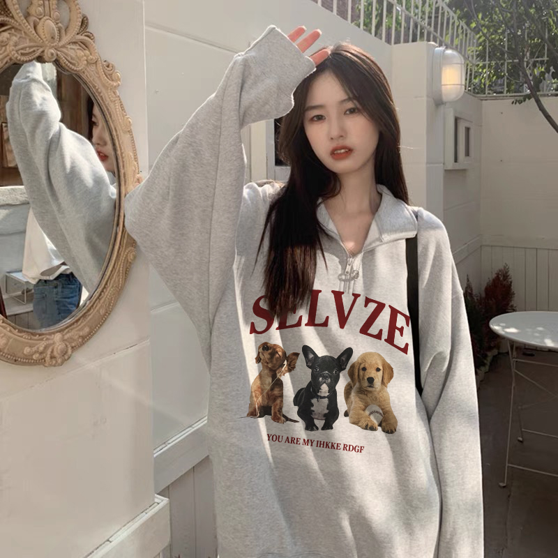 美式復古半拉鍊polo領衛衣女正肩春秋灰色上衣hiphop高街外套日系