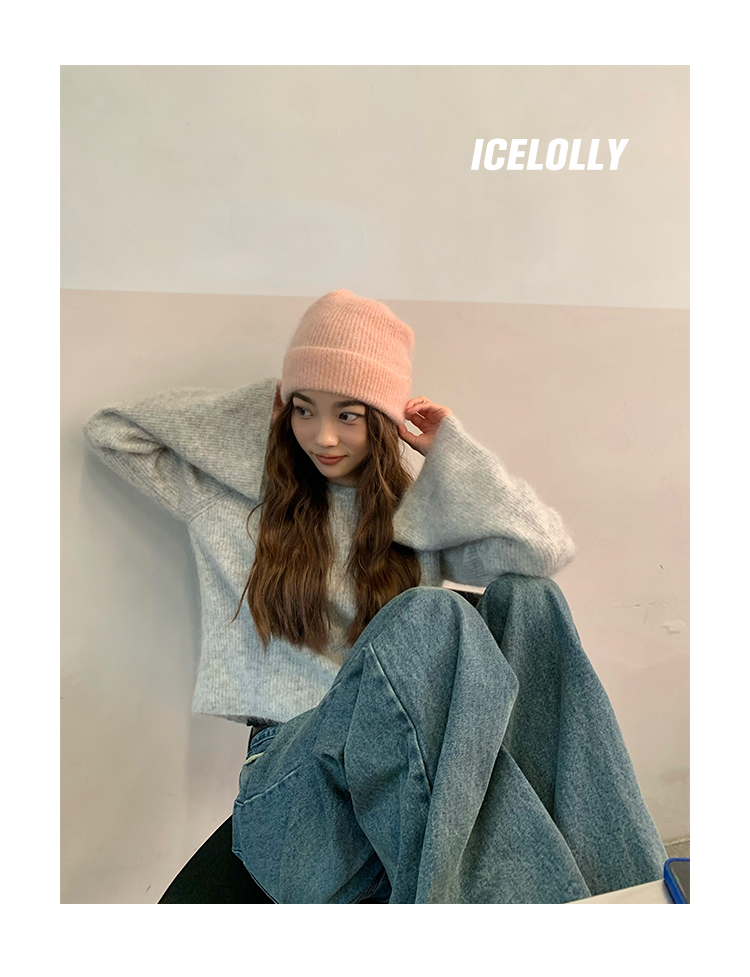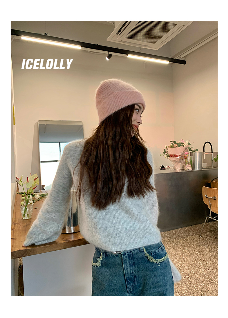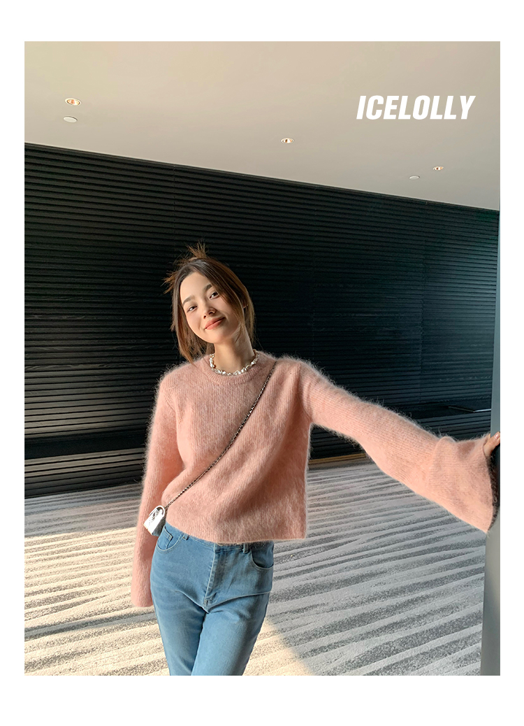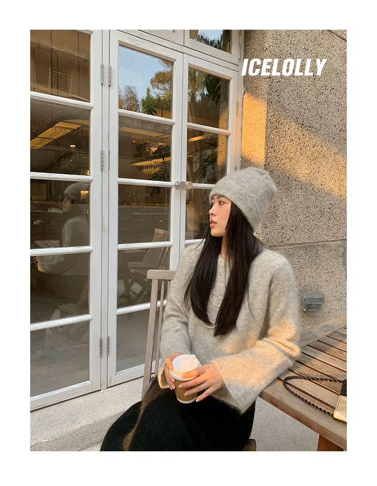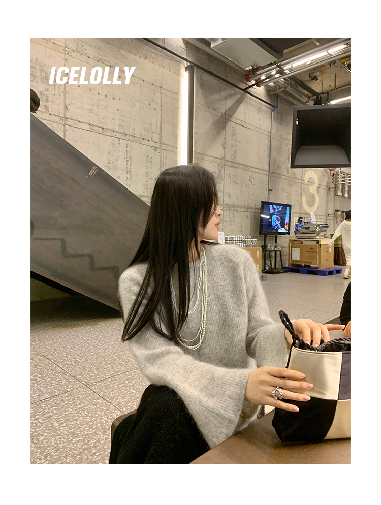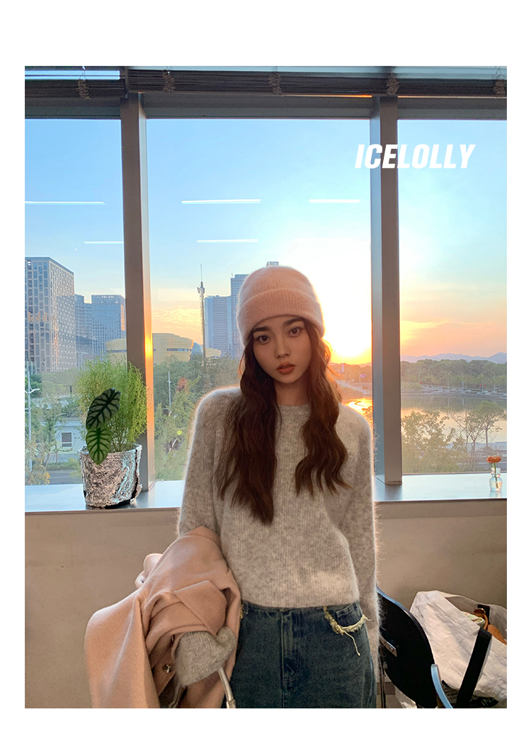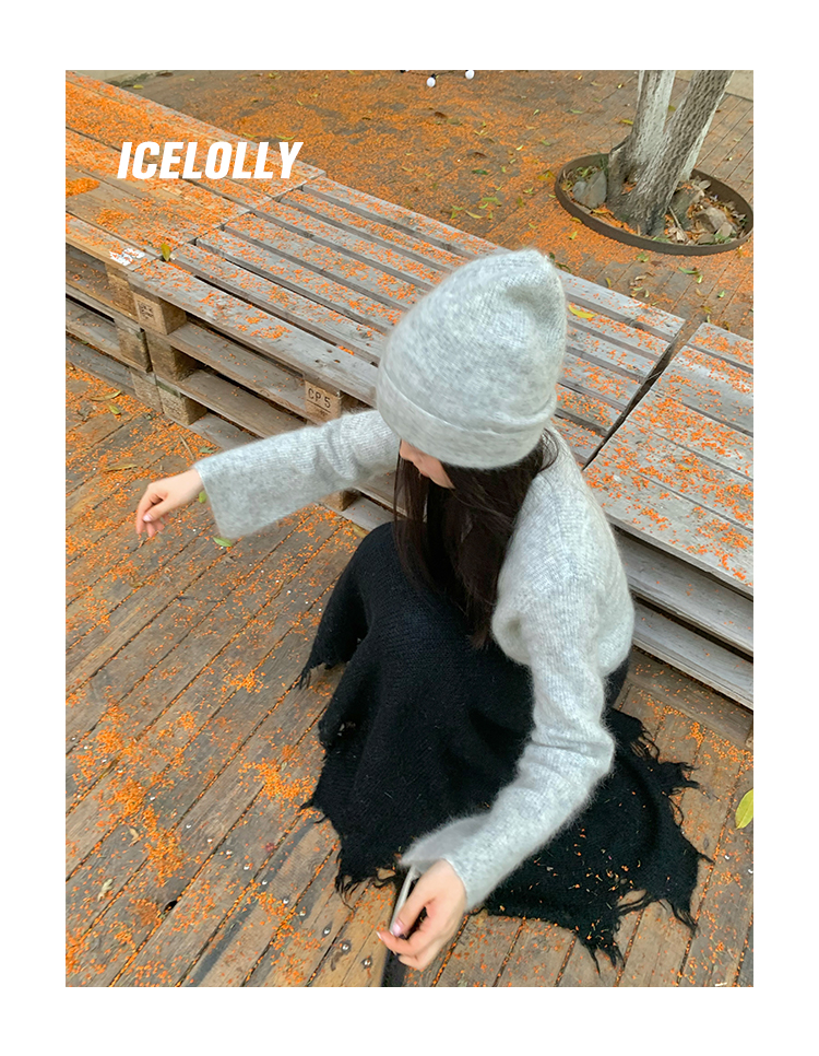 ICELOLLY溫柔風短款灰色馬海毛毛衣女秋冬打底羊毛內搭針織衫上衣