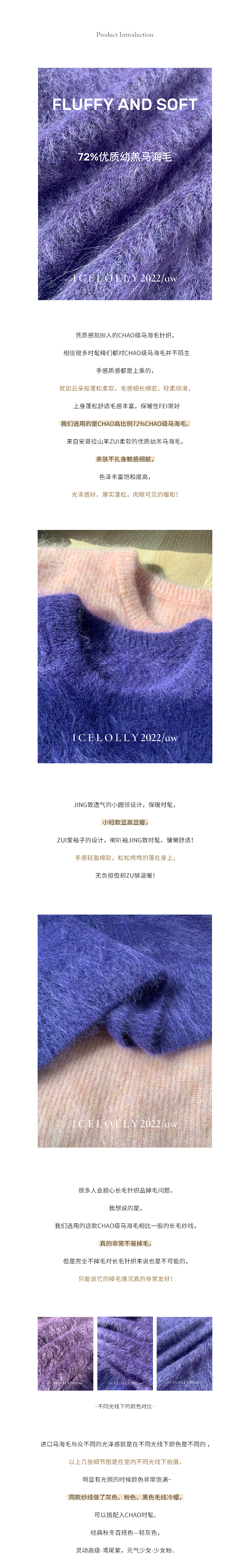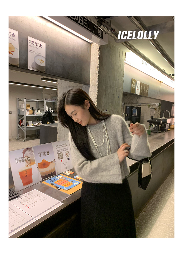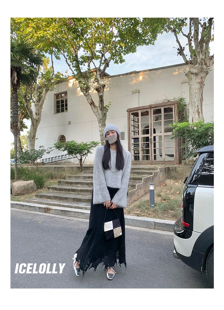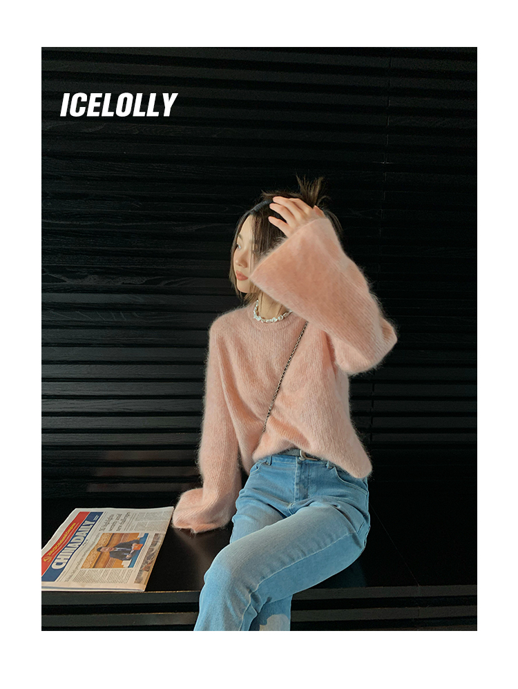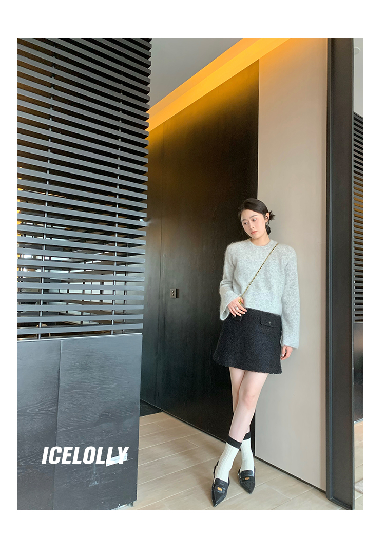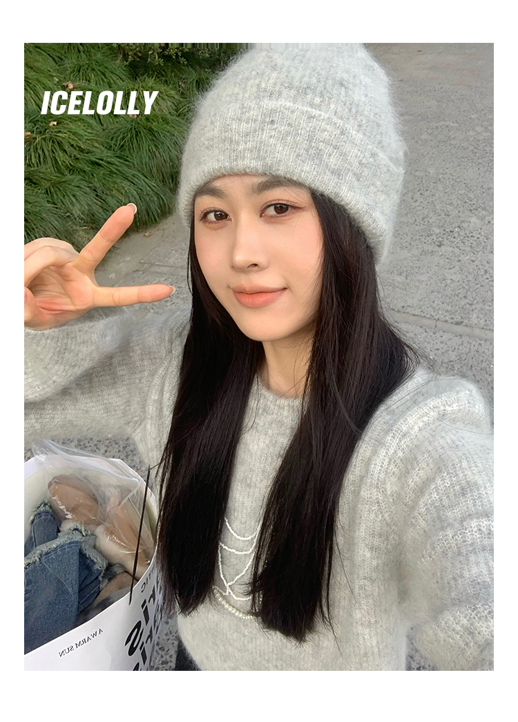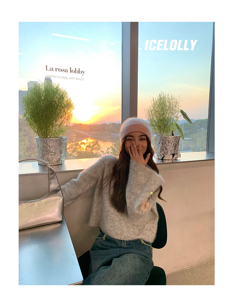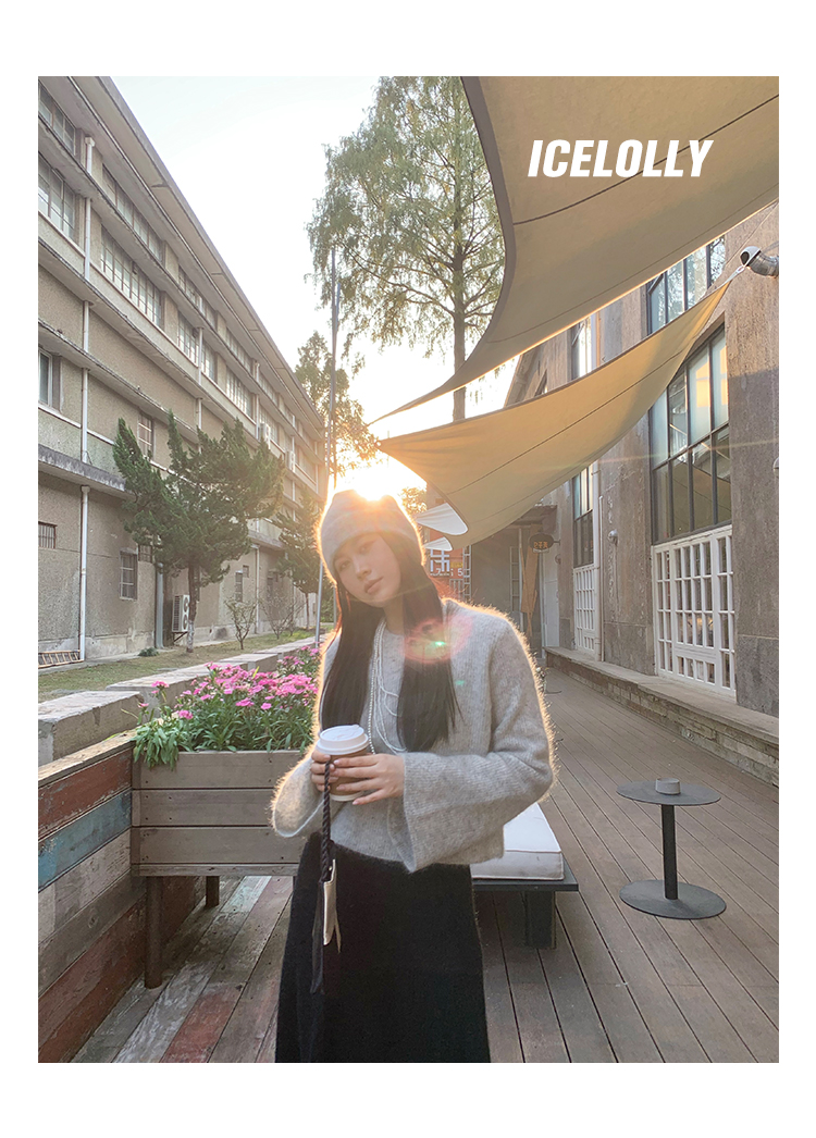 ICELOLLY溫柔風短款灰色馬海毛毛衣女秋冬打底羊毛內搭針織衫上衣