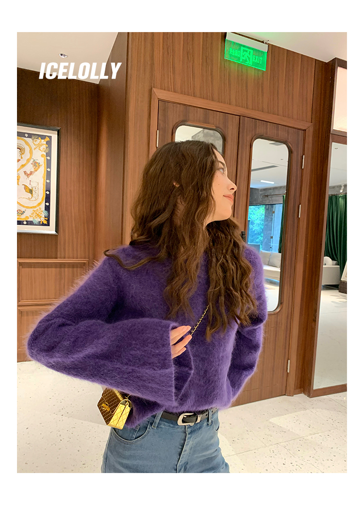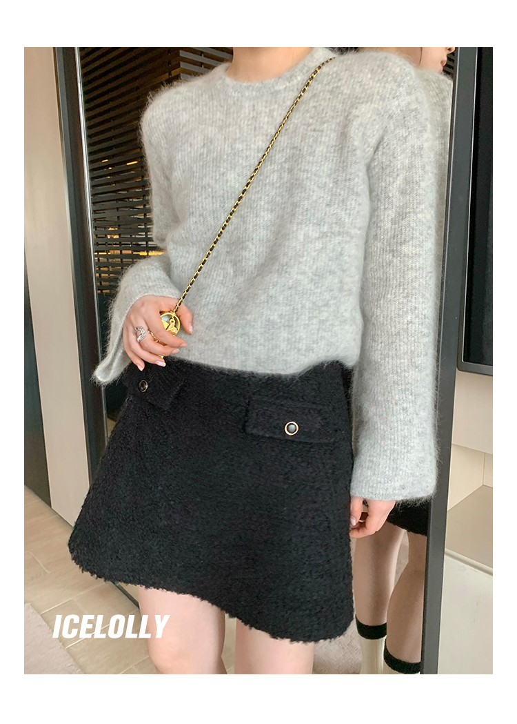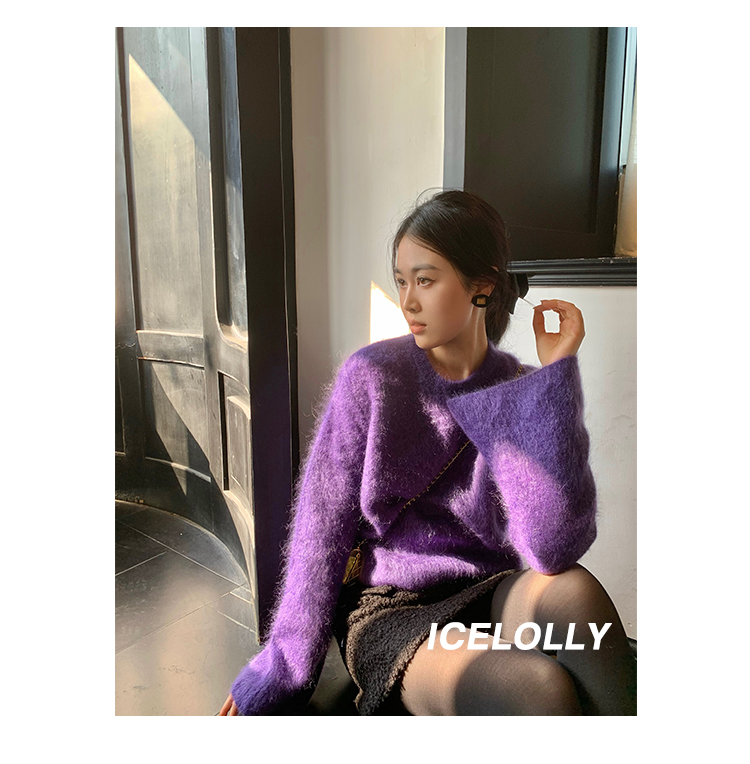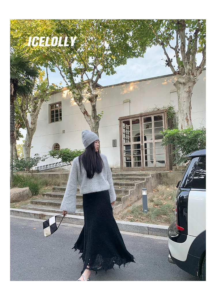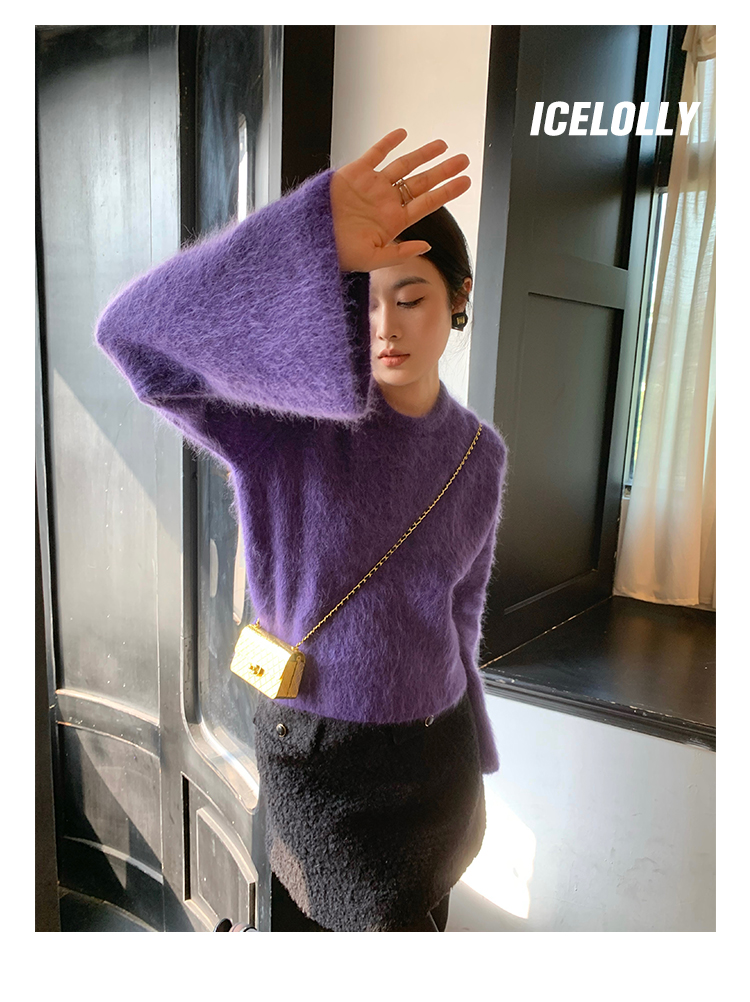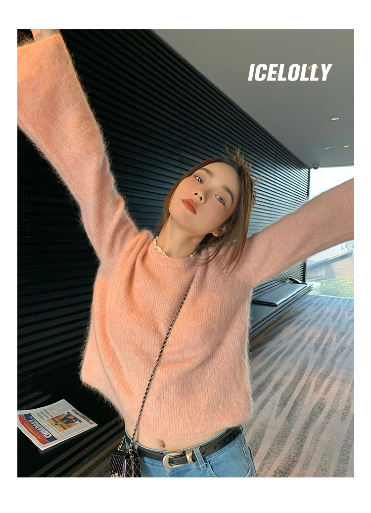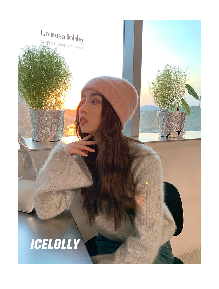 ICELOLLY溫柔風短款灰色馬海毛毛衣女秋冬打底羊毛內搭針織衫上衣