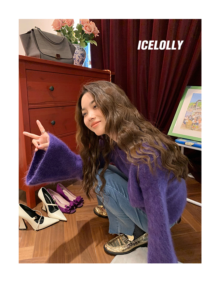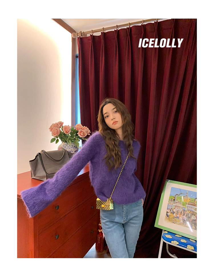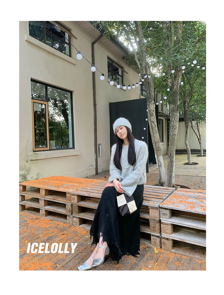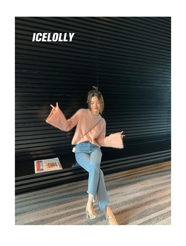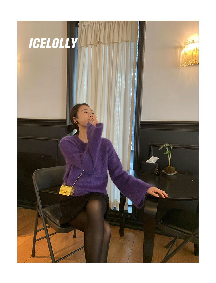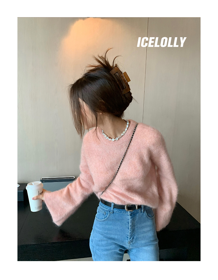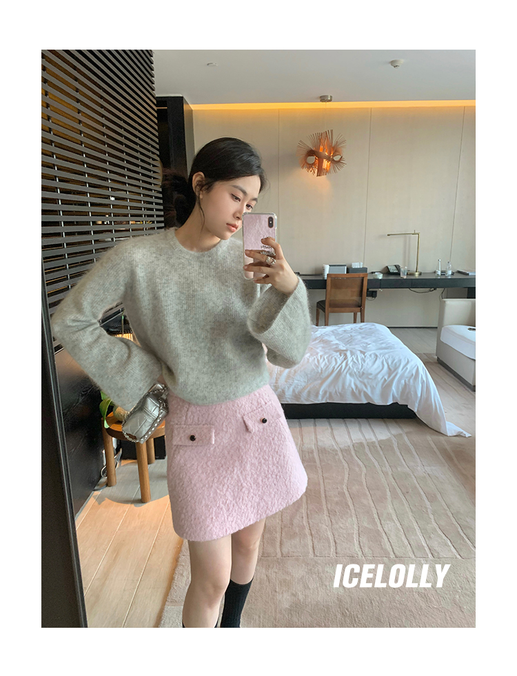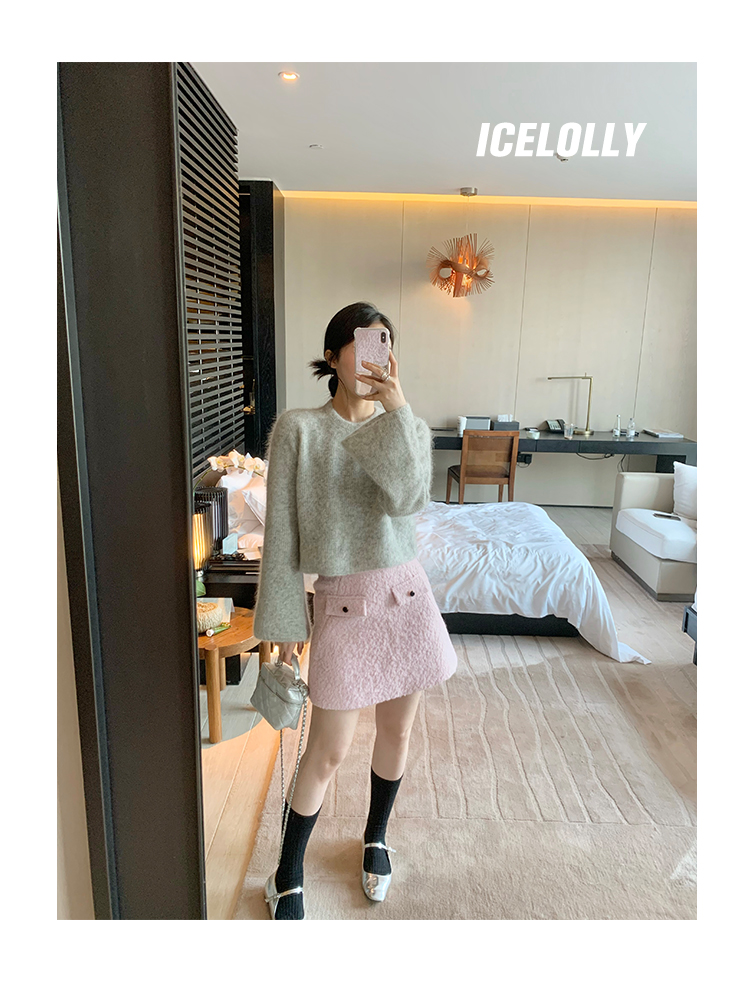 ICELOLLY溫柔風短款灰色馬海毛毛衣女秋冬打底羊毛內搭針織衫上衣
