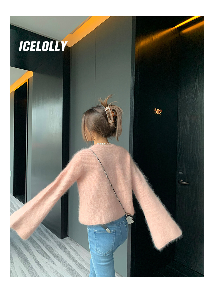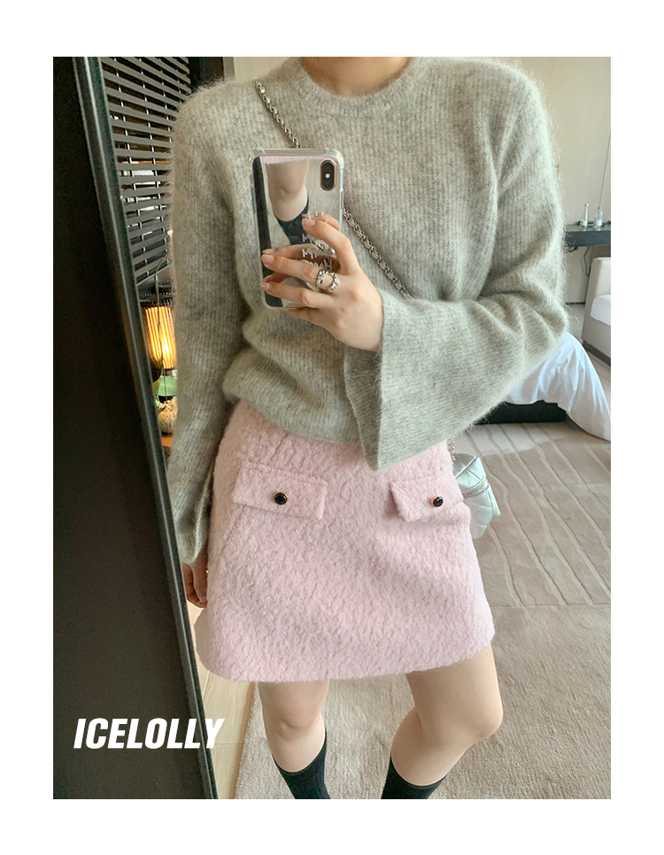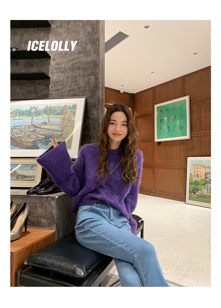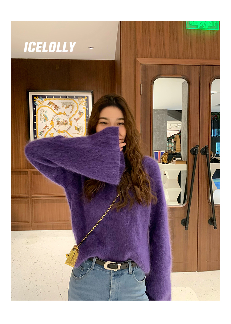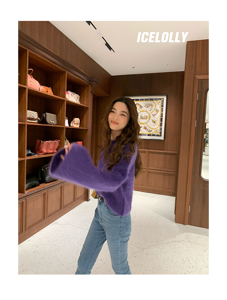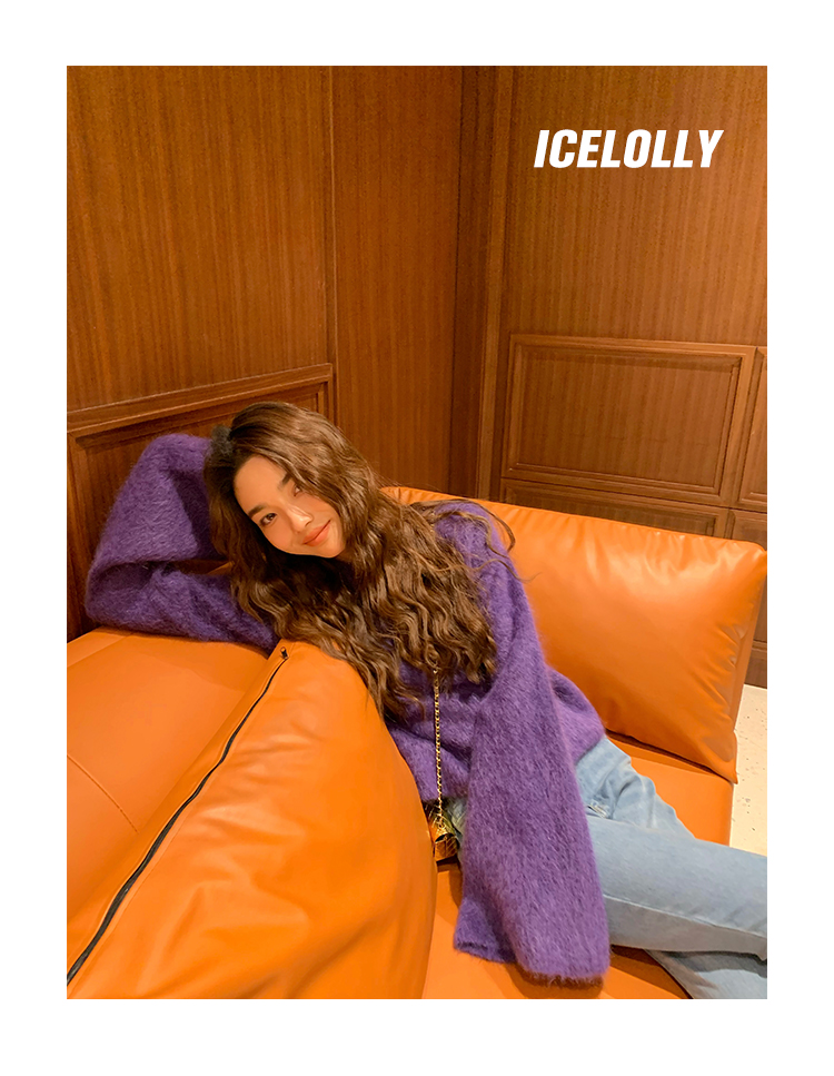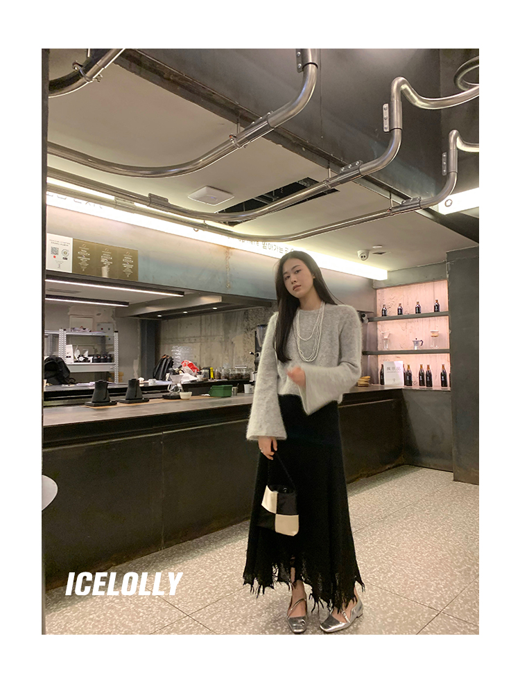 ICELOLLY溫柔風短款灰色馬海毛毛衣女秋冬打底羊毛內搭針織衫上衣
