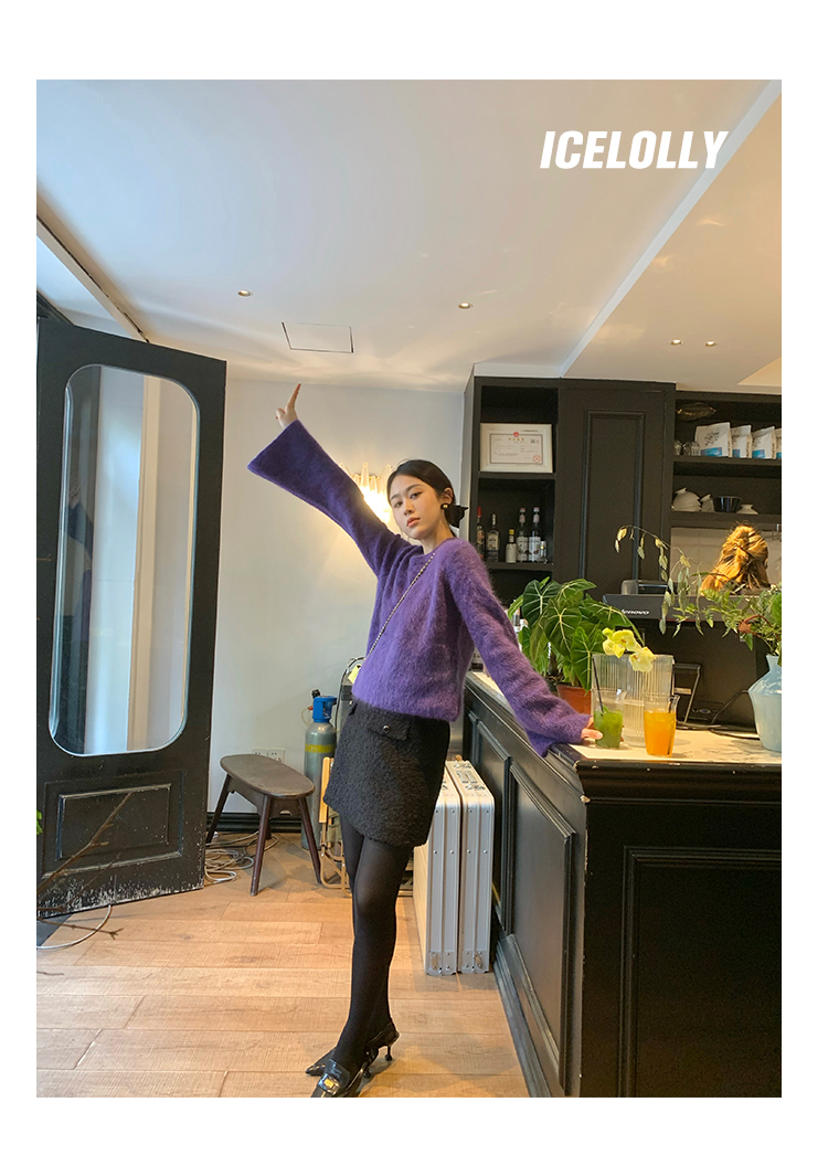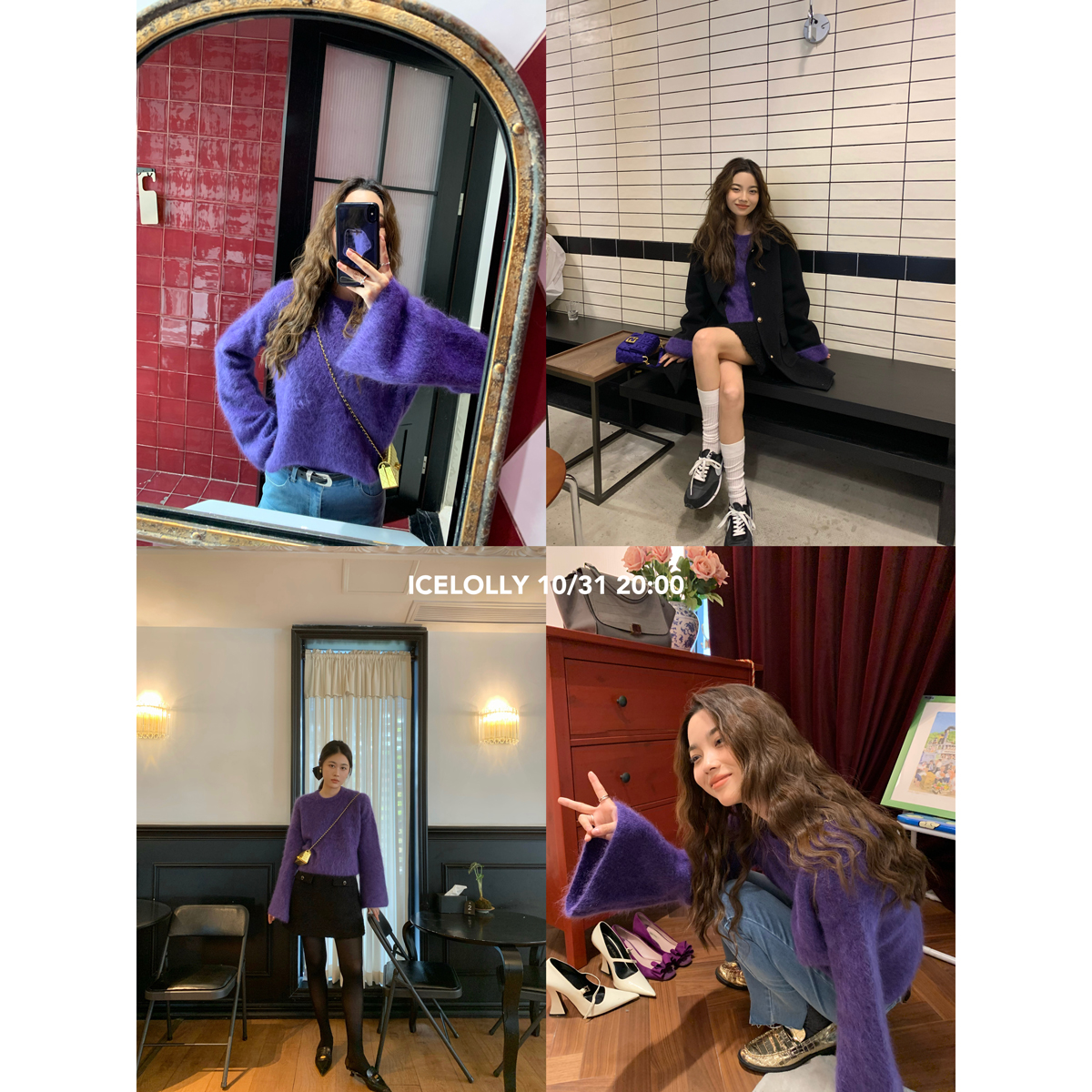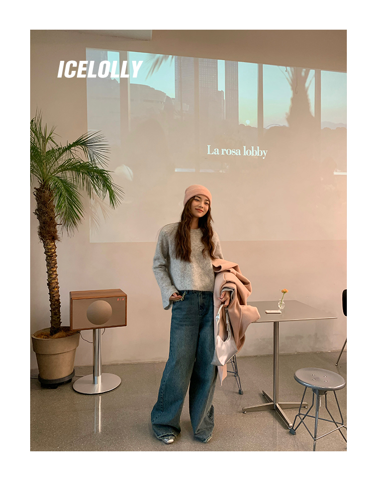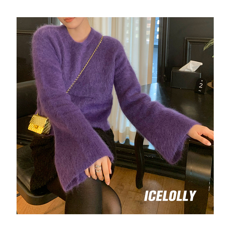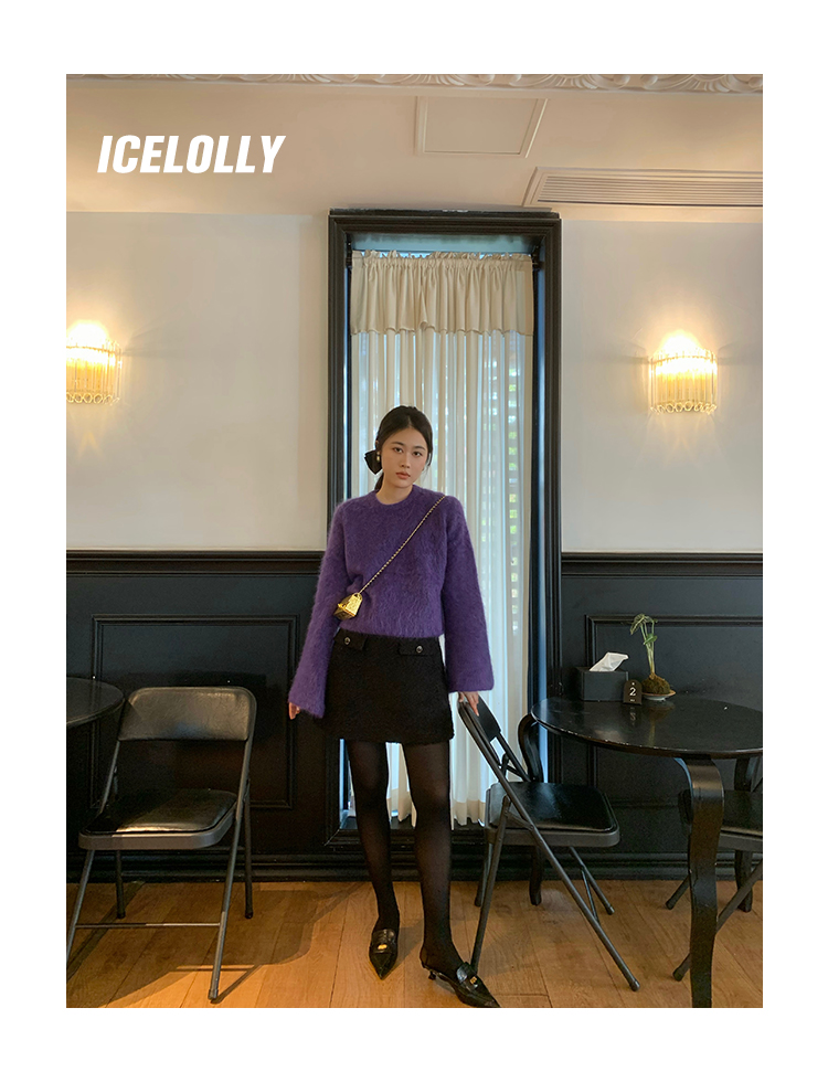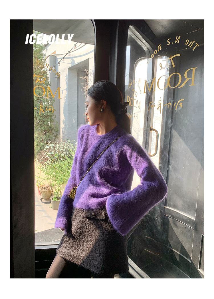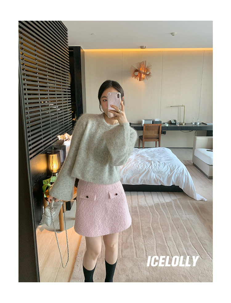 ICELOLLY溫柔風短款灰色馬海毛毛衣女秋冬打底羊毛內搭針織衫上衣
