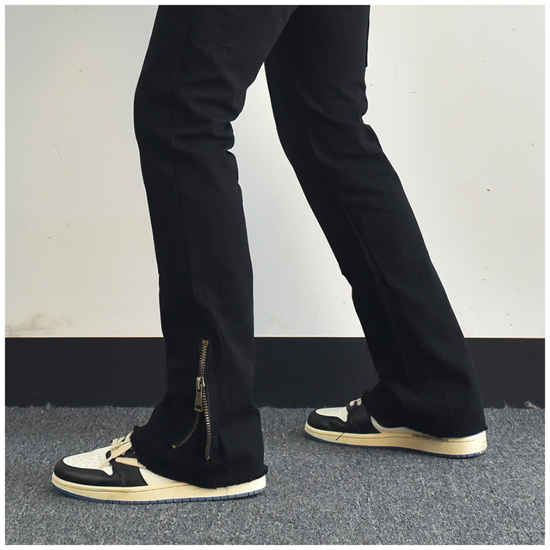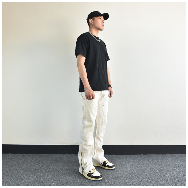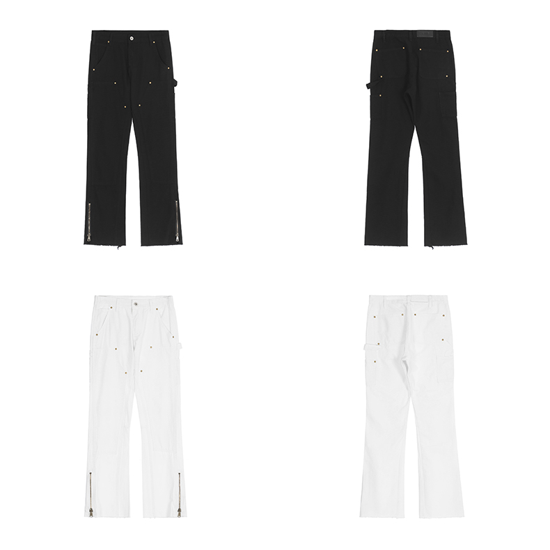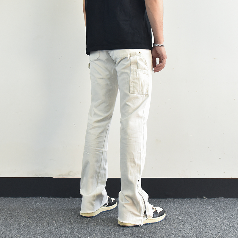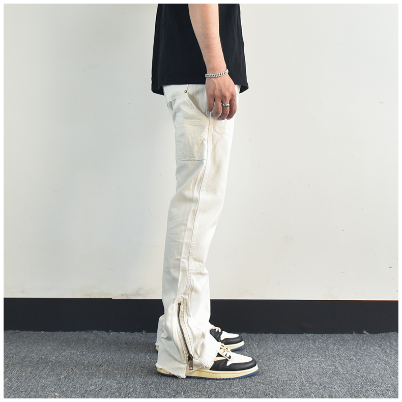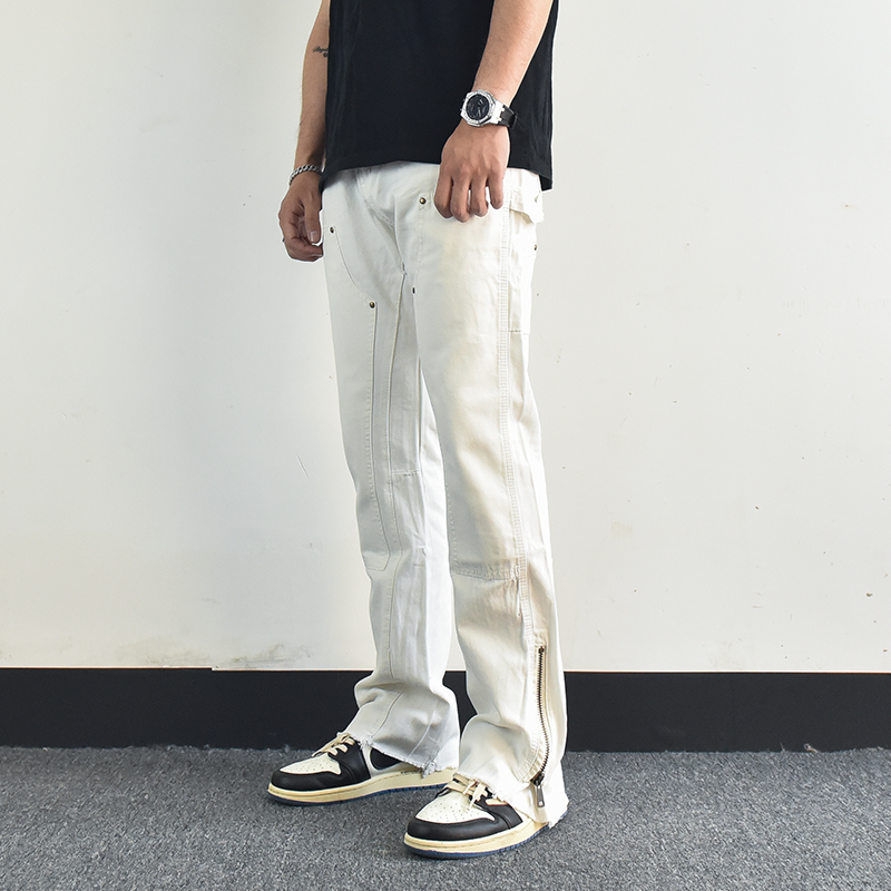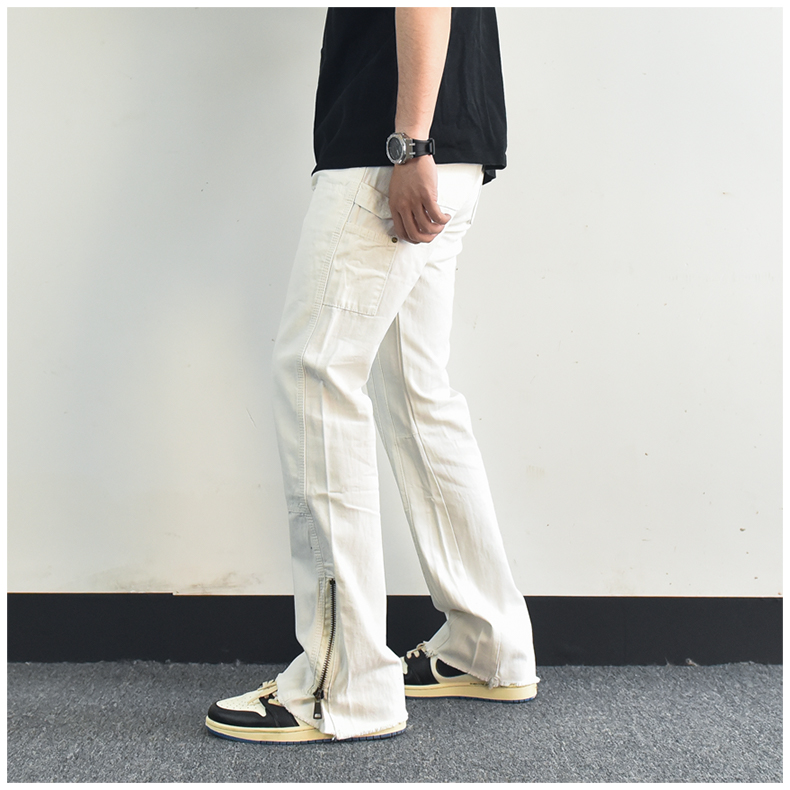 歐美高街vibe風拉鍊開叉微喇叭休閒褲寬鬆白色美式潮牌工裝褲子男