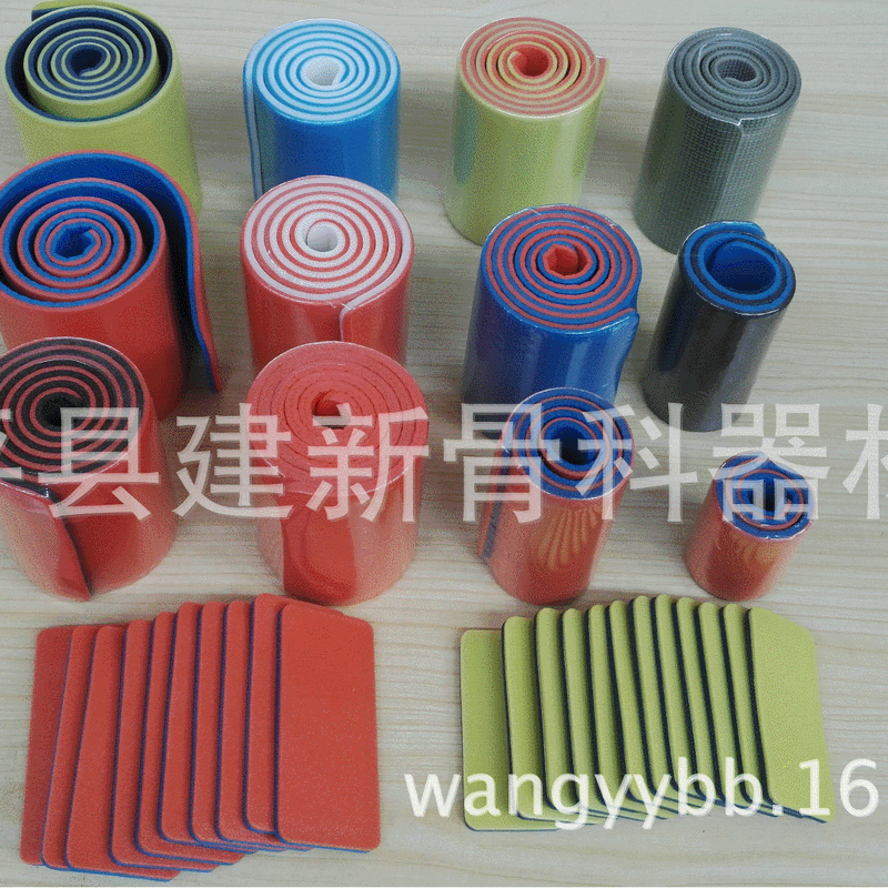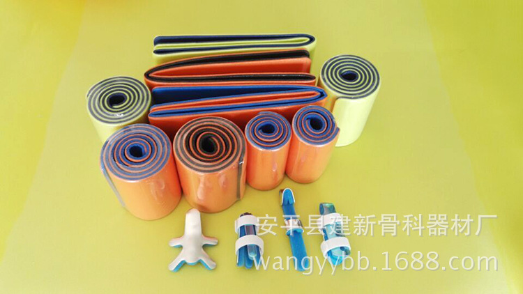 主要生产夹板、牵引带、支具、拐杖等。生产的可塑形夹板常年出口,既可塑形,又透气,不熏肉。主要由三大系列产品: 1、夹板系列:A、 可塑形夹板(上肢、下肢各部位28类,86个型号),B、木制骨夹板:传统工艺,价格低廉,规格齐全。适应于贫困地区。 2、拐杖系列:按照材料分木制、铝合金、不锈钢三种。 3、牵引带系列:肋骨牵引固定带、下肢牵引固定带、腰椎牵引固定带、踝骨牵引固定带、锁骨牵引固定带、全弹力腹带、全弹力腰围、气体颈椎牵引器。尤其是开发生产的 可塑形 骨夹板系列产品适用于人体各部位骨损伤(骨折及脱位)的外固定。具有表面光滑柔软、轻便、透X光、可塑性强等特性。既能用手而无需附加措施来与待固定的肢体相适配,又有足够的钢性以保证肢体所需的固定作用。可根据人体的生理结构特点任意折曲塑形,尤其是对掌指骨折、各关节部位等不稳定骨折有良好的塑形固定作用,使用方便,效果良好。可直接与人体表皮接触,无刺激,无致敏性,经临床试用。具有传统的石膏、木制和热变形塑料等原骨科固定材料不具备的优势。尤其是可卷夹板(塑胶绷带)是骨伤急救的 材料使用方便,效果良好。该产品系专利产品。按用途分为掌背骨、指骨、前臂、股骨干、胫腓骨等多种系列。每种夹板均有成人、儿童大、中、小三种型号,可根据需要选择使用。目前主要用于出口。尤其是一些战争国家,医疗器械储备,用量 大。塑胶绷带。按照厚度(强度)有A、B、C、D四种,颜色可选。