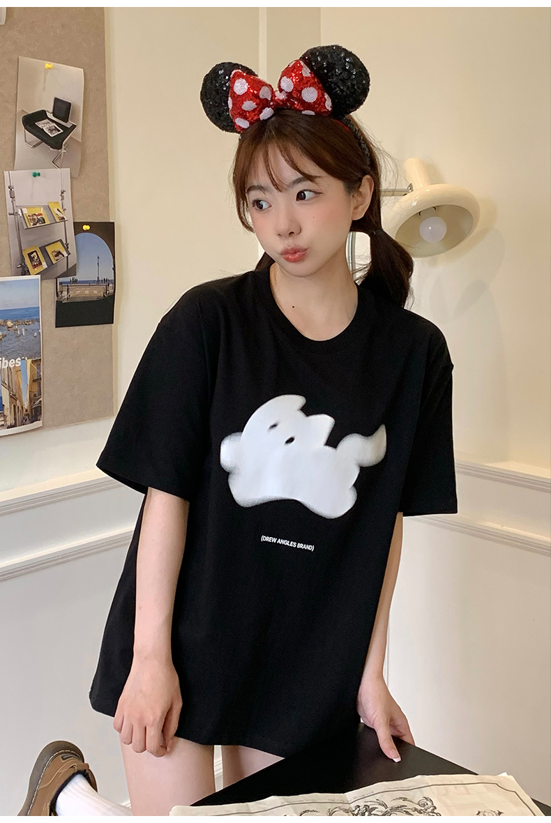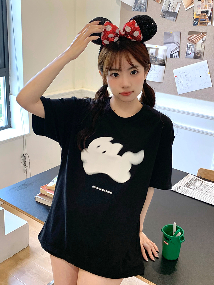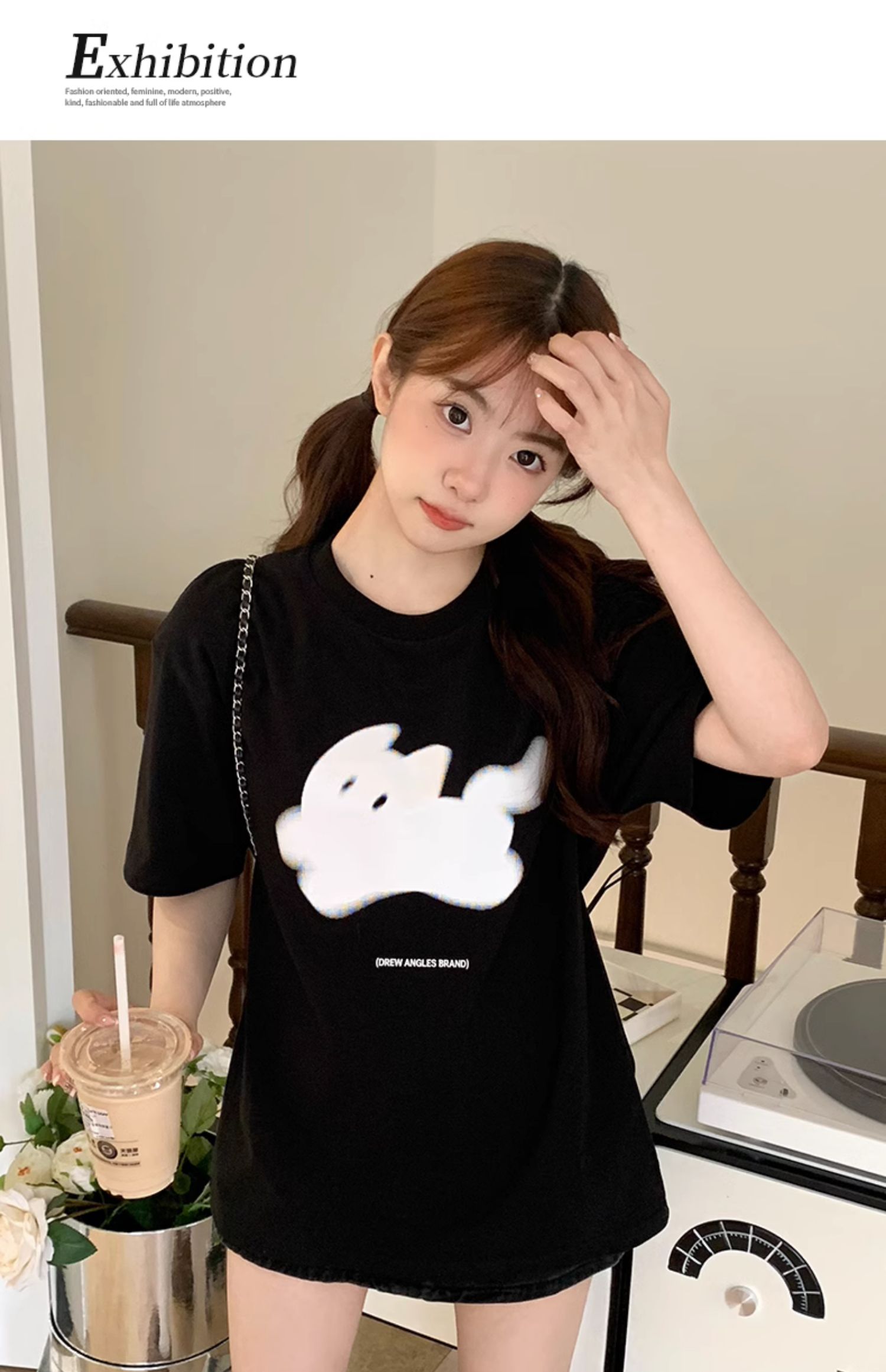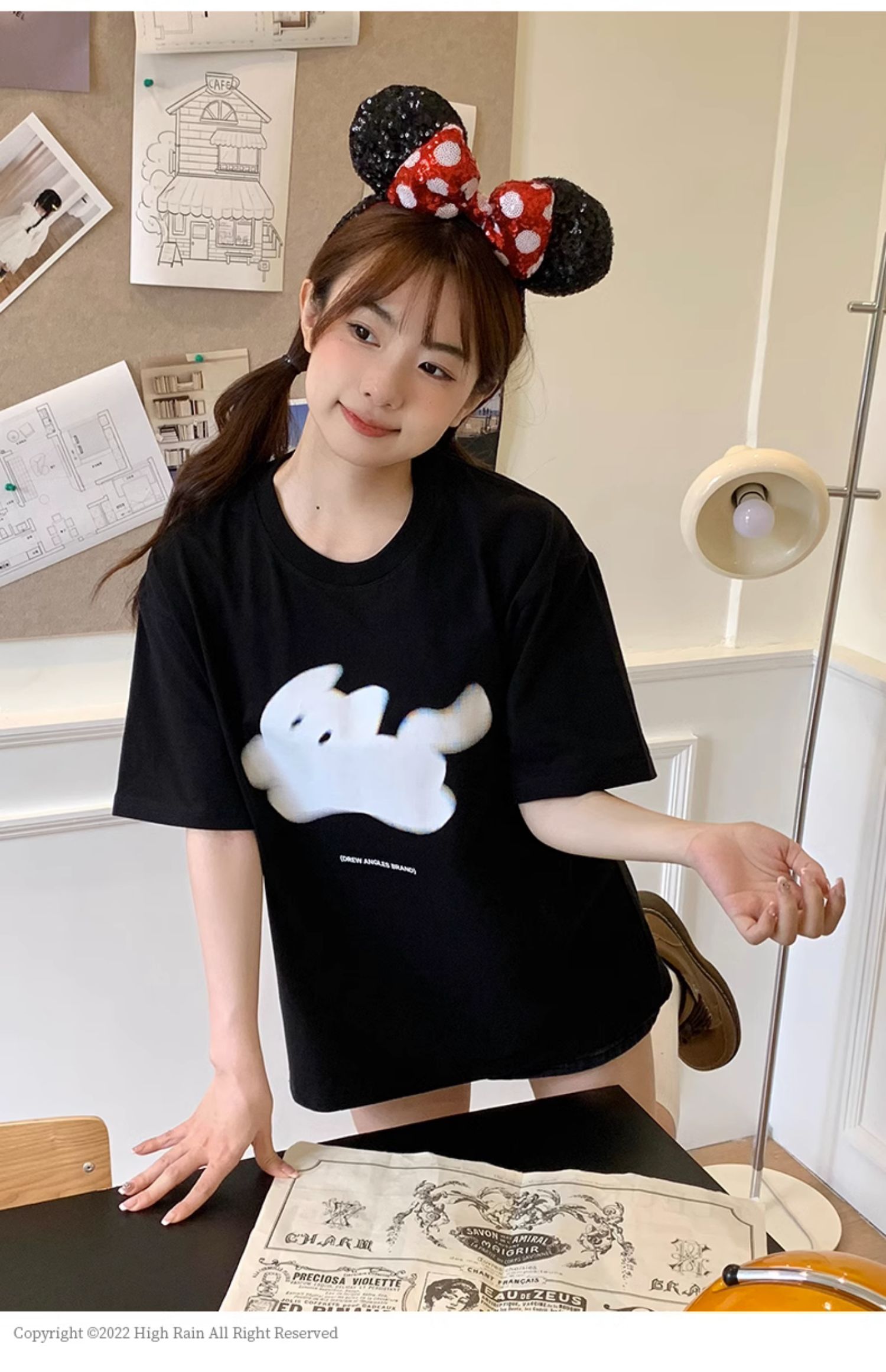 很潤工作室 可愛跑酷的小貓咪黑色短袖落肩T恤棉夏季百搭情侶上衣