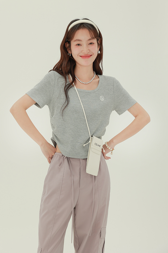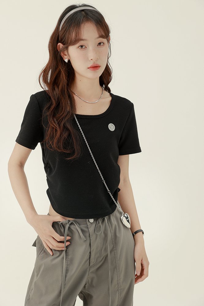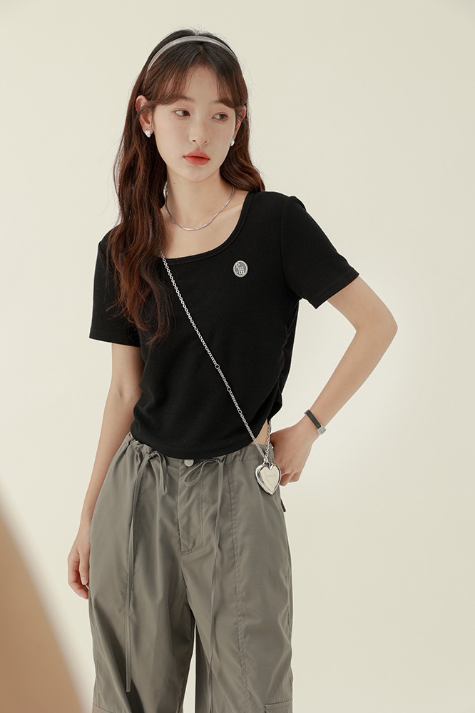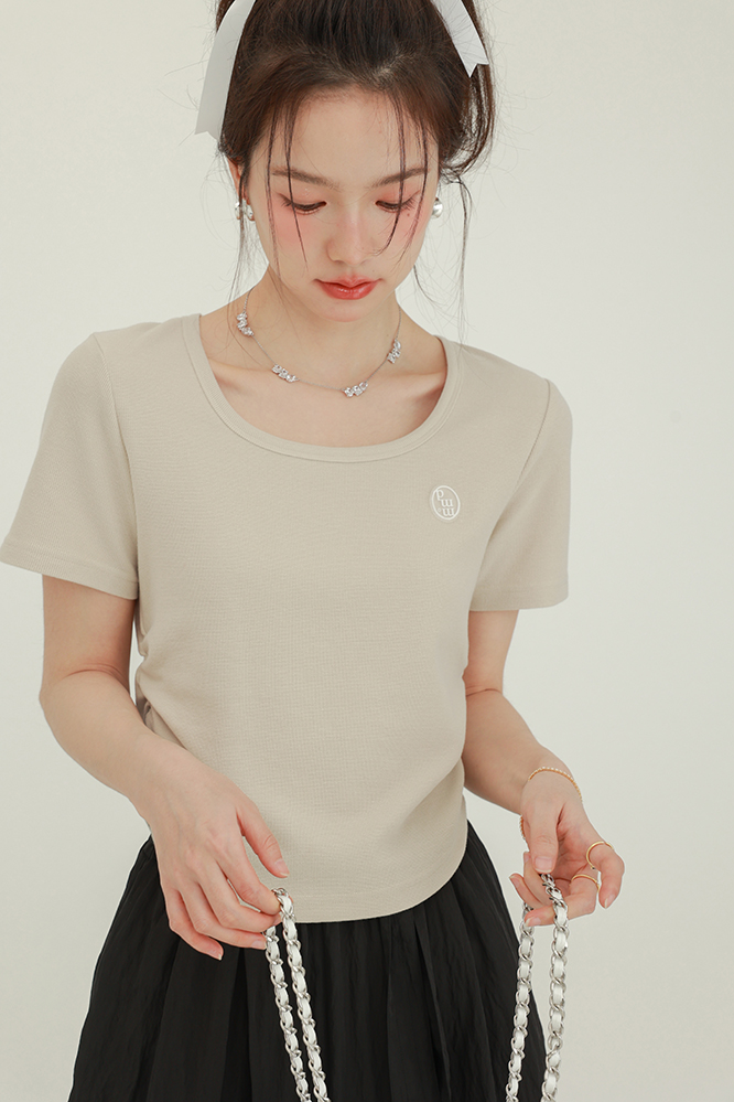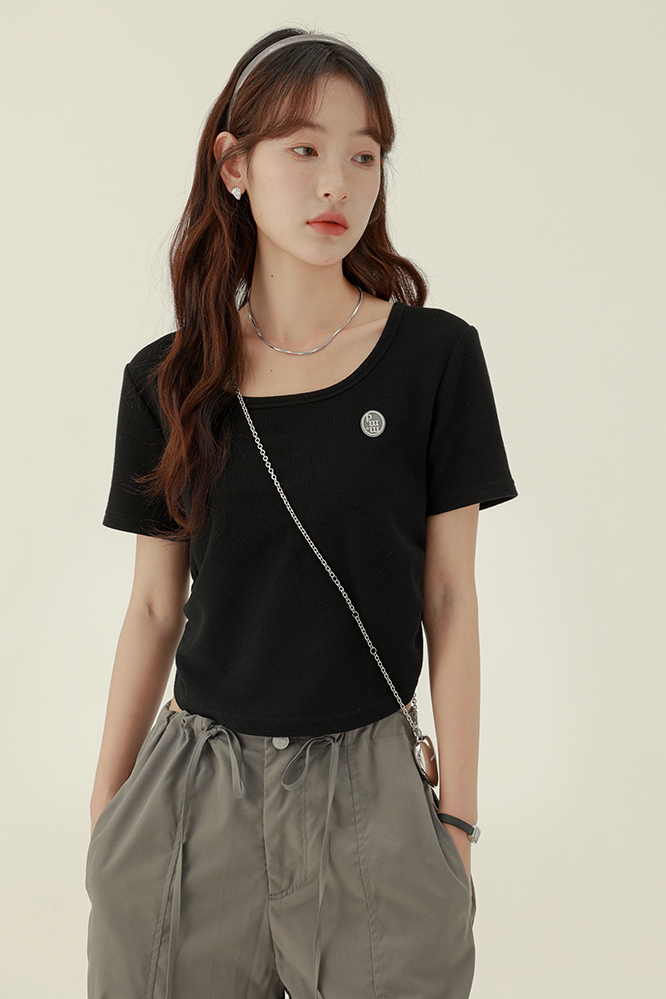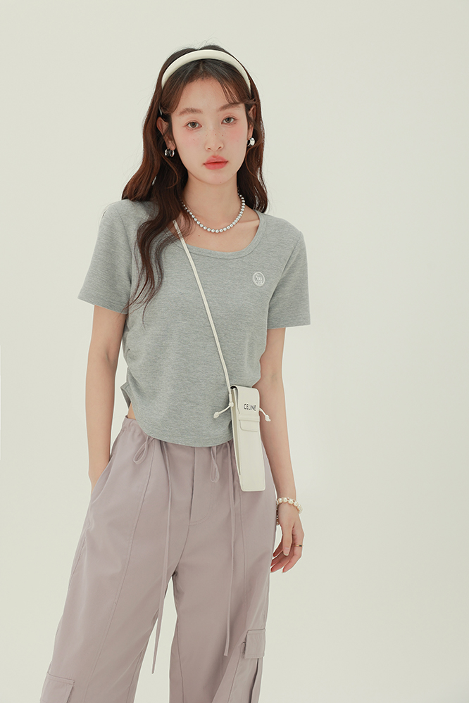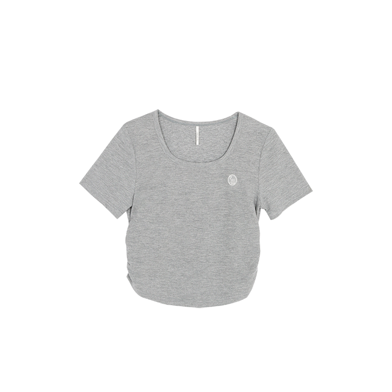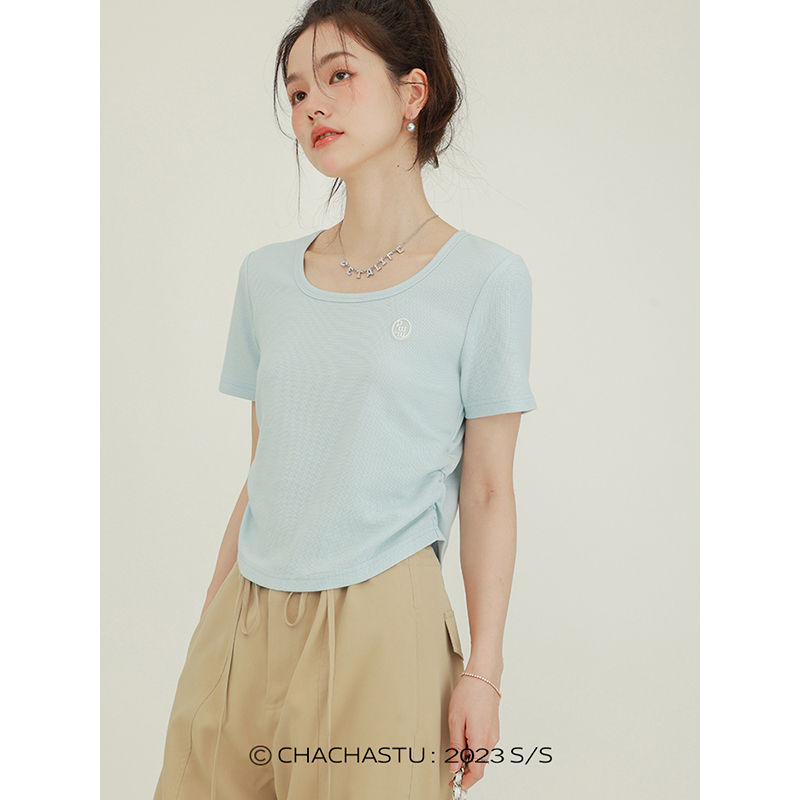 CHACHASTU正肩短袖t恤女夏季灰色打底衫小眾獨特別致短款內搭上衣
