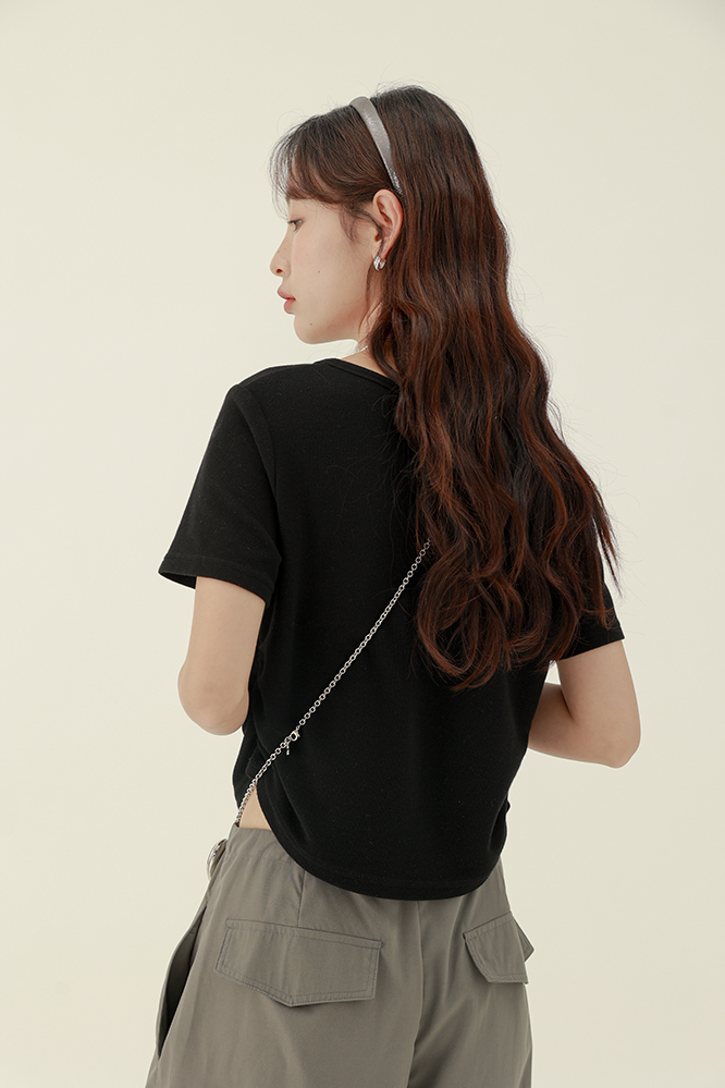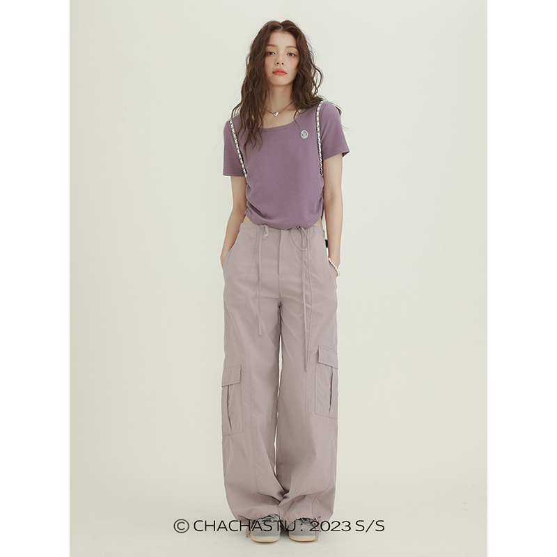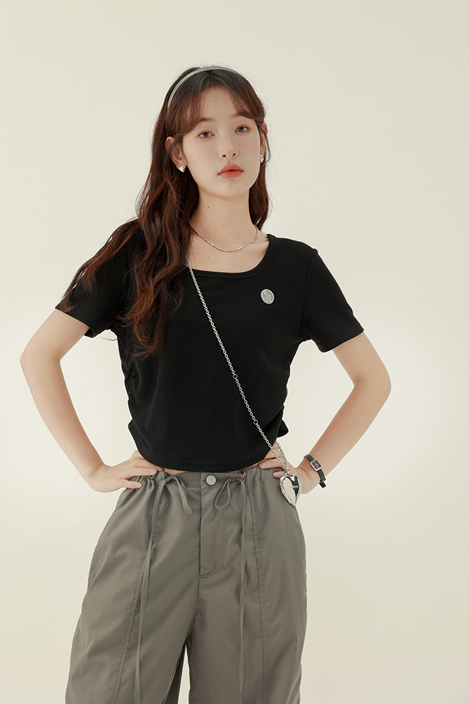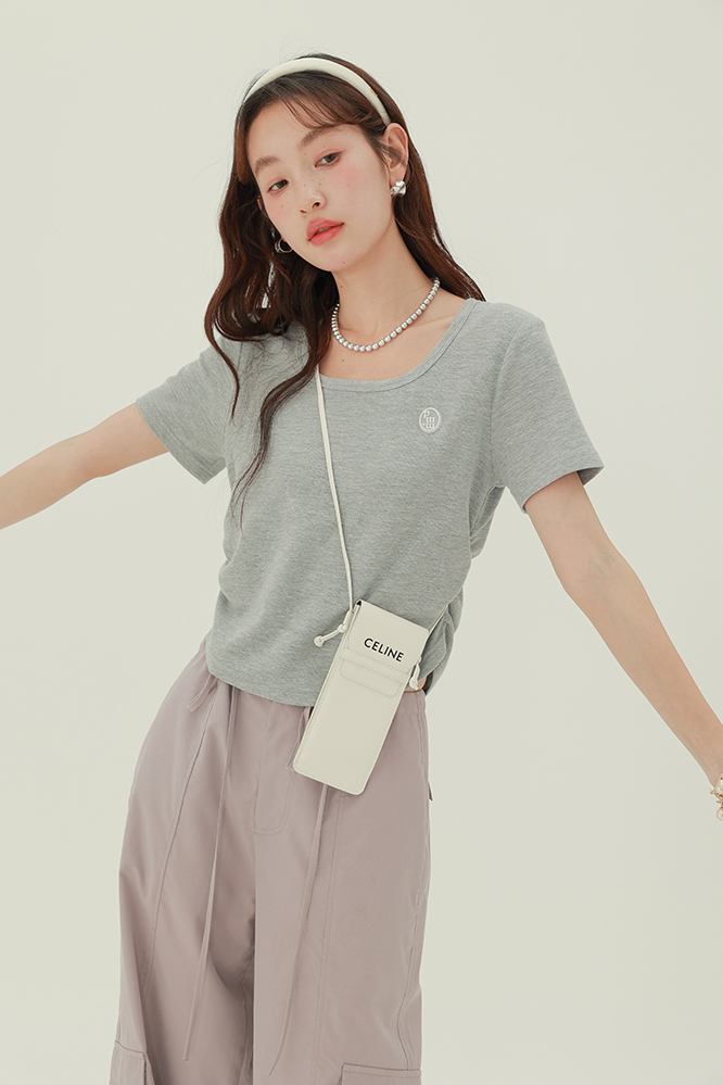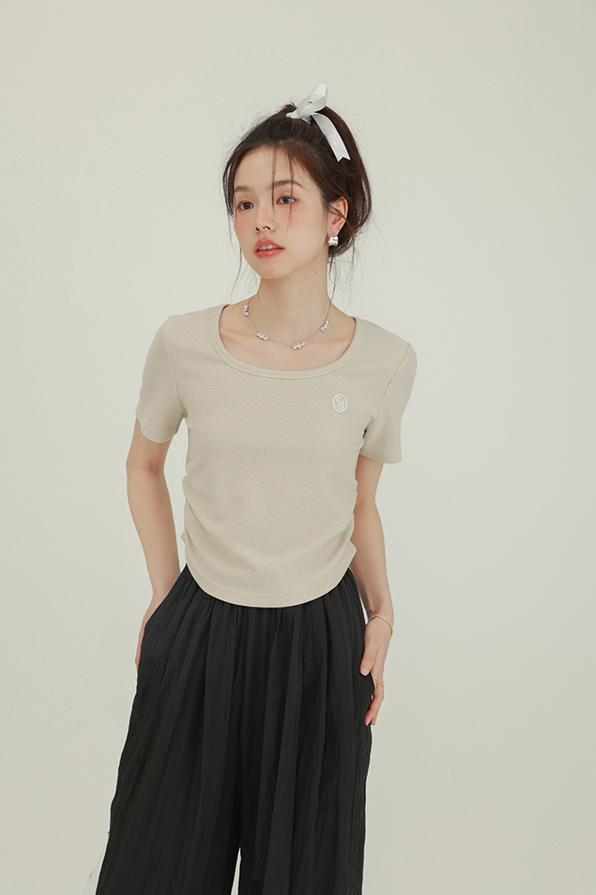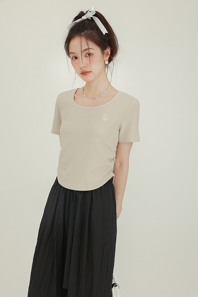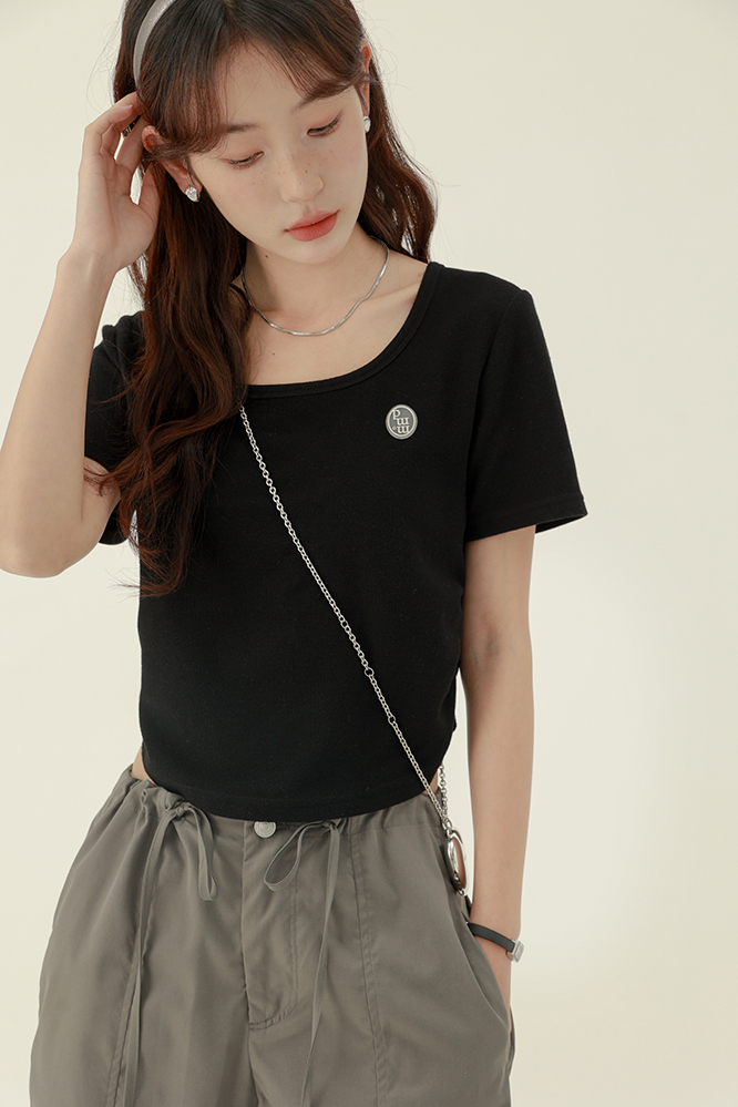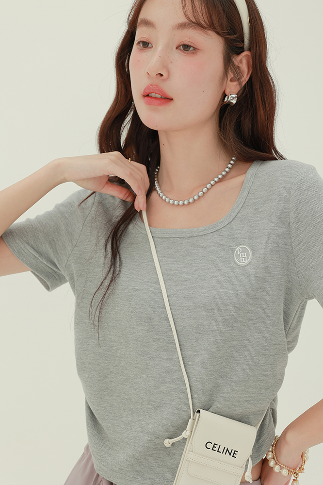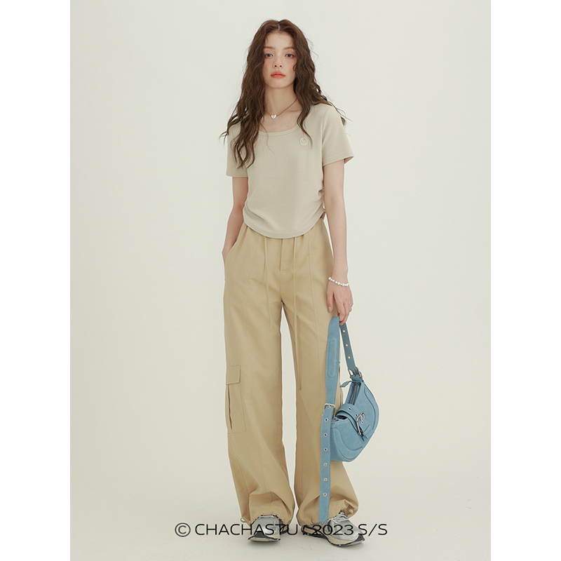 CHACHASTU正肩短袖t恤女夏季灰色打底衫小眾獨特別致短款內搭上衣