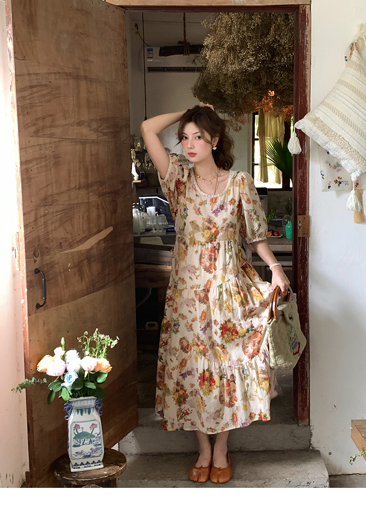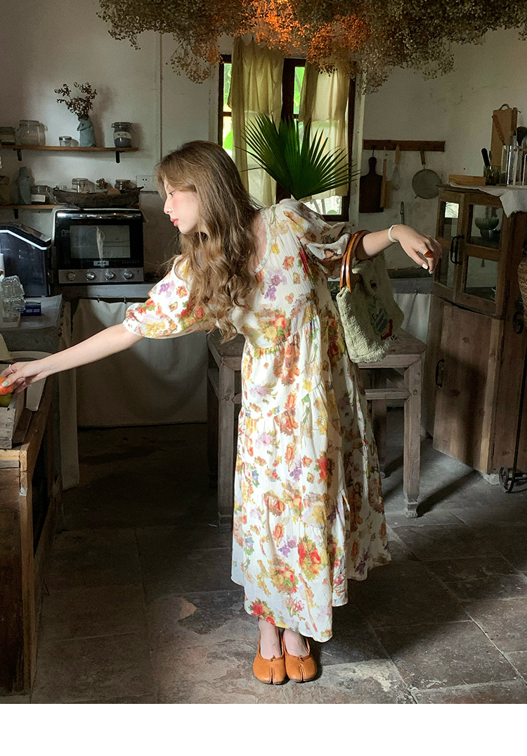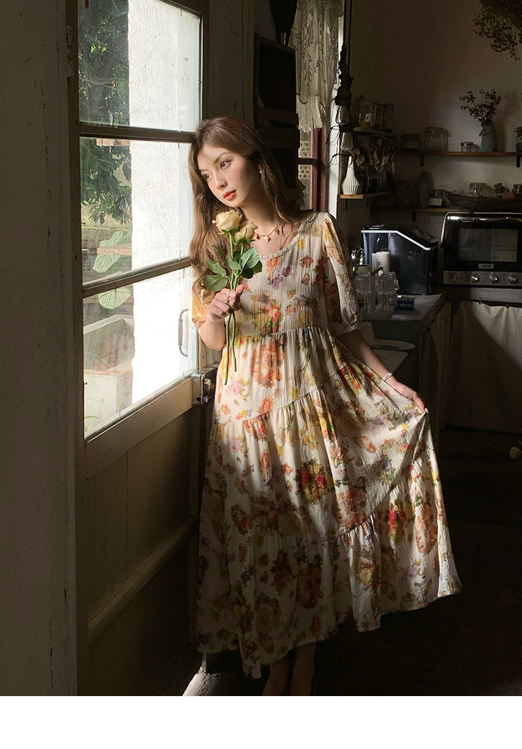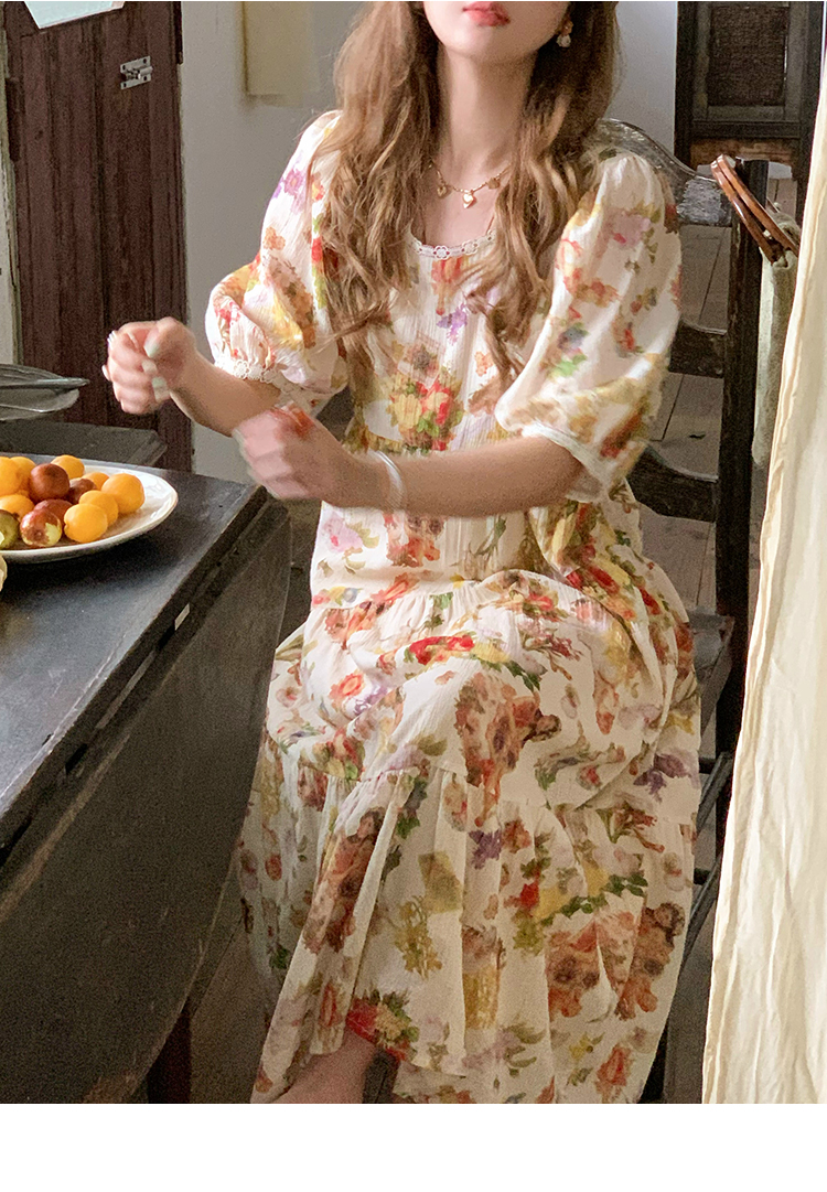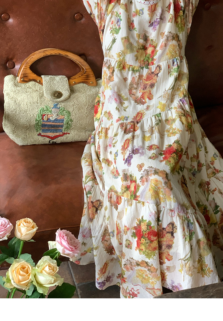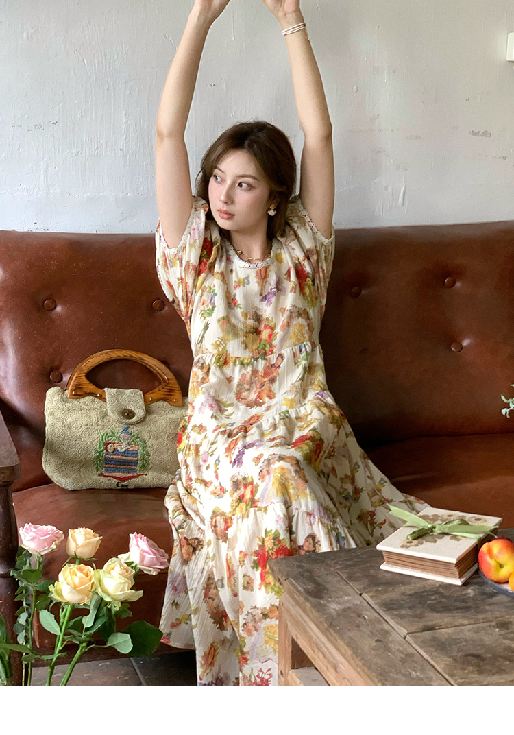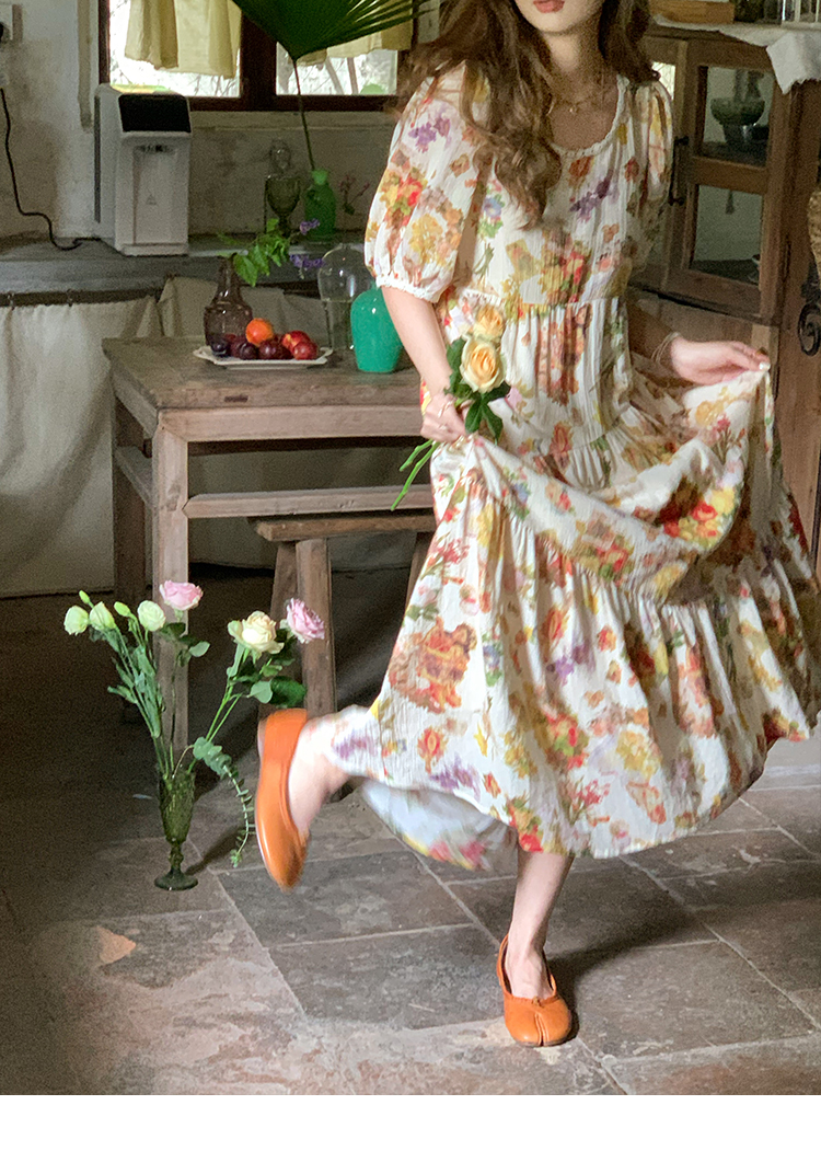 JC古著商店"天使霞光"法式復古碎花洋裝女夏泡泡袖肌理感油畫裙