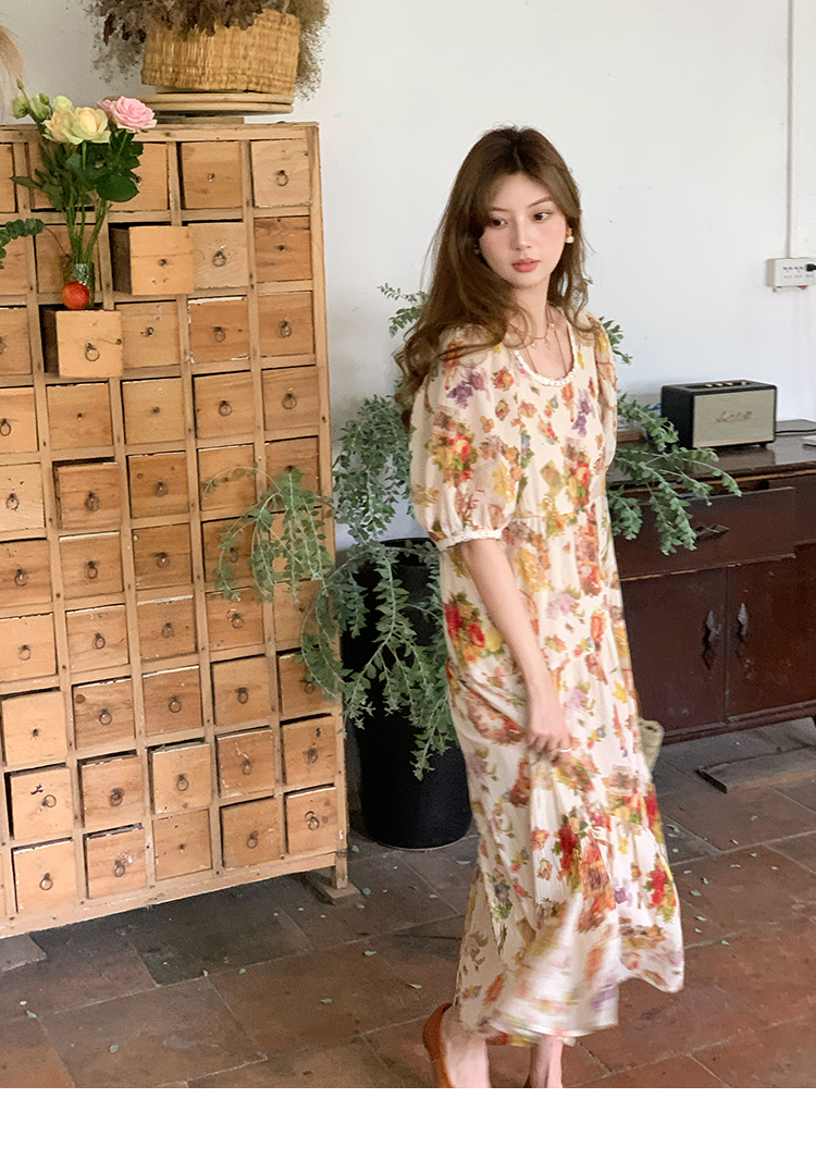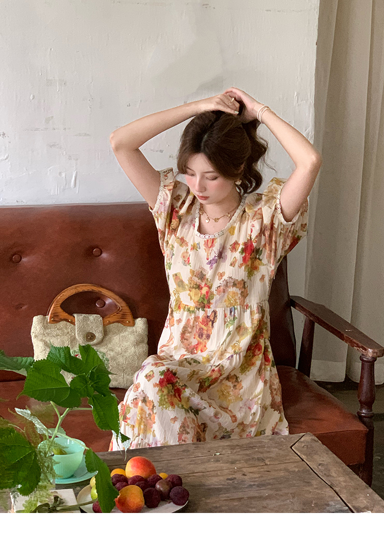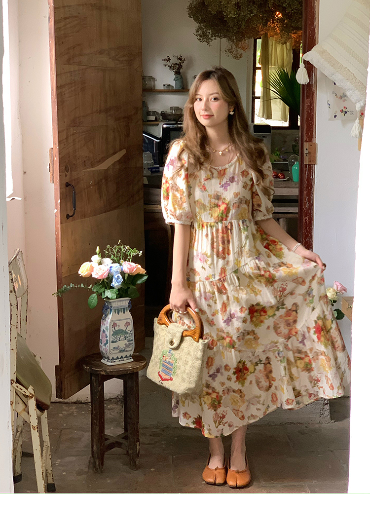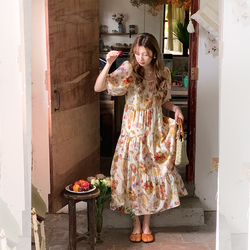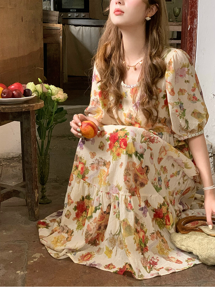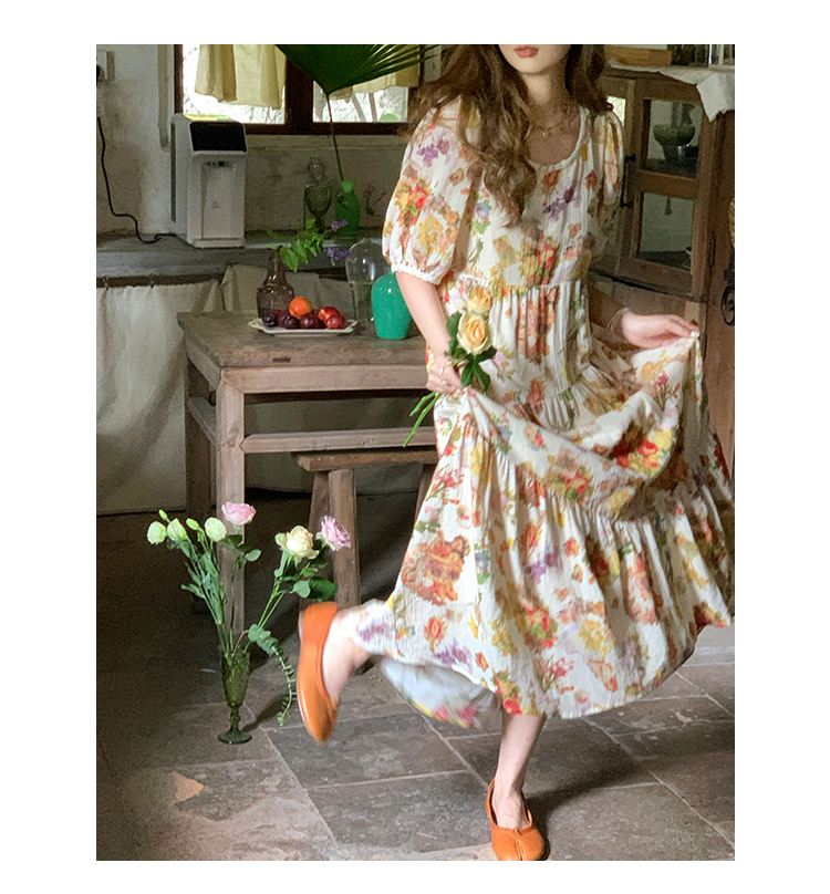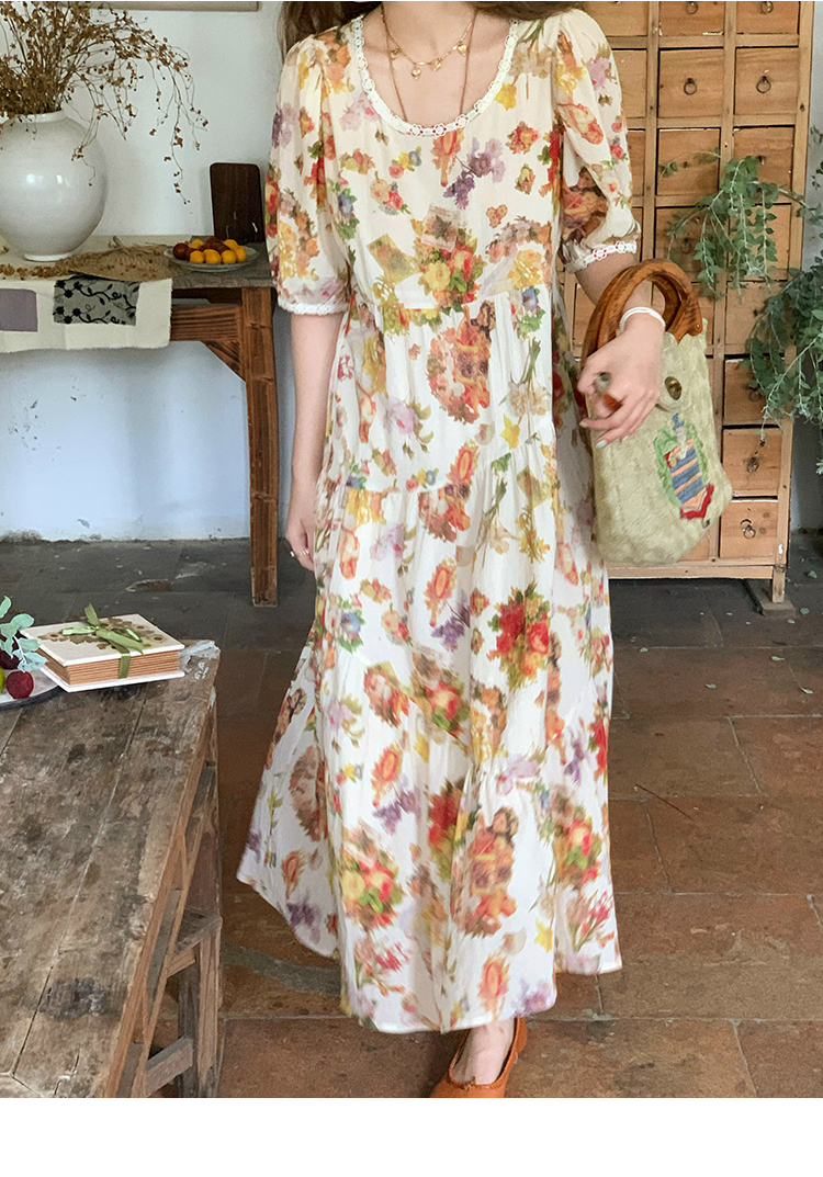 JC古著商店"天使霞光"法式復古碎花洋裝女夏泡泡袖肌理感油畫裙