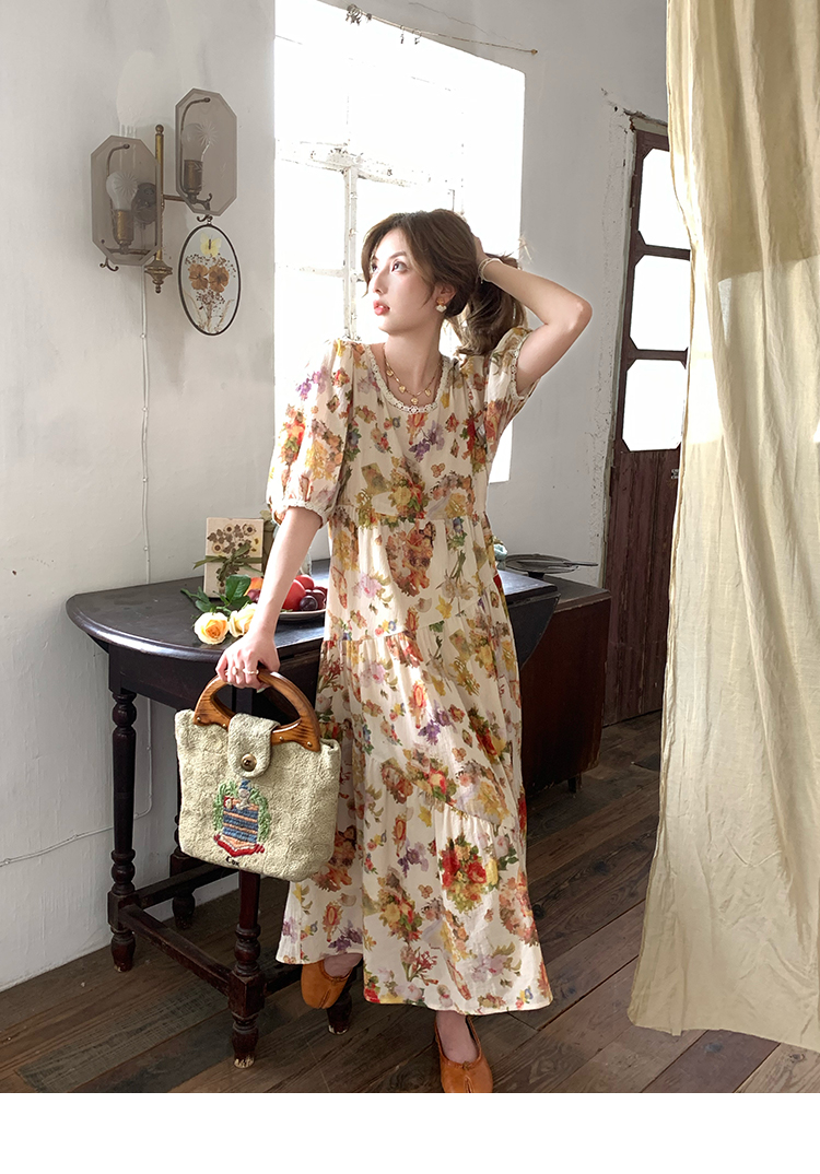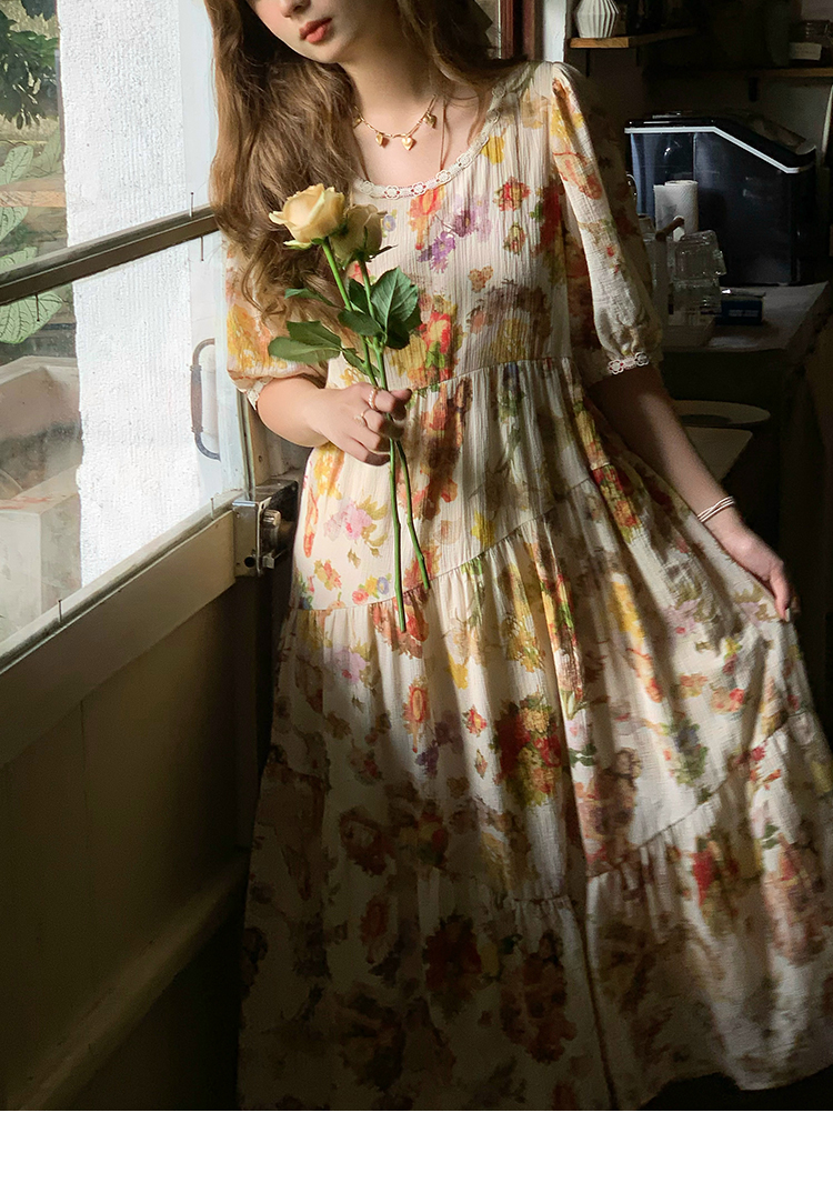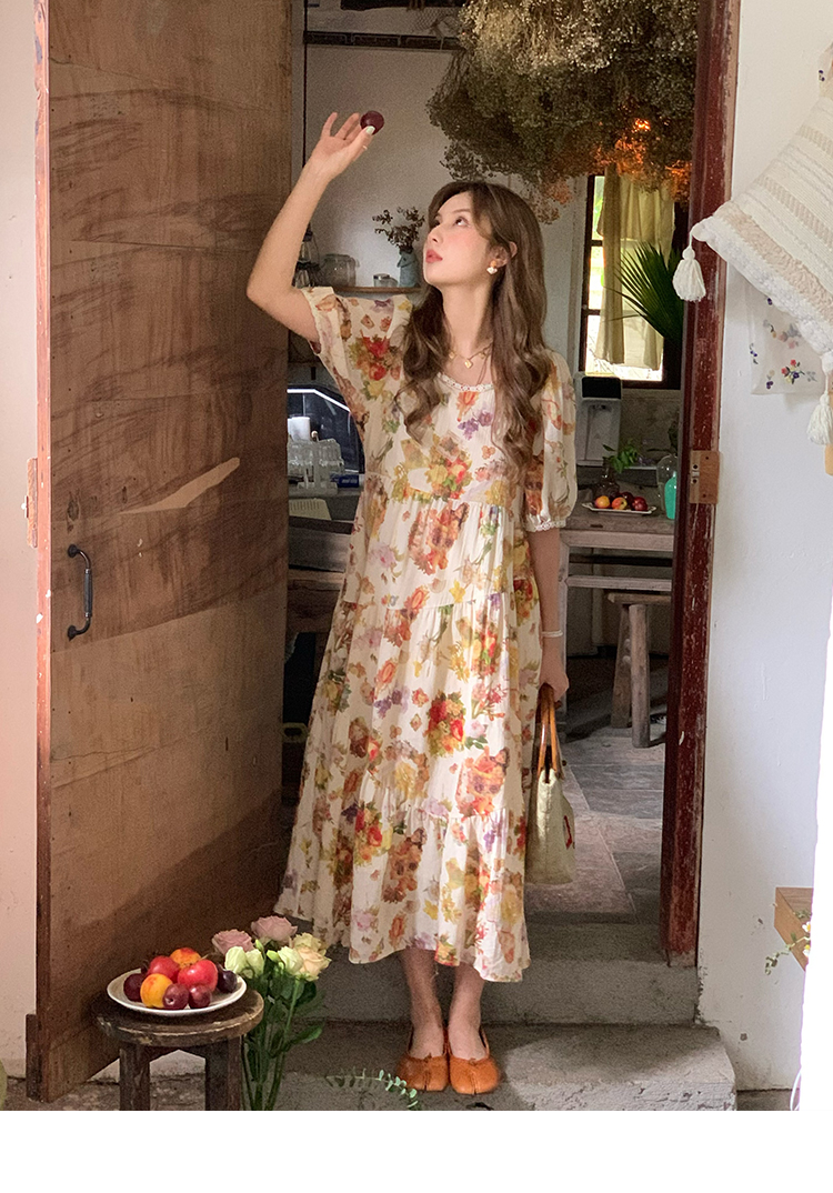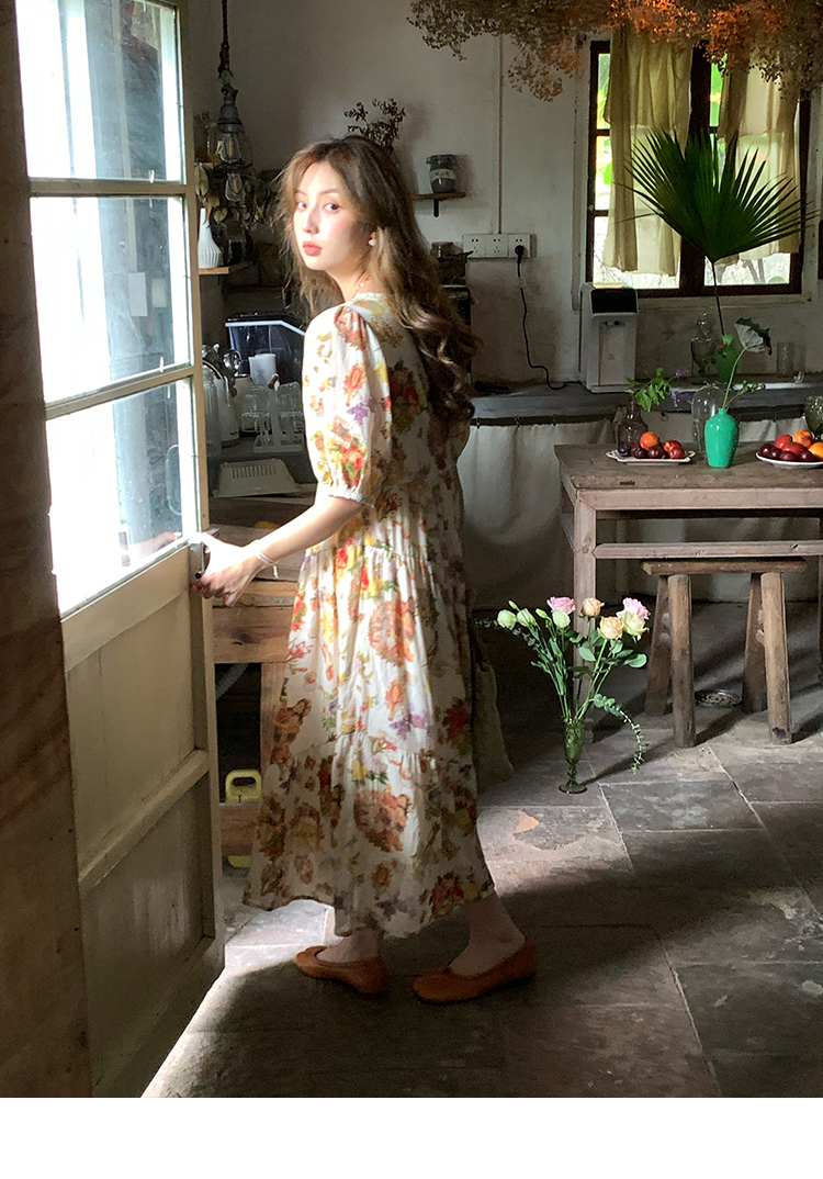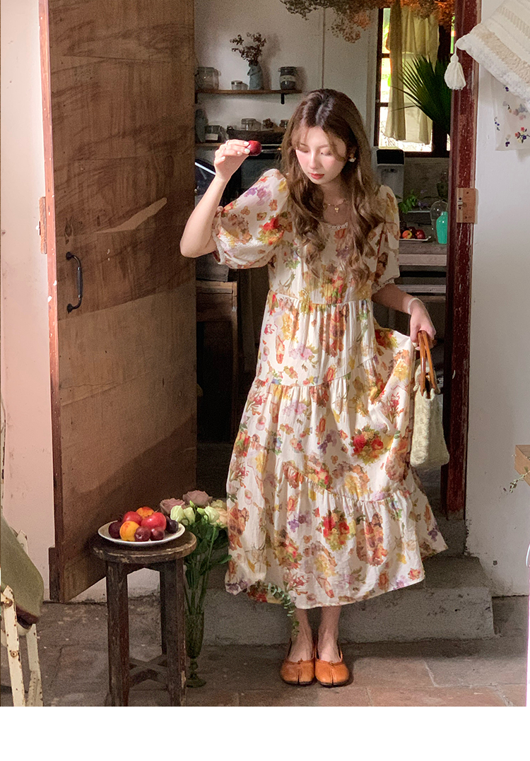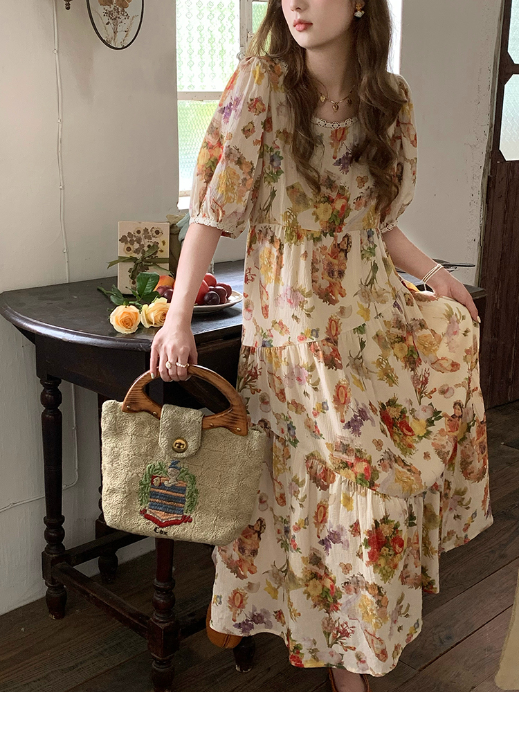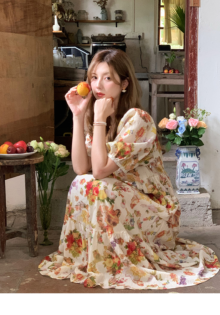 JC古著商店"天使霞光"法式復古碎花洋裝女夏泡泡袖肌理感油畫裙