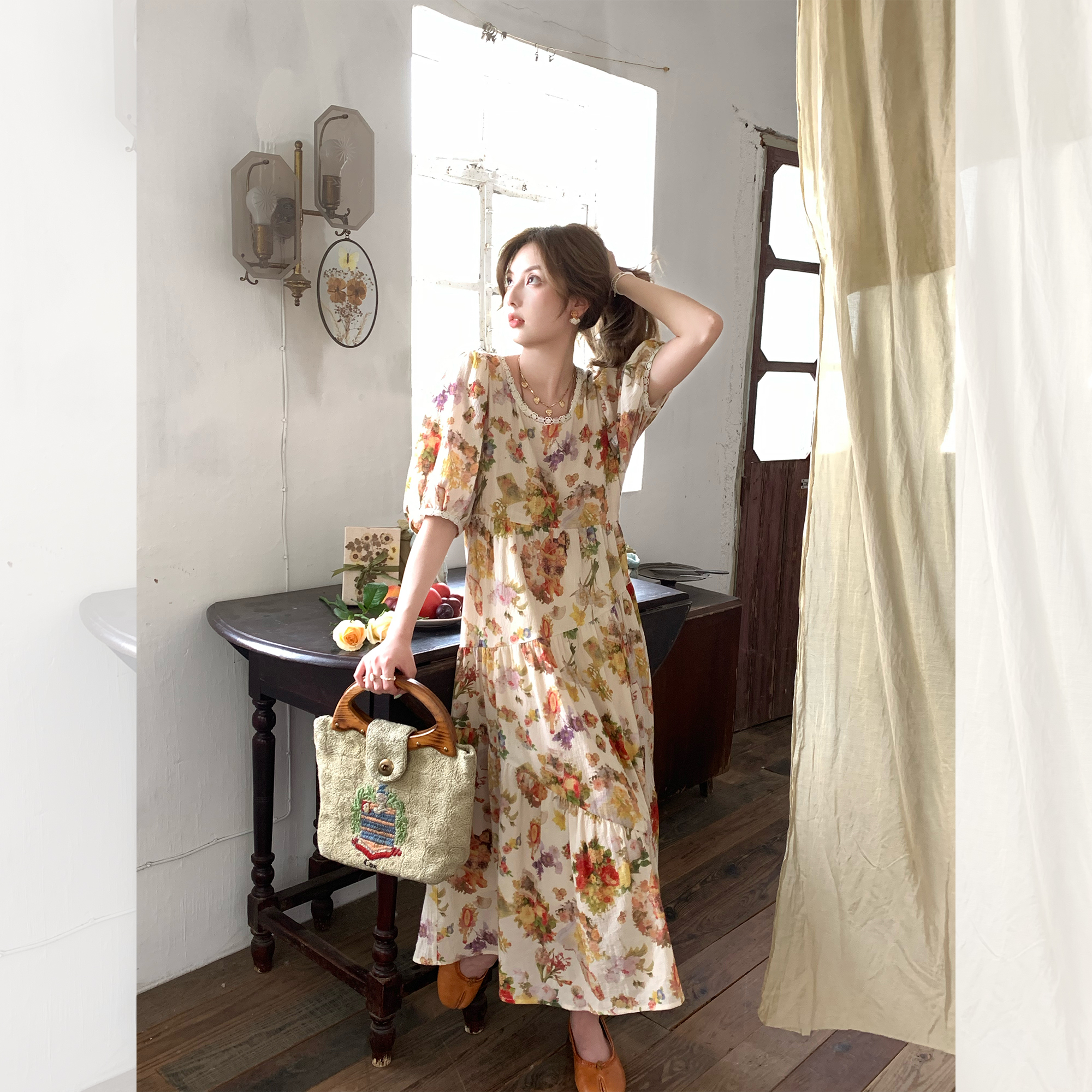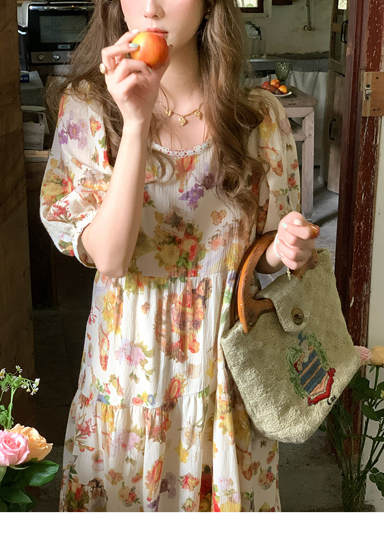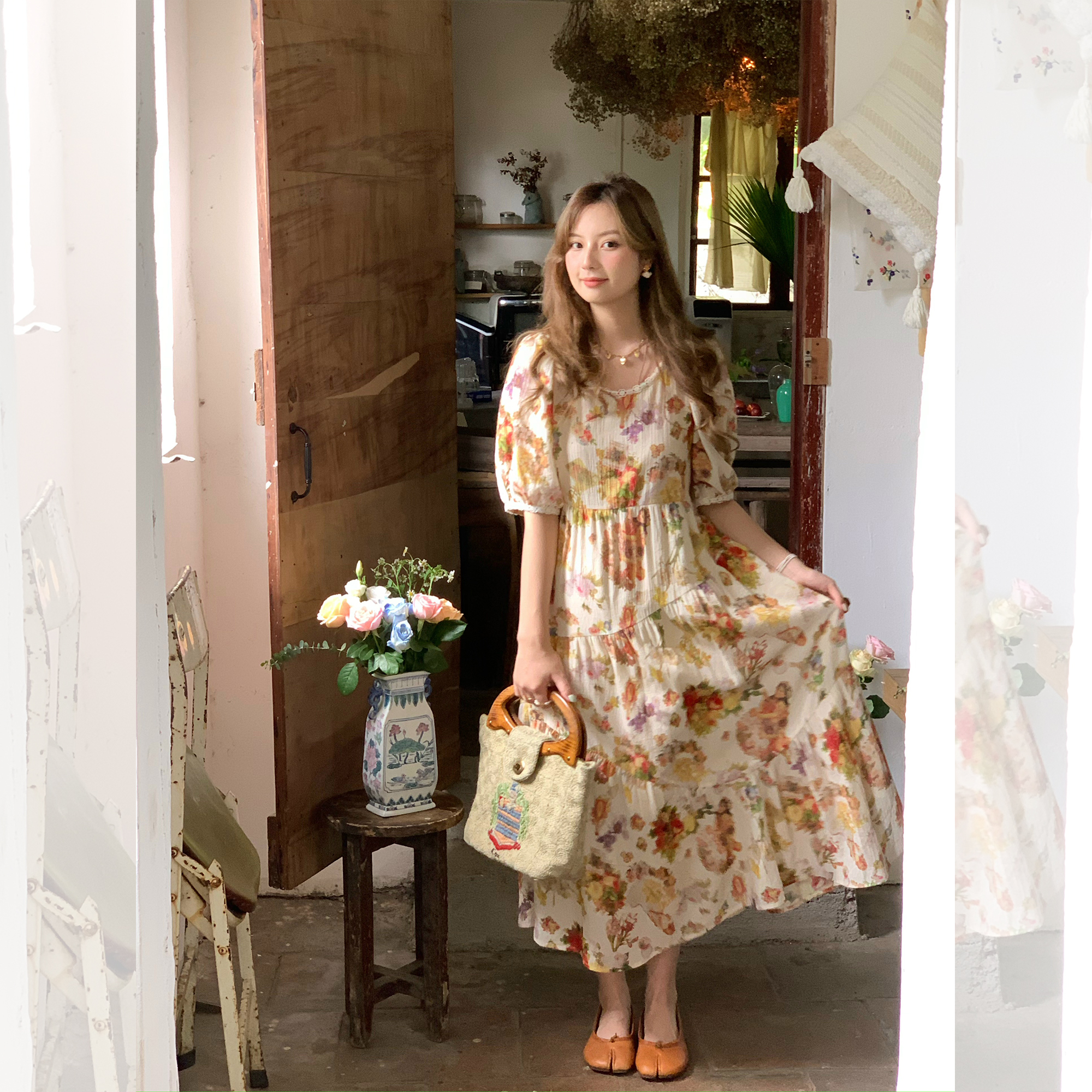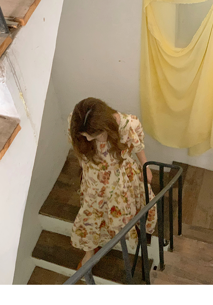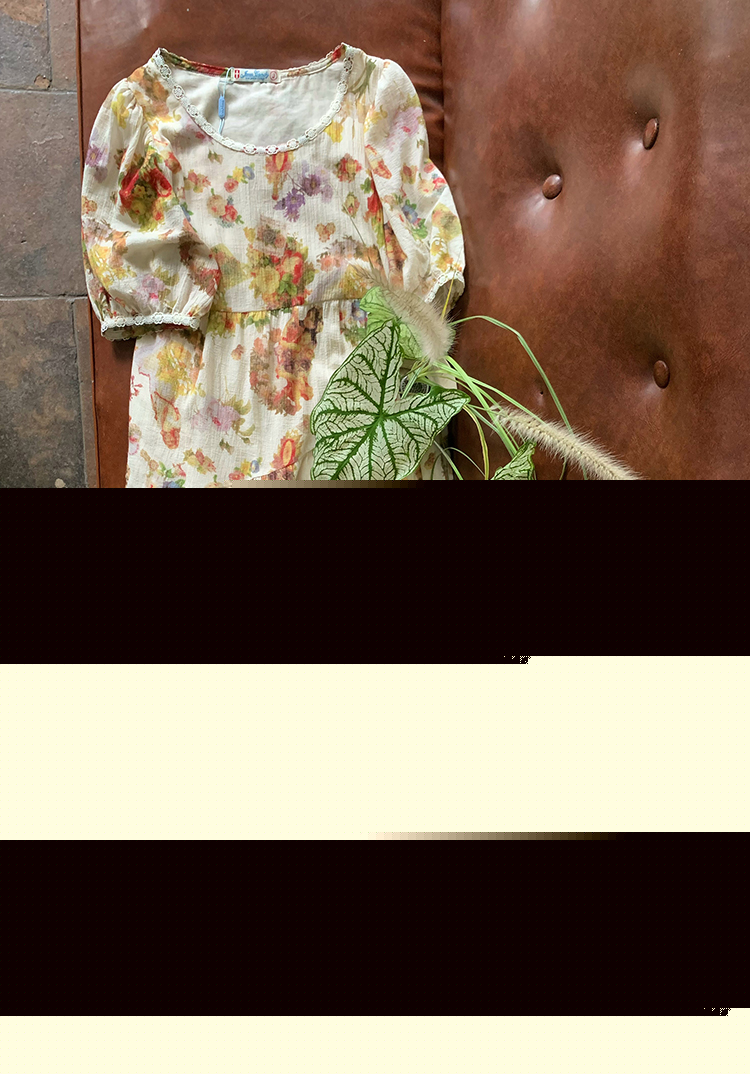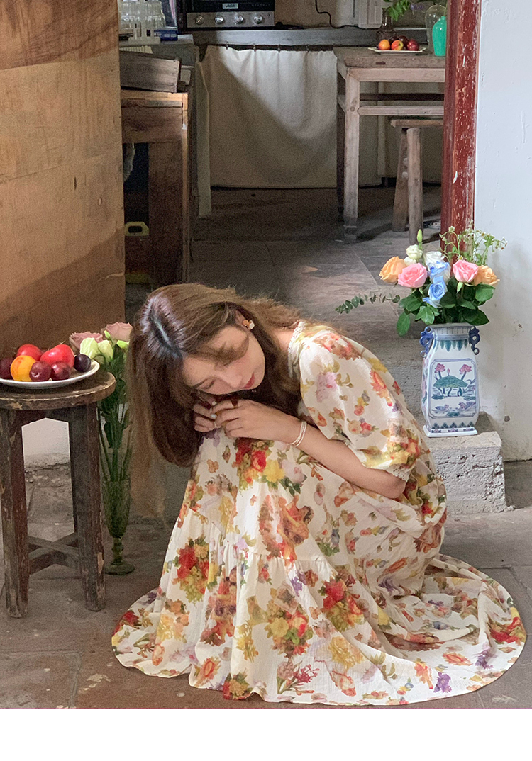 JC古著商店"天使霞光"法式復古碎花洋裝女夏泡泡袖肌理感油畫裙