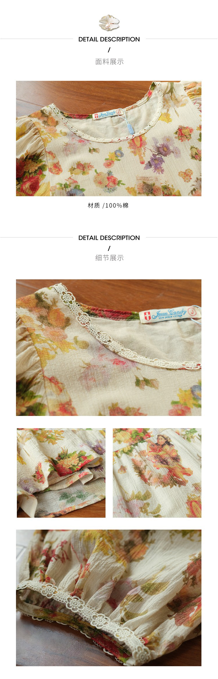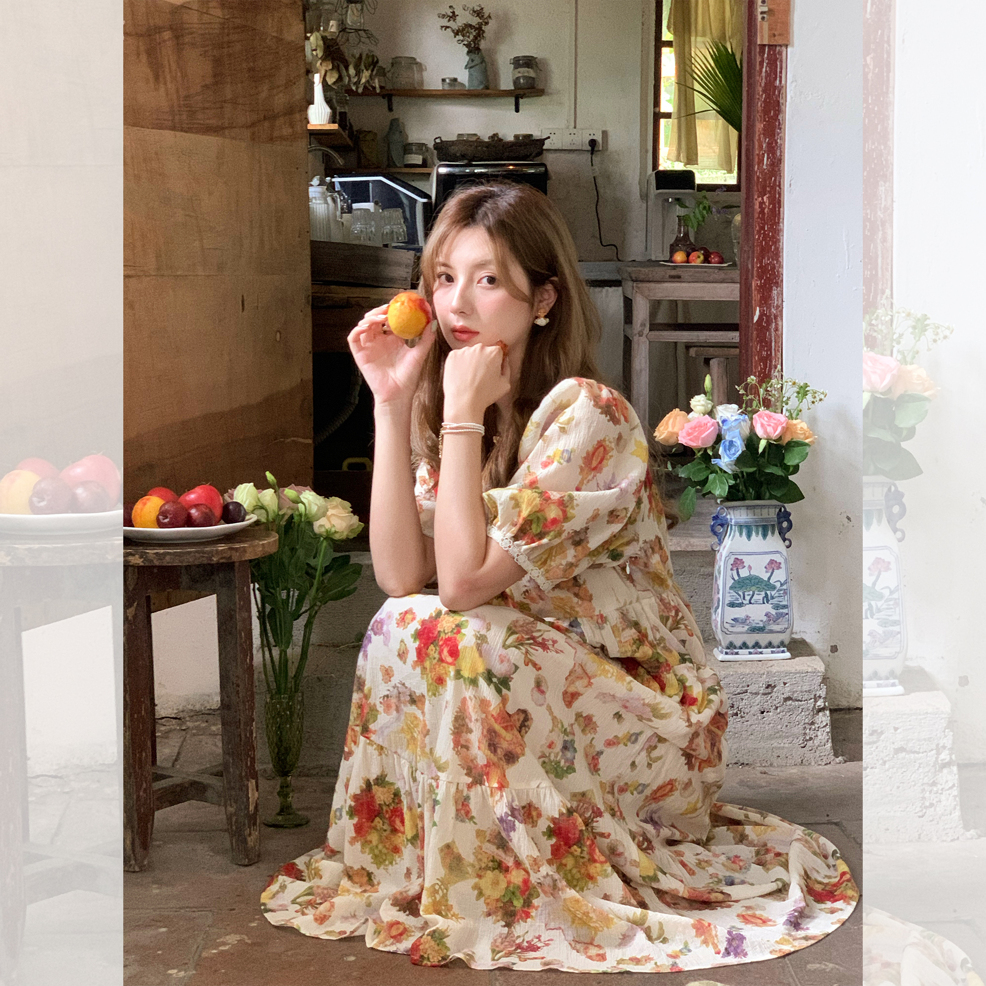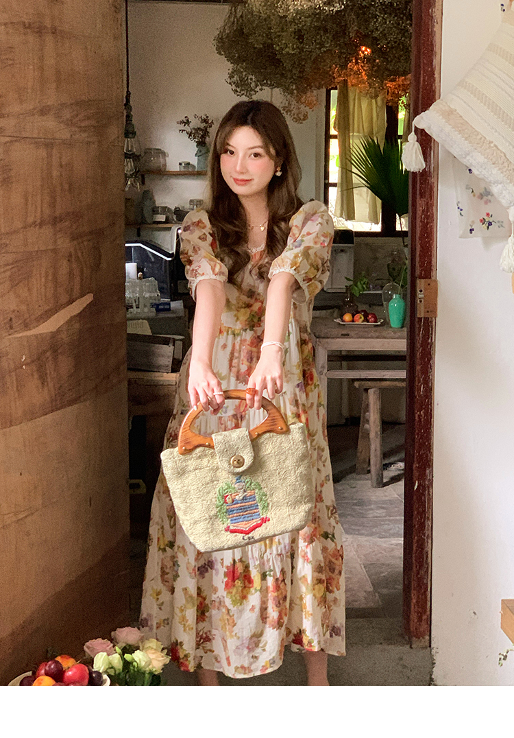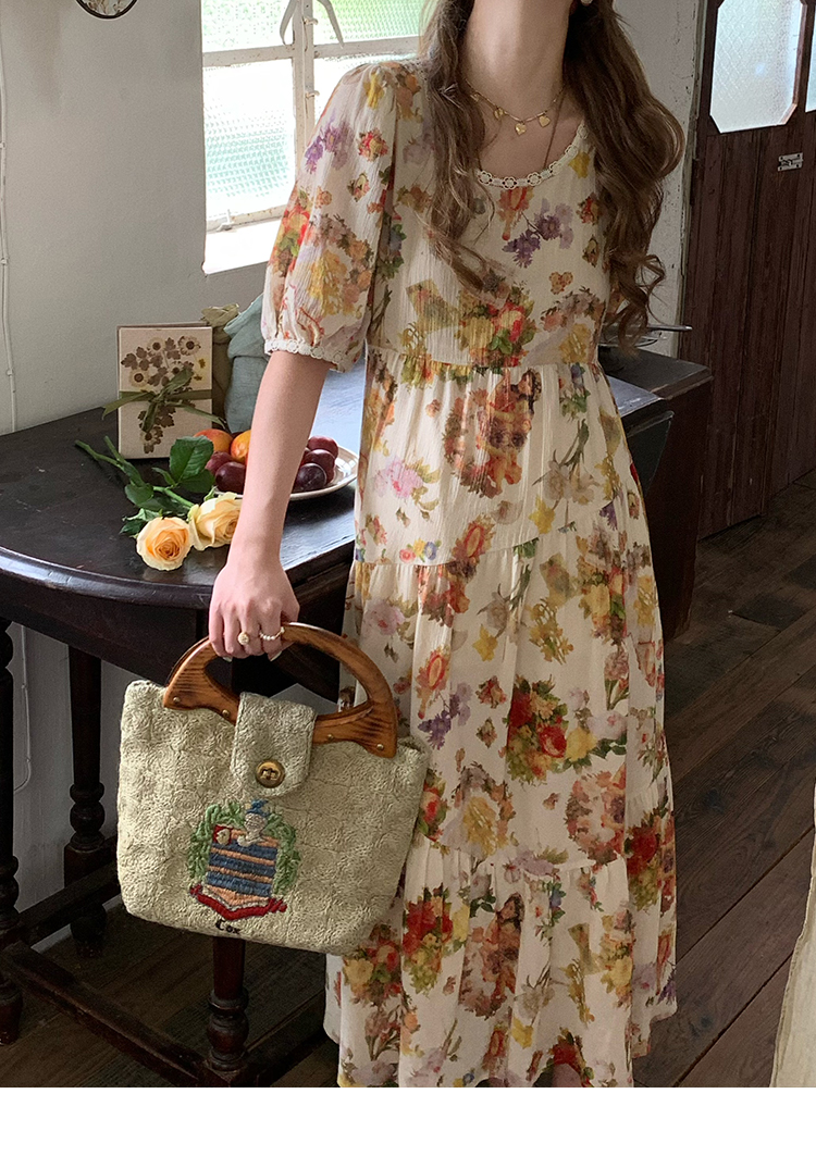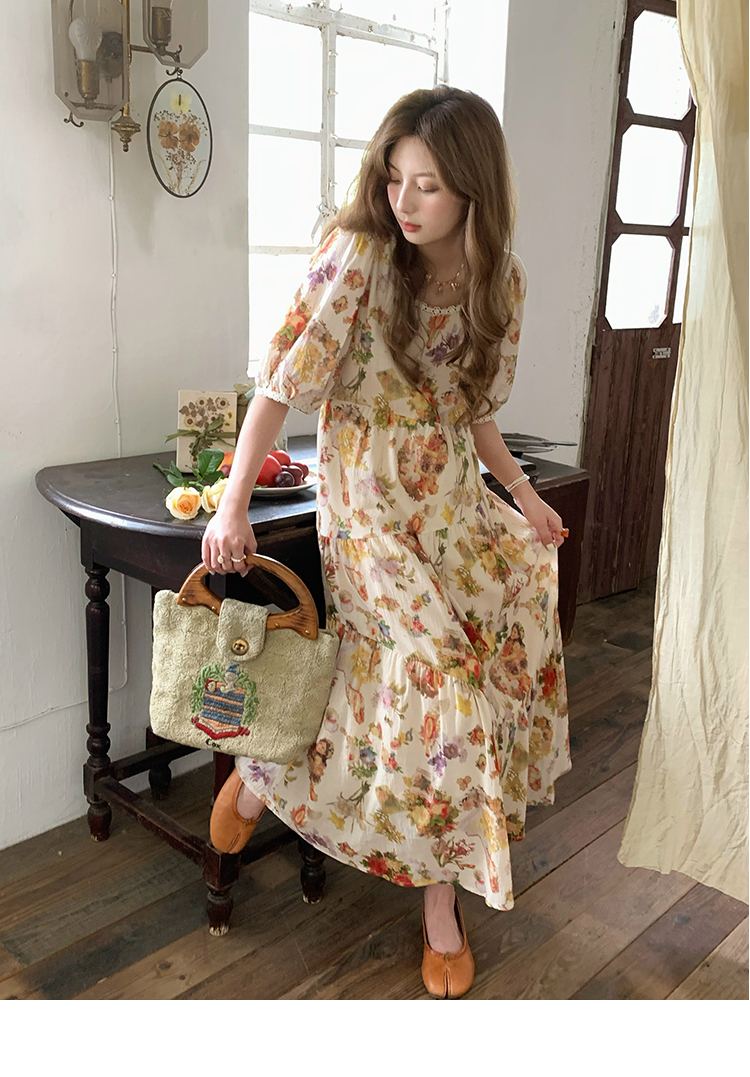 JC古著商店"天使霞光"法式復古碎花洋裝女夏泡泡袖肌理感油畫裙