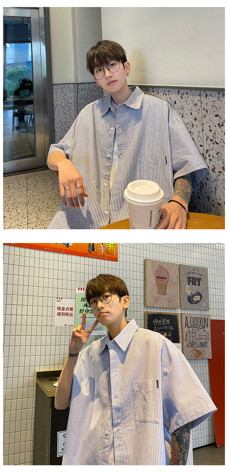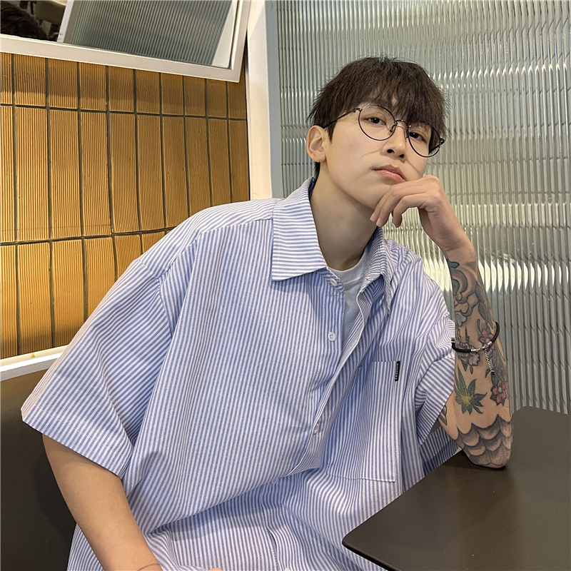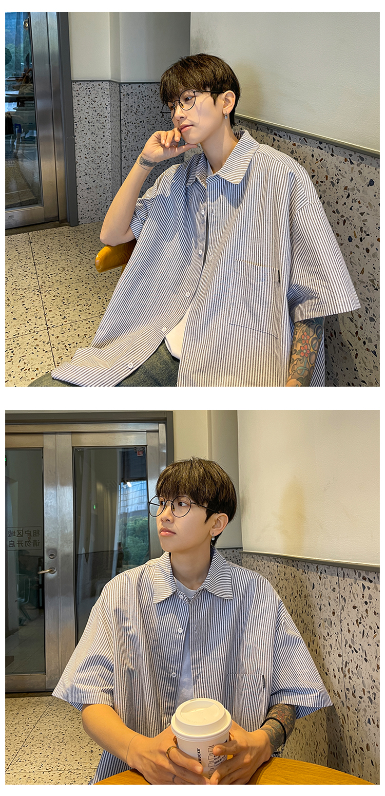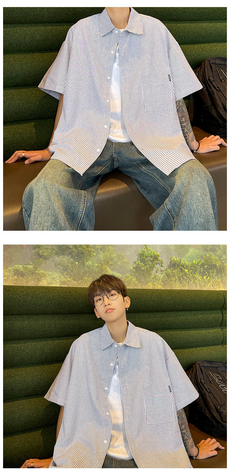 日系cityboy廓形藍色條紋襯衫夏青少年工裝襯衣oversize寬鬆外套
