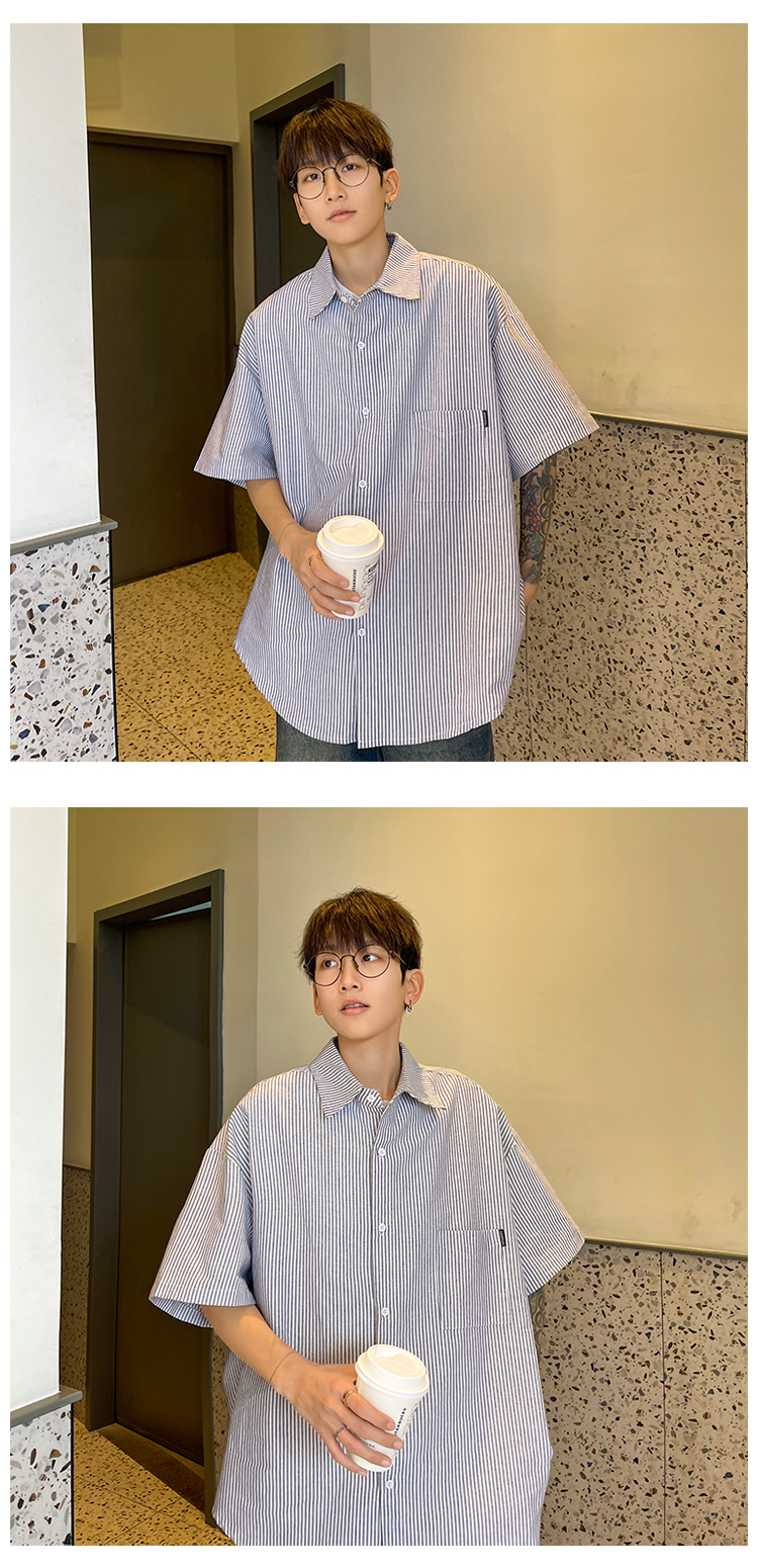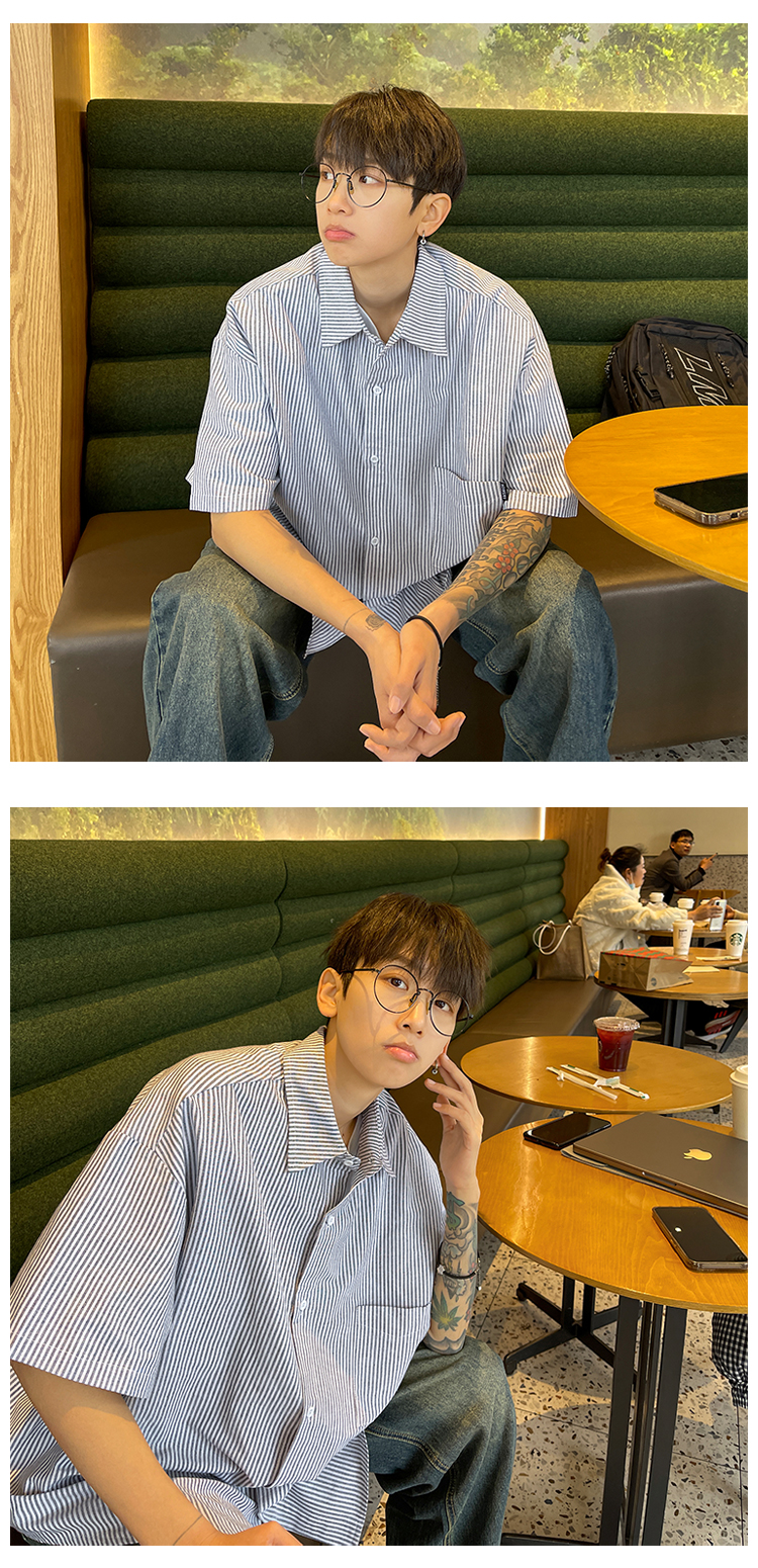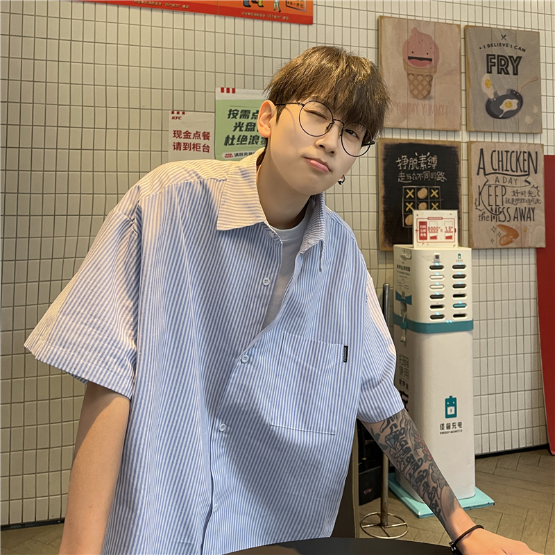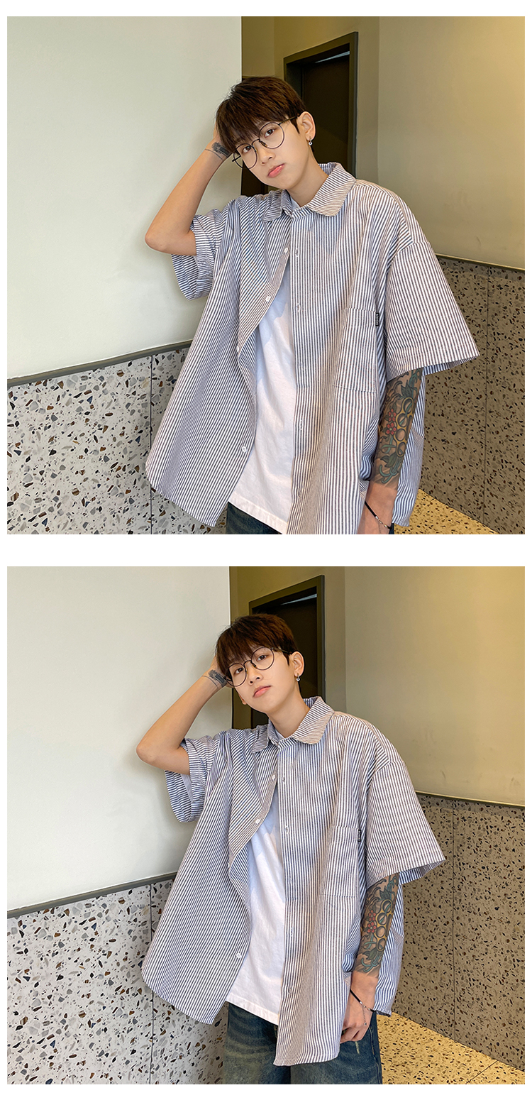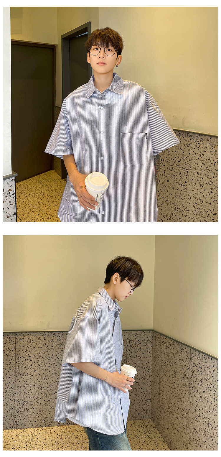日系cityboy廓形藍色條紋襯衫夏青少年工裝襯衣oversize寬鬆外套