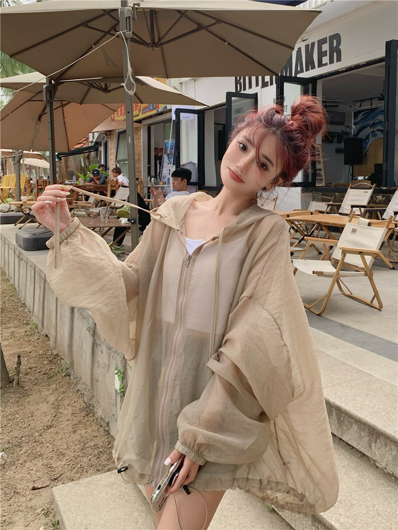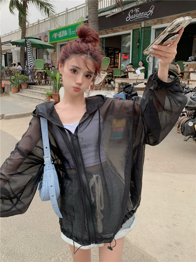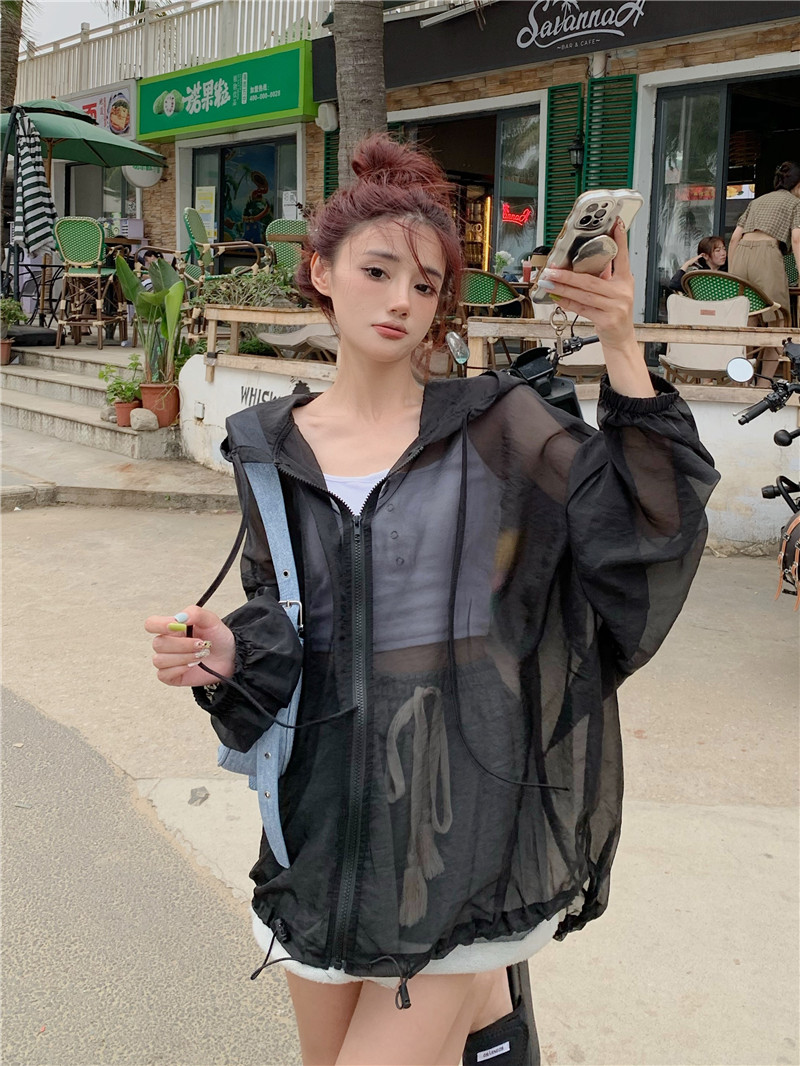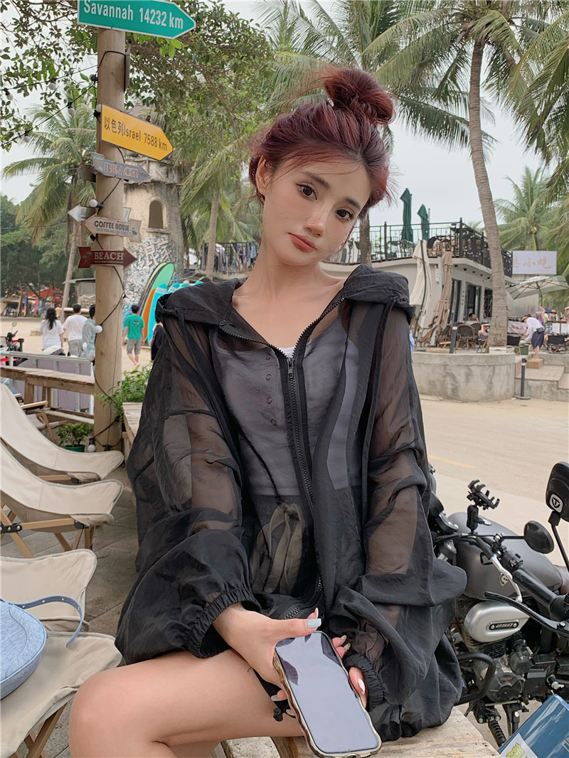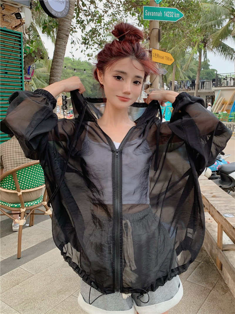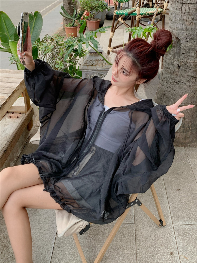 純色連帽大尺碼防曬襯衫女夏季薄款設計感小眾微透小性感個性外套潮