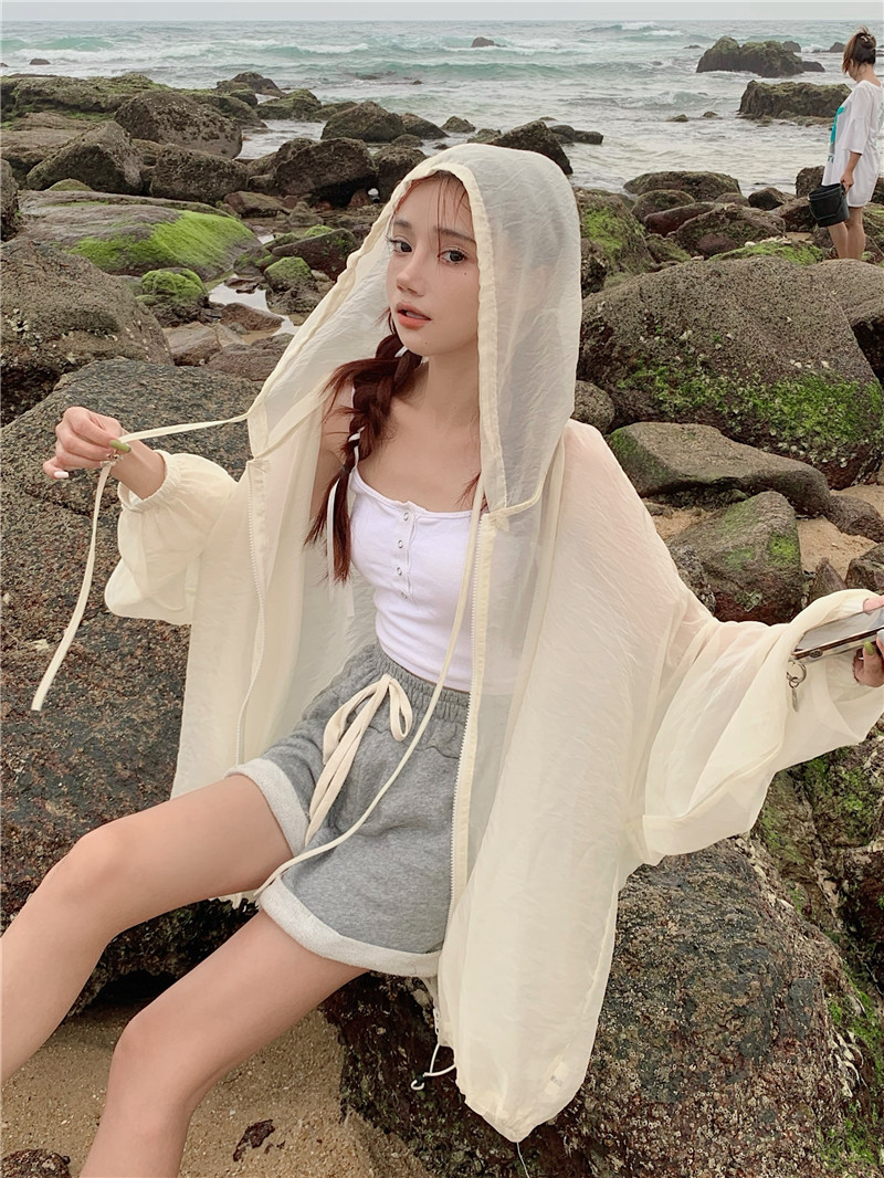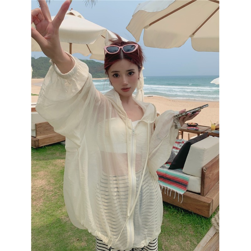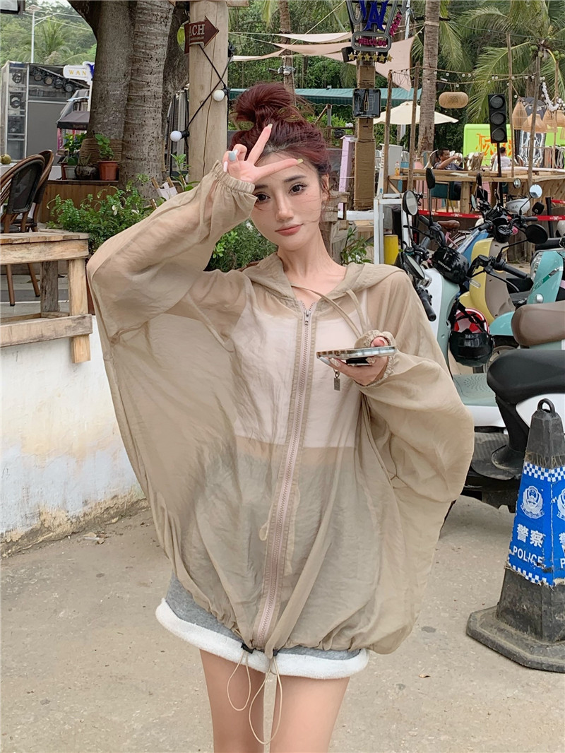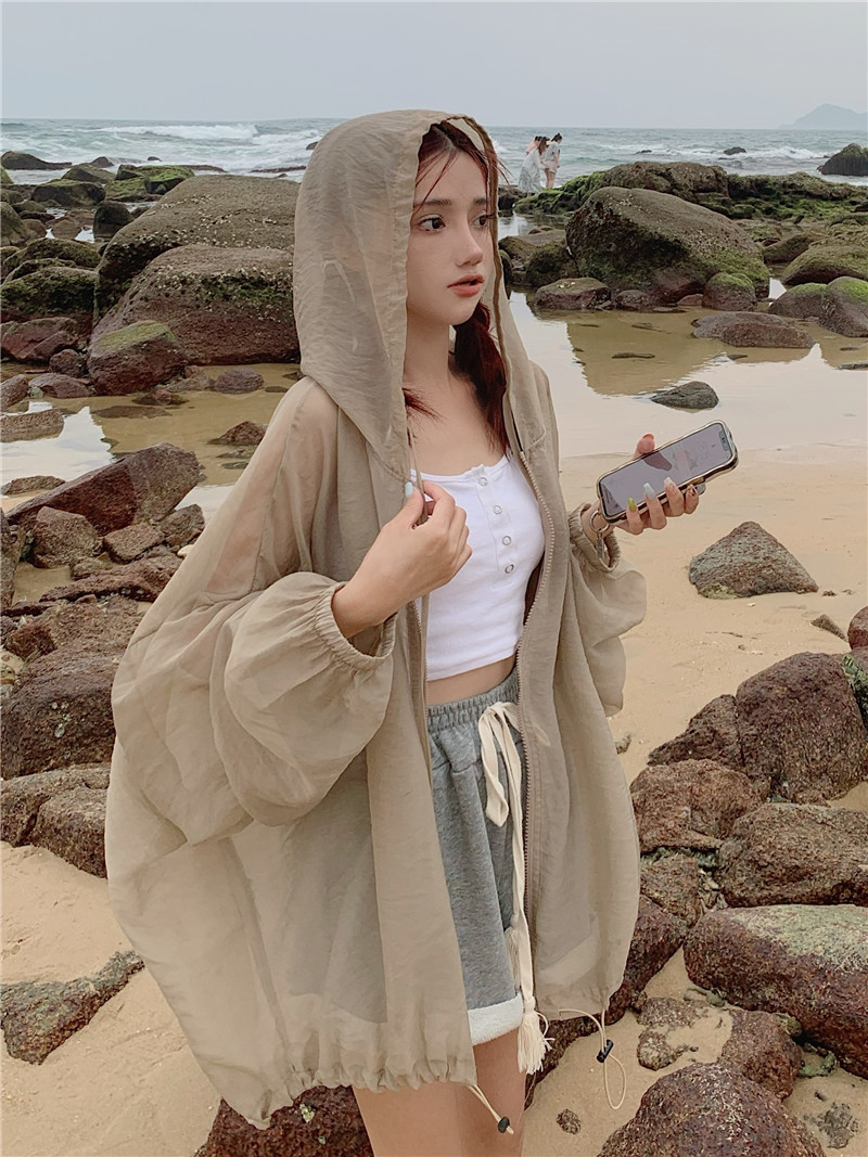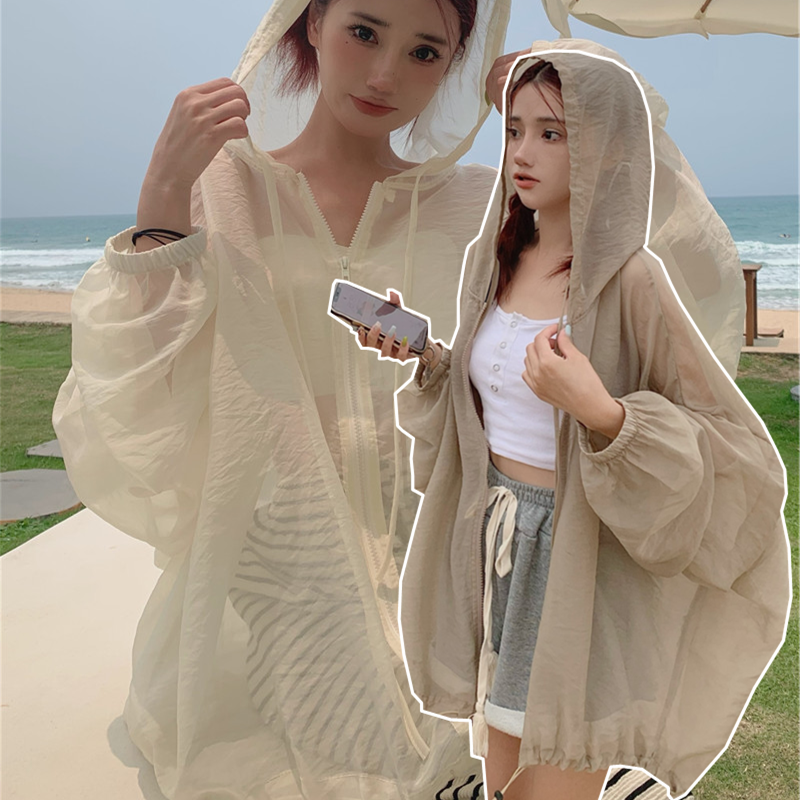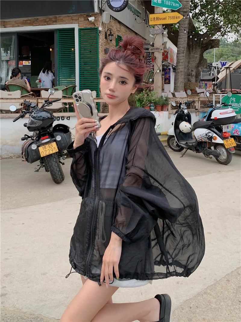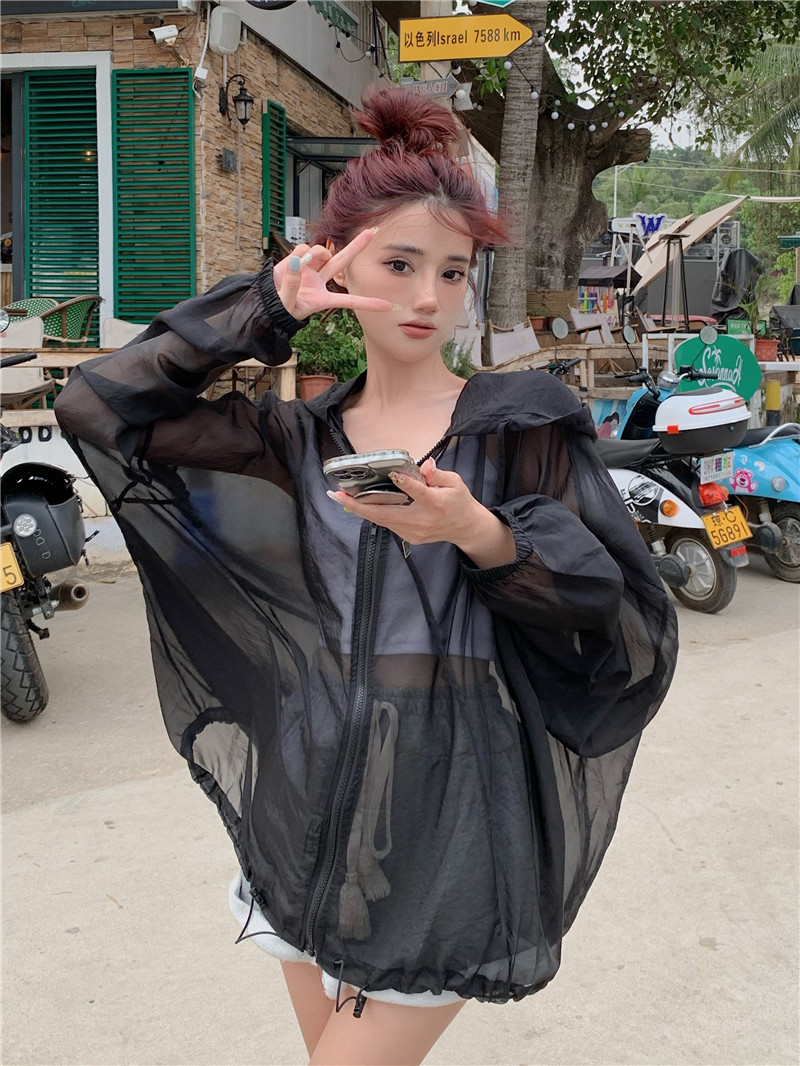 純色連帽大尺碼防曬襯衫女夏季薄款設計感小眾微透小性感個性外套潮