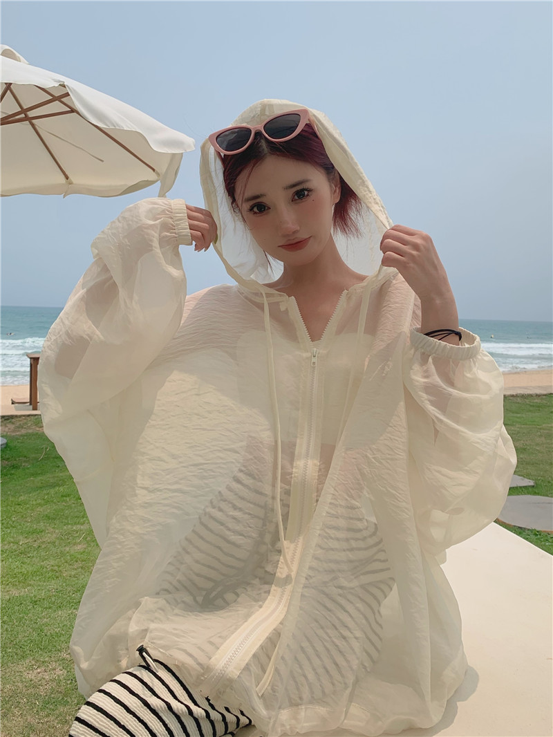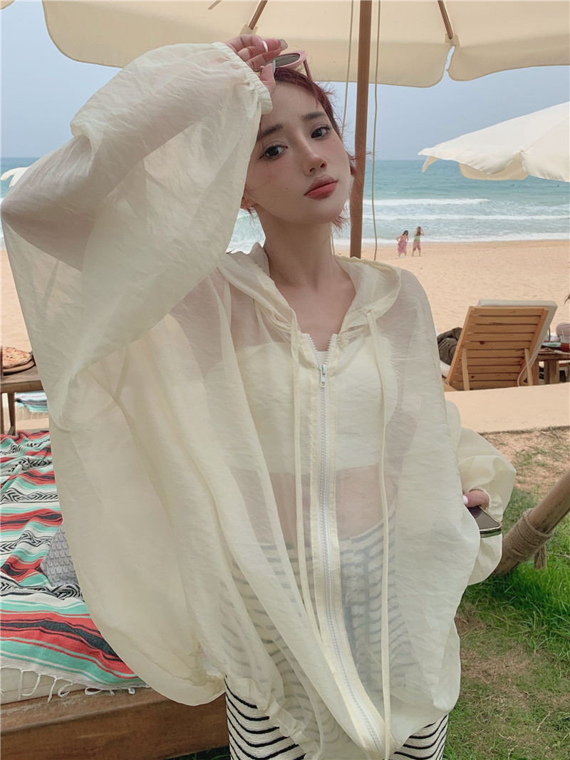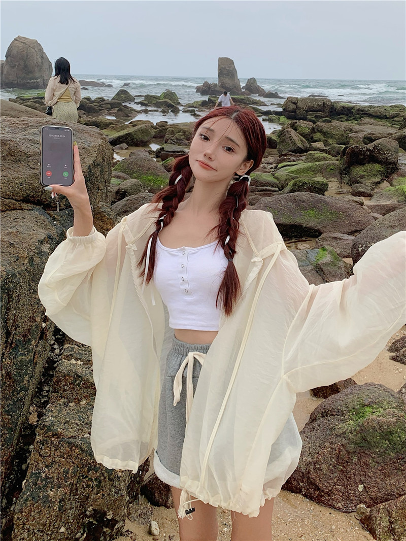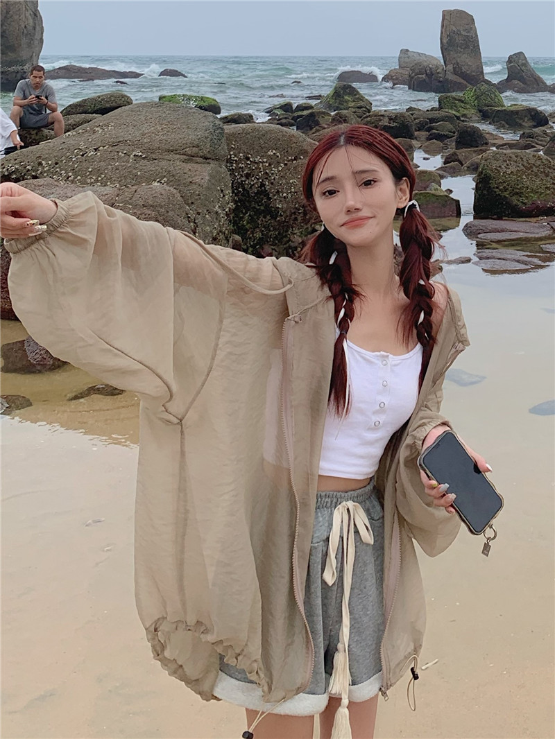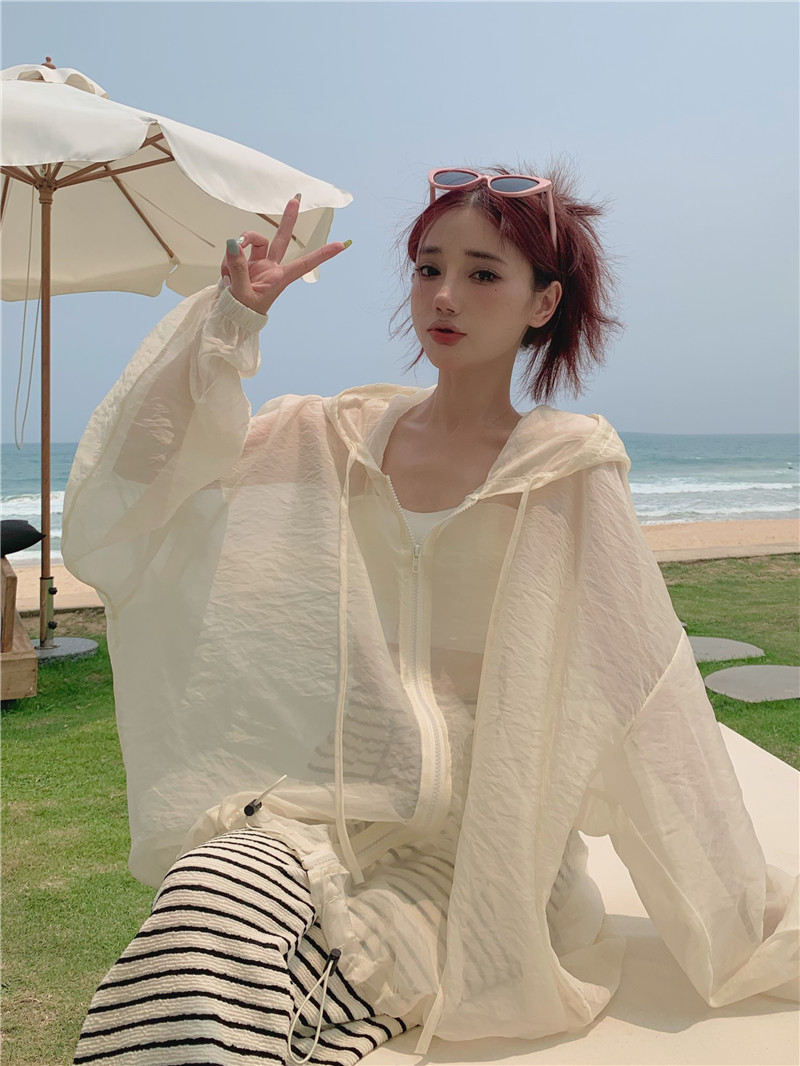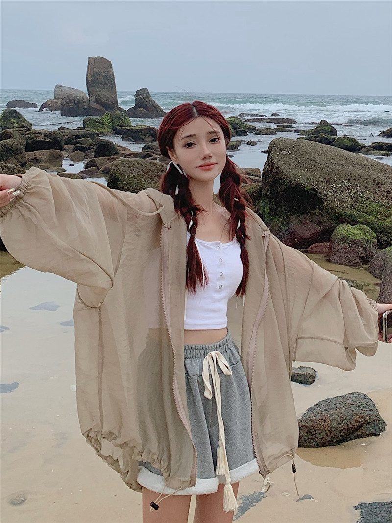 純色連帽大尺碼防曬襯衫女夏季薄款設計感小眾微透小性感個性外套潮