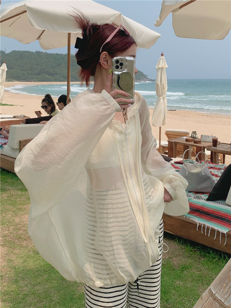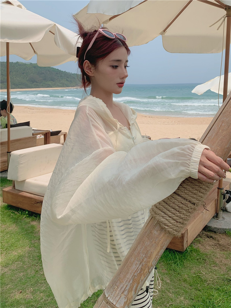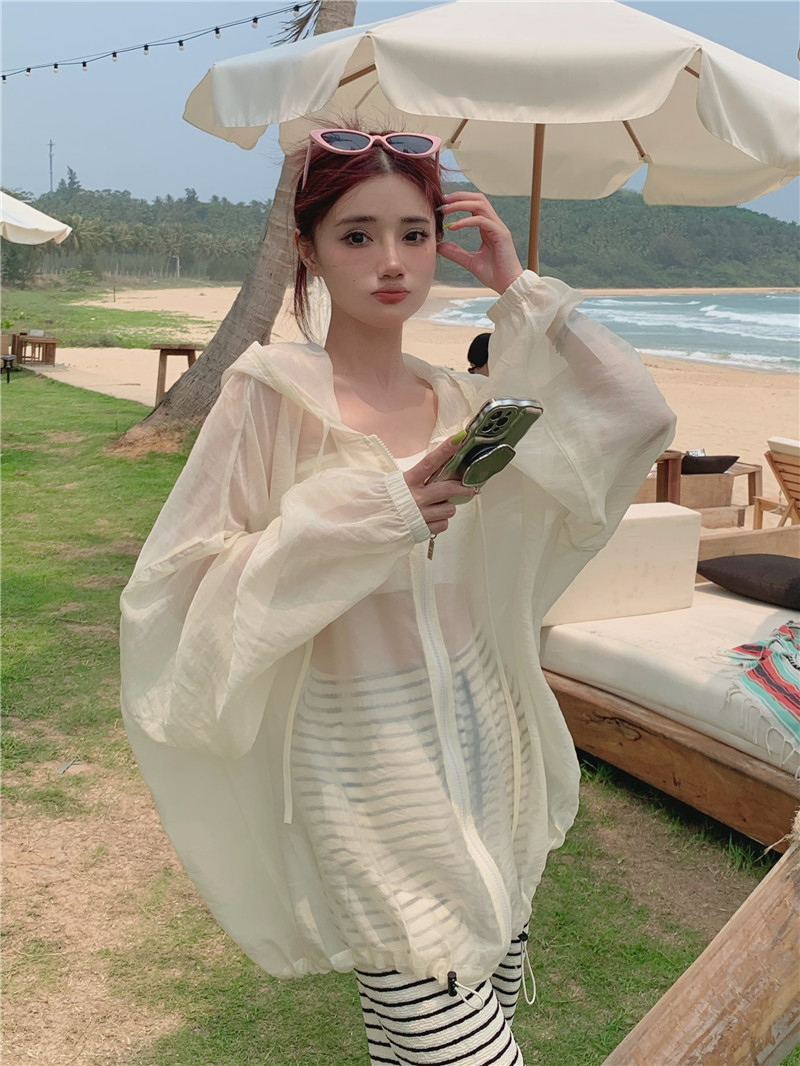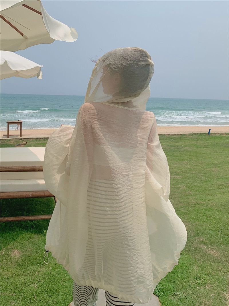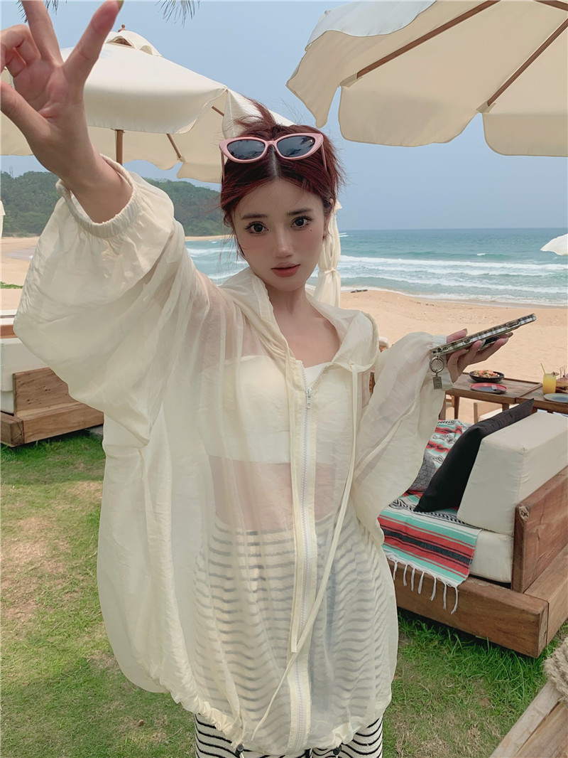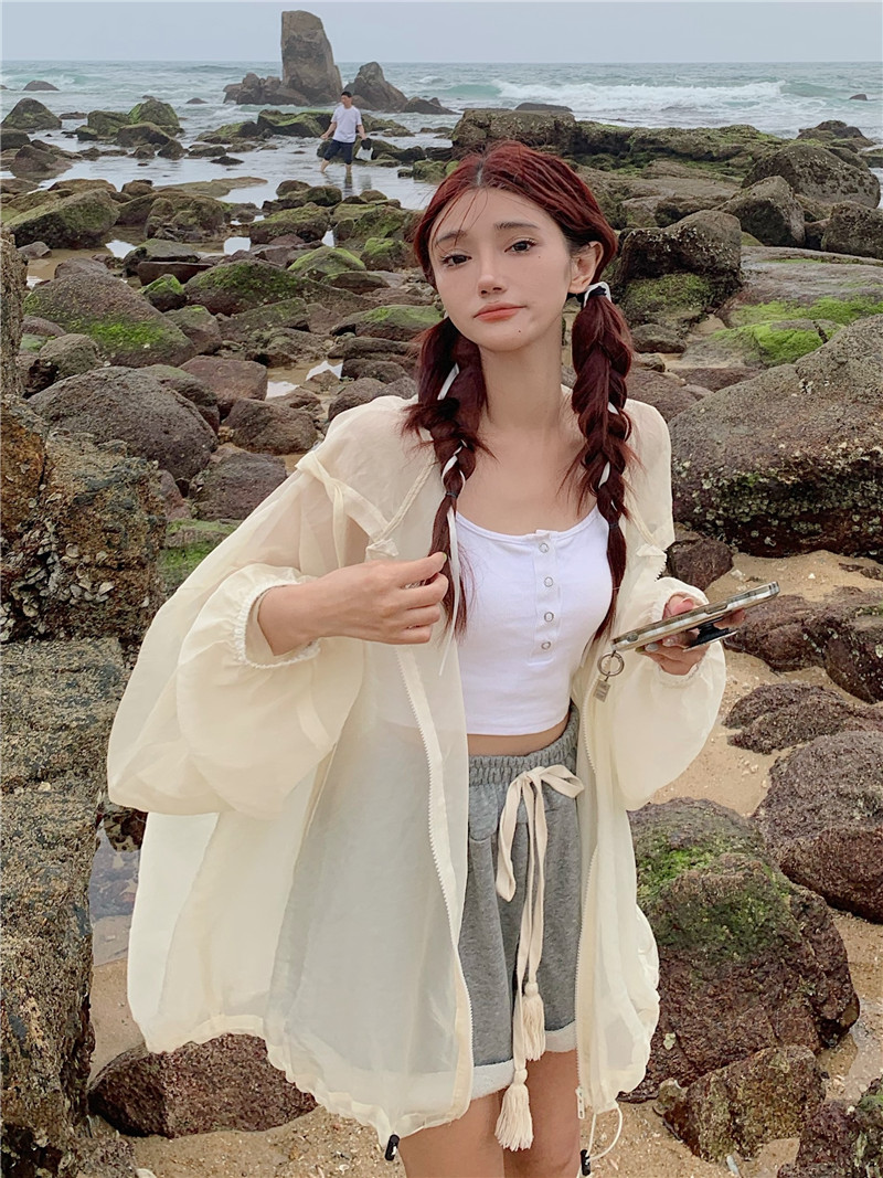 純色連帽大尺碼防曬襯衫女夏季薄款設計感小眾微透小性感個性外套潮