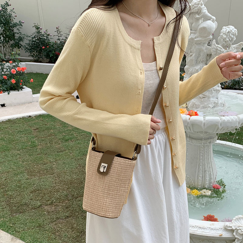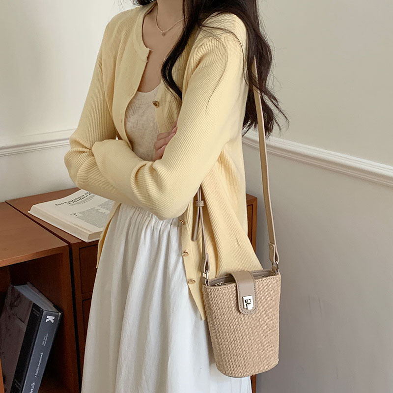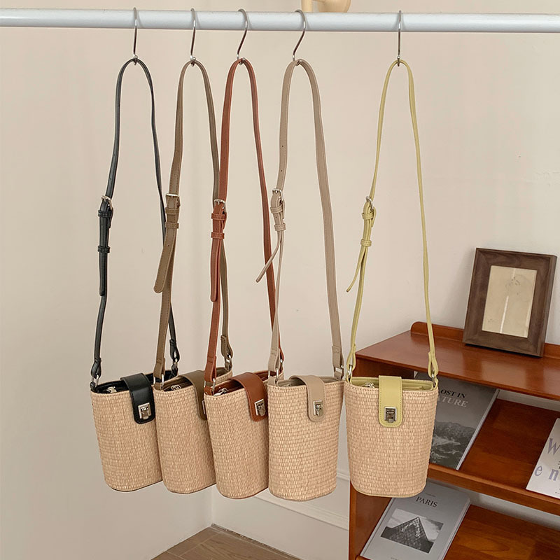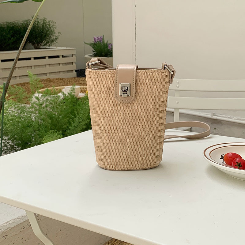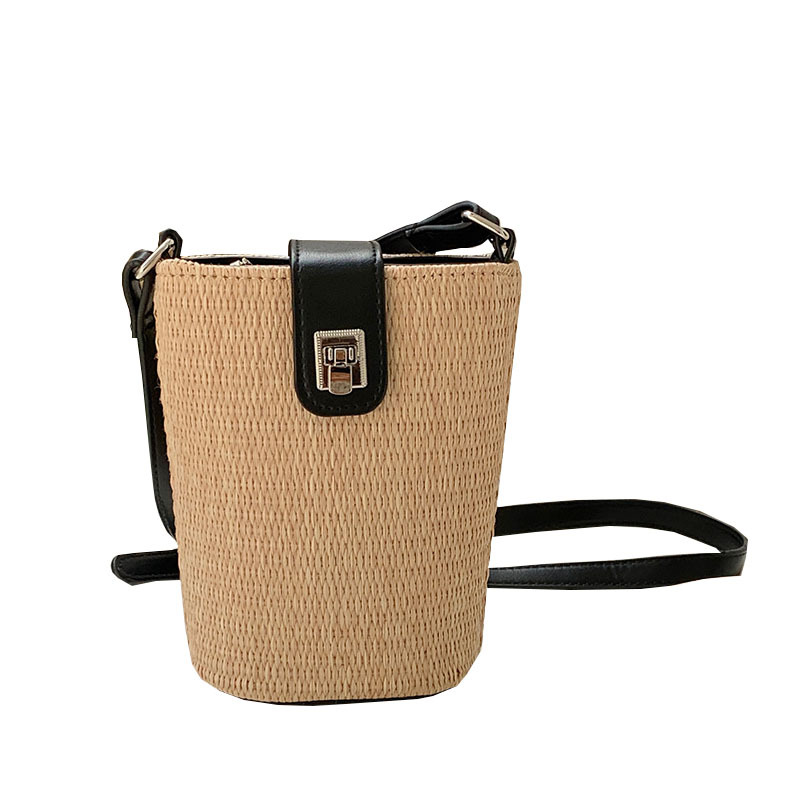 时尚复古草编斜挎水桶包包女2024新款韩版潮流休闲百搭单肩手机包